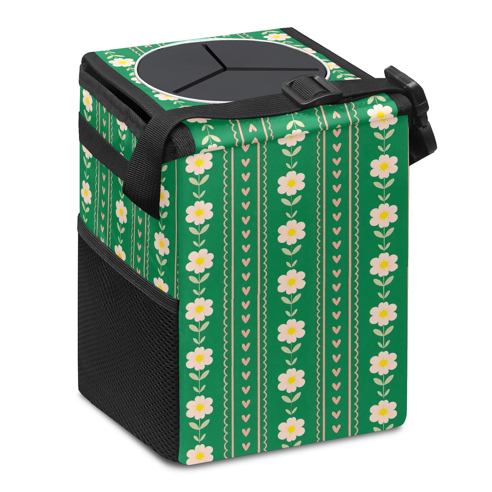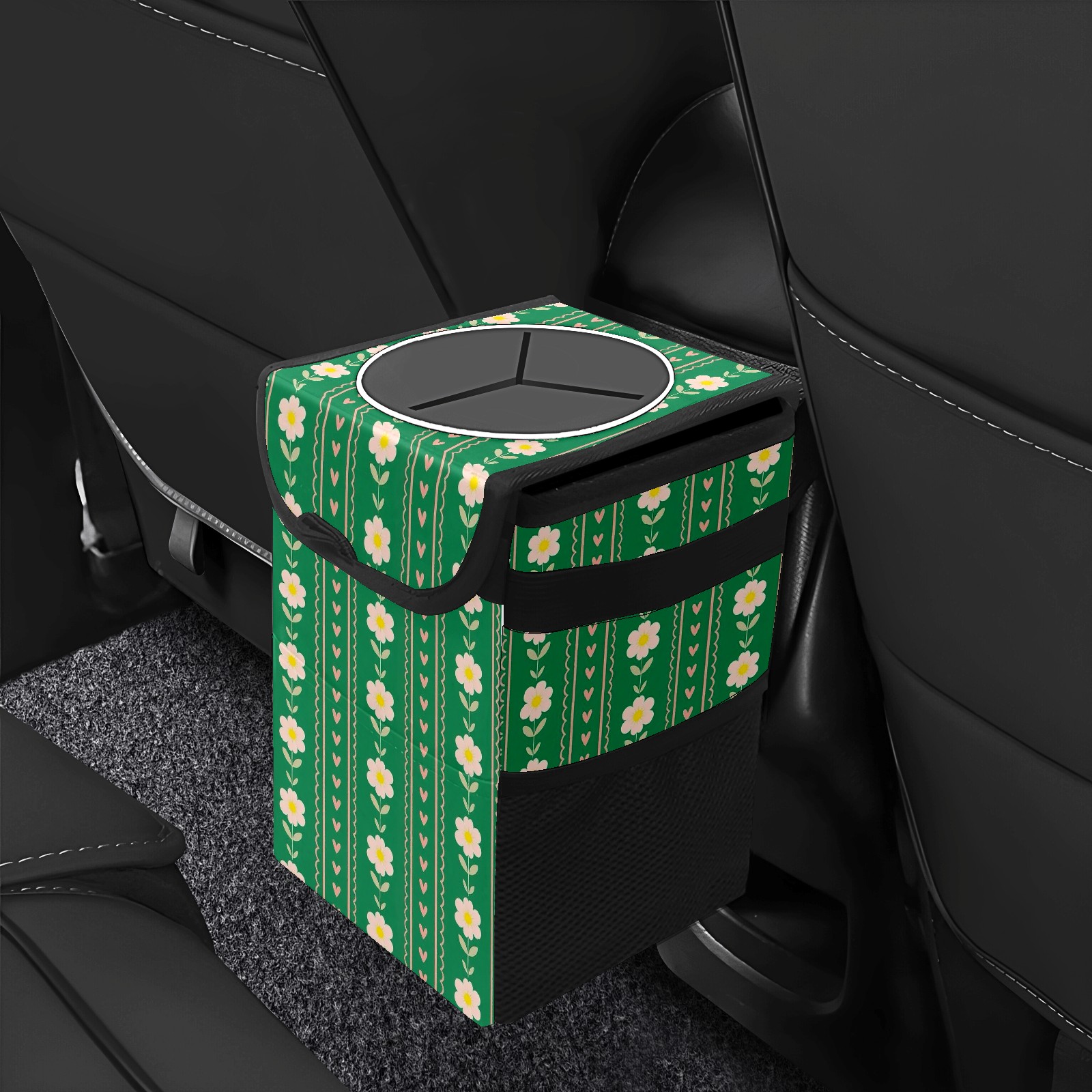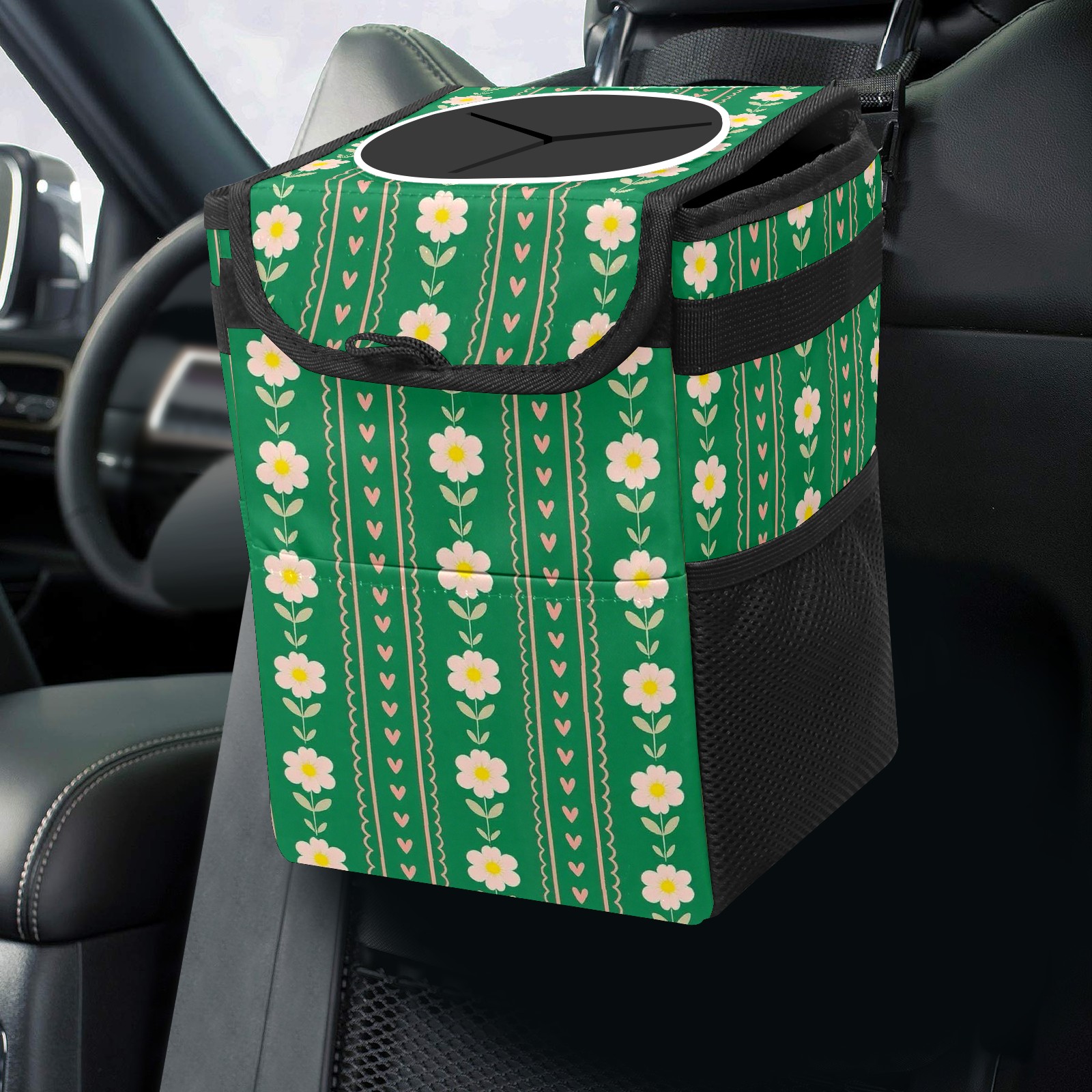 Universal Hanging Car Trash Can - Leakproof Design with Secure Lid | Fits SUV, Truck, Van | Front & Back Seat Friendly | Smart Automotive Accessory Green Flower