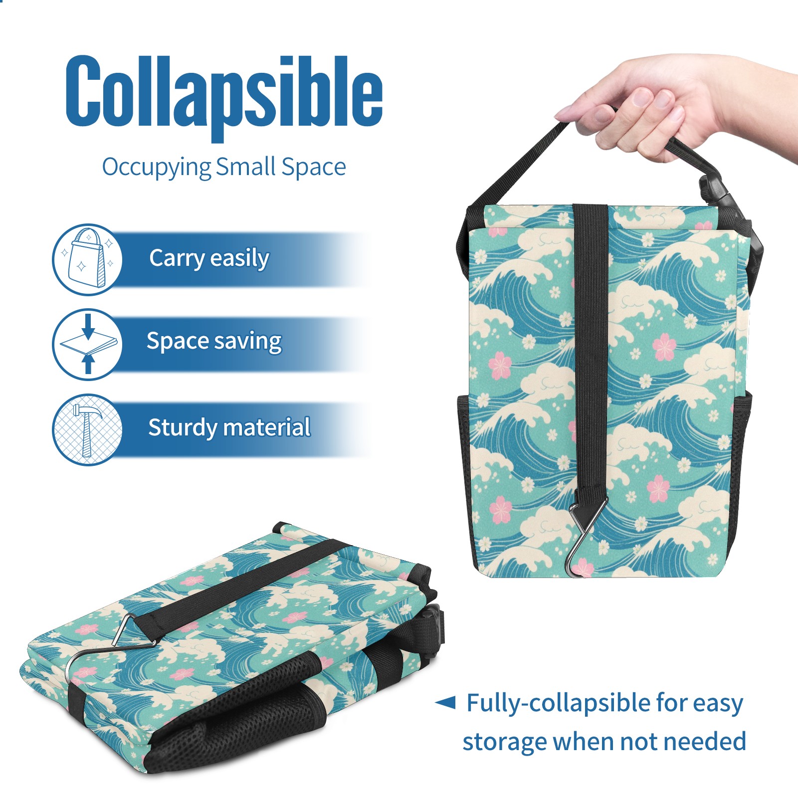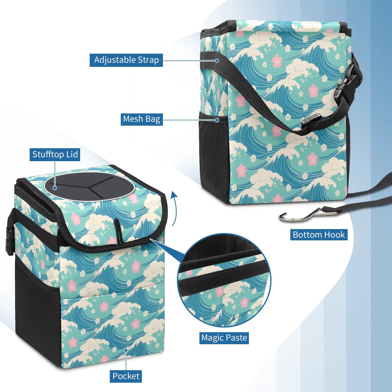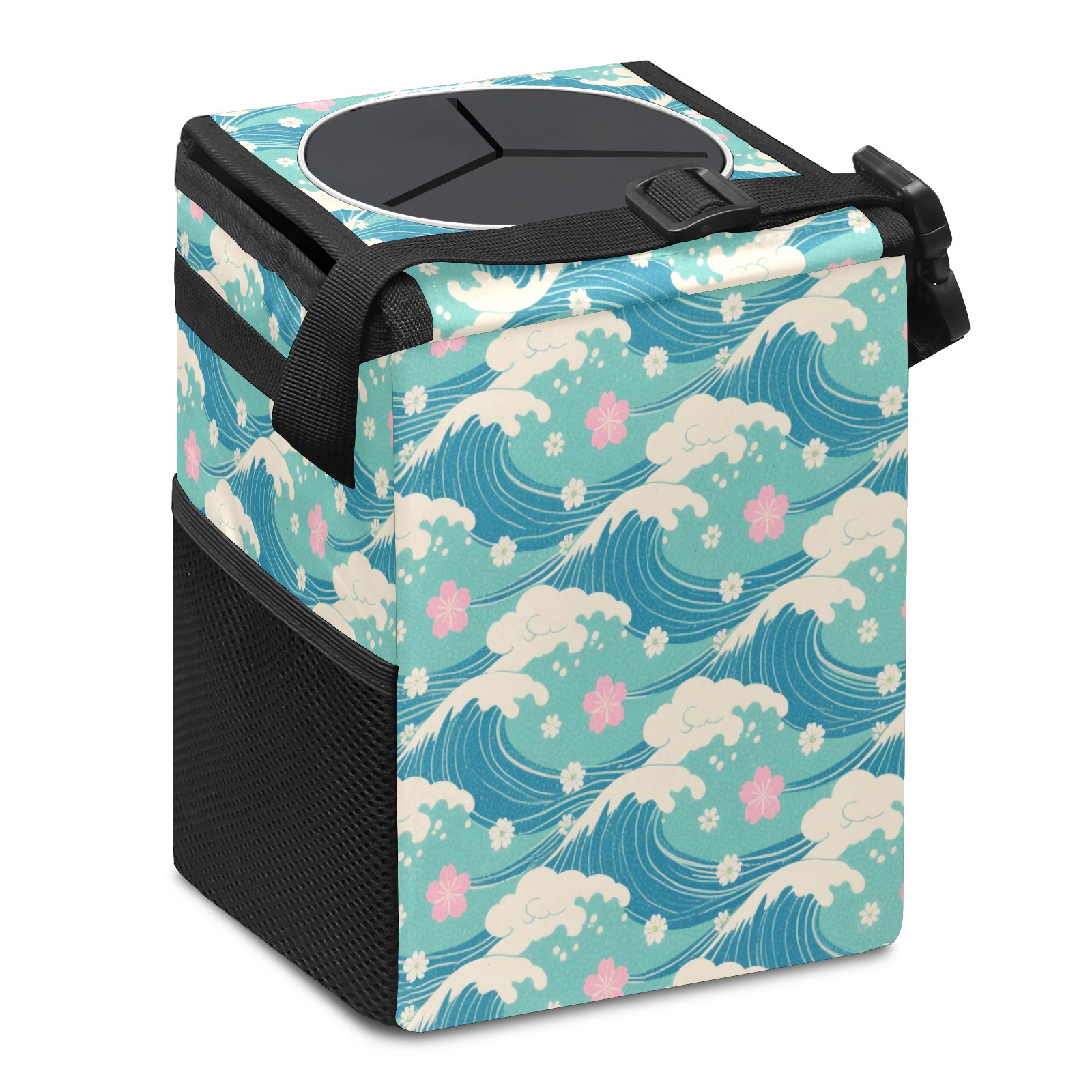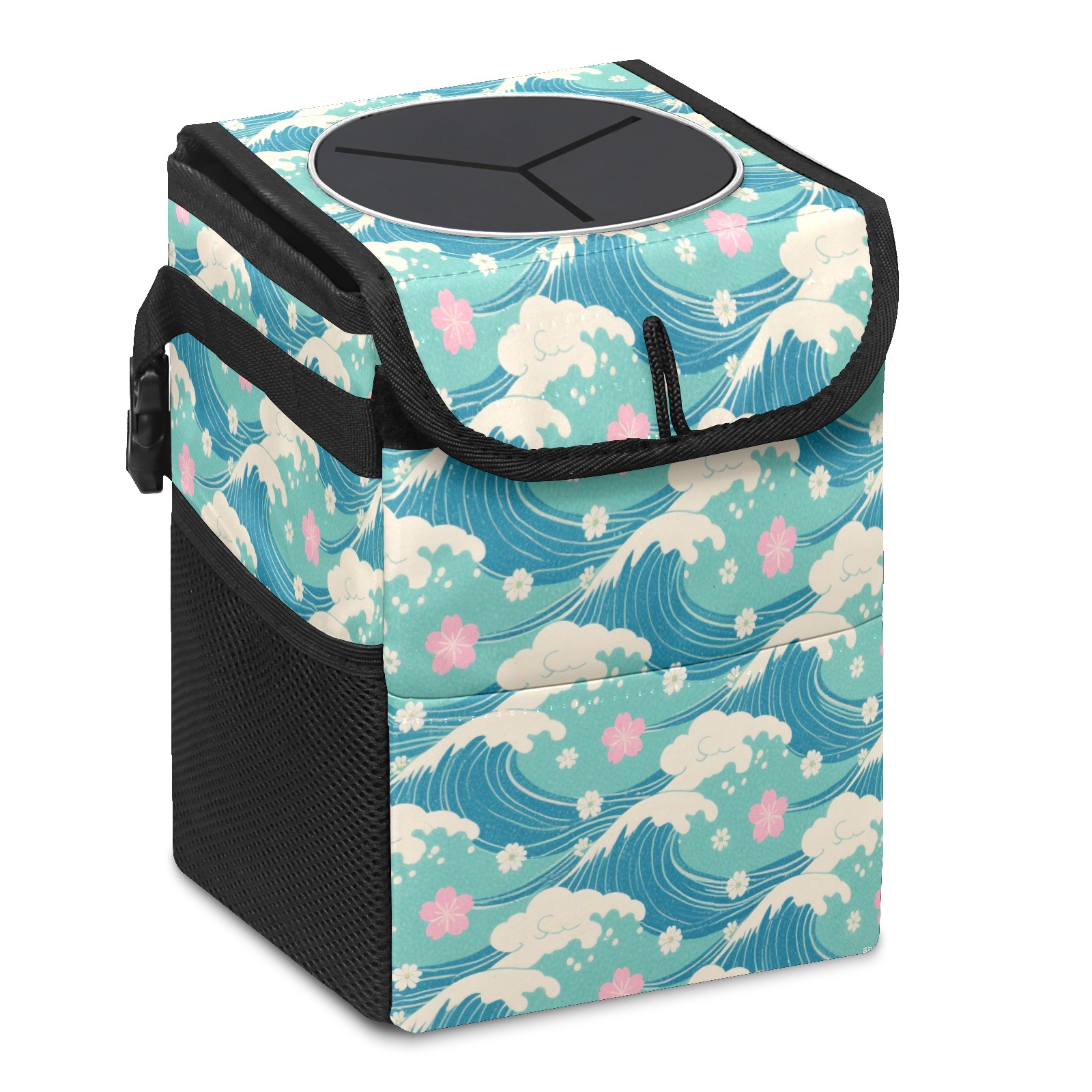 • <p>This multi-functional car trash can features a stylish printed design, combining practicality and aesthetics. Made with high-quality twill fabric and woven straps, it's sturdy and durable. Dimensions: 24×17×16cm (9.5×6.7×6.3 inches). The top rubber opening lid makes disposing of trash easy, while side mesh pockets and a front pocket easily store snacks, mobile phones, and other small items. Equipped with a dual securing system of straps and elastic hooks, it can be flexibly hung behind headrests, inside armrest boxes, or hooked to the bottom of seat cushions. Not only can it be used as a trash can, but it can also function as a food or miscellaneous item storage box, achieving multiple uses. When not in use, it can be folded for storage, saving space and creating a clean and tidy environment for your car.<br></p>