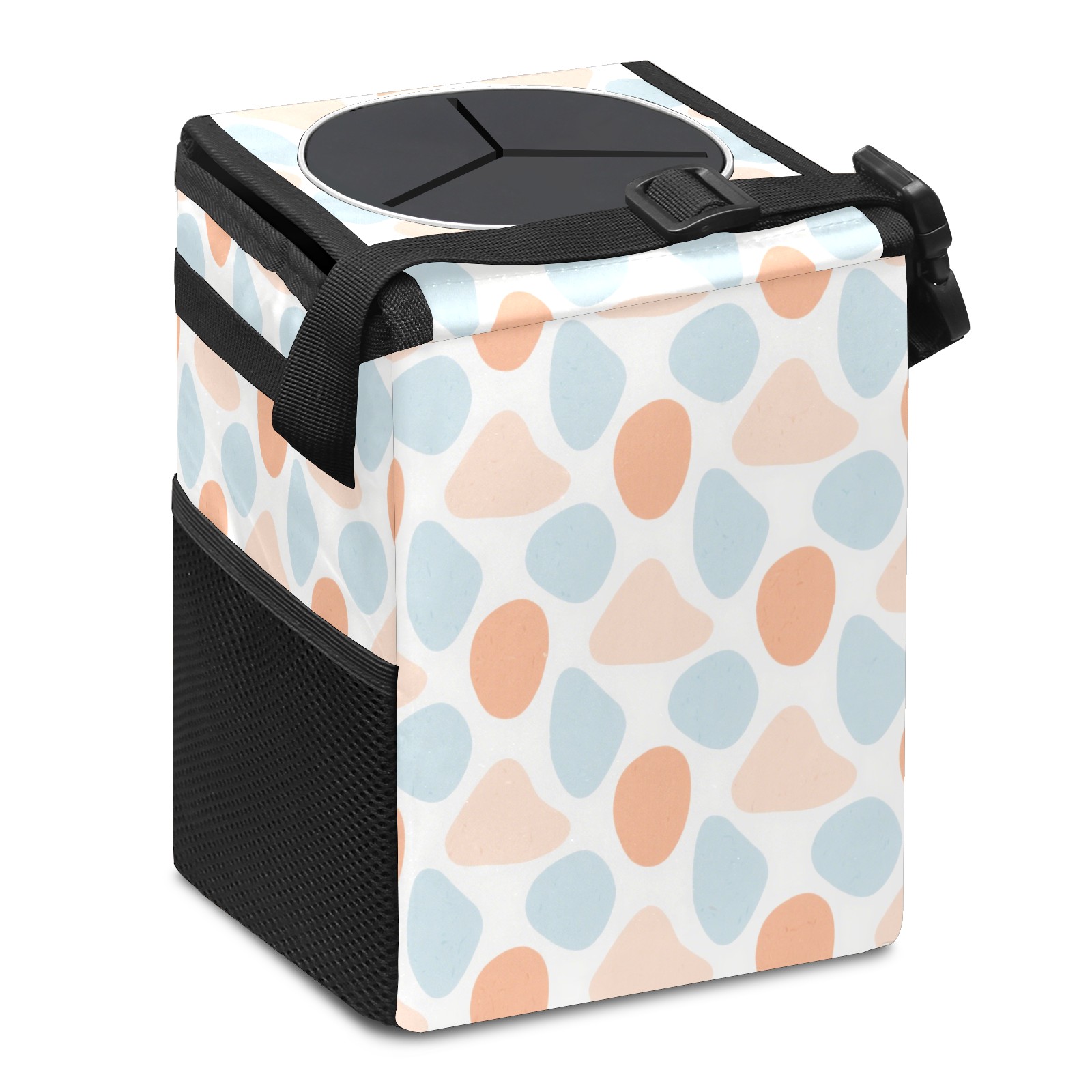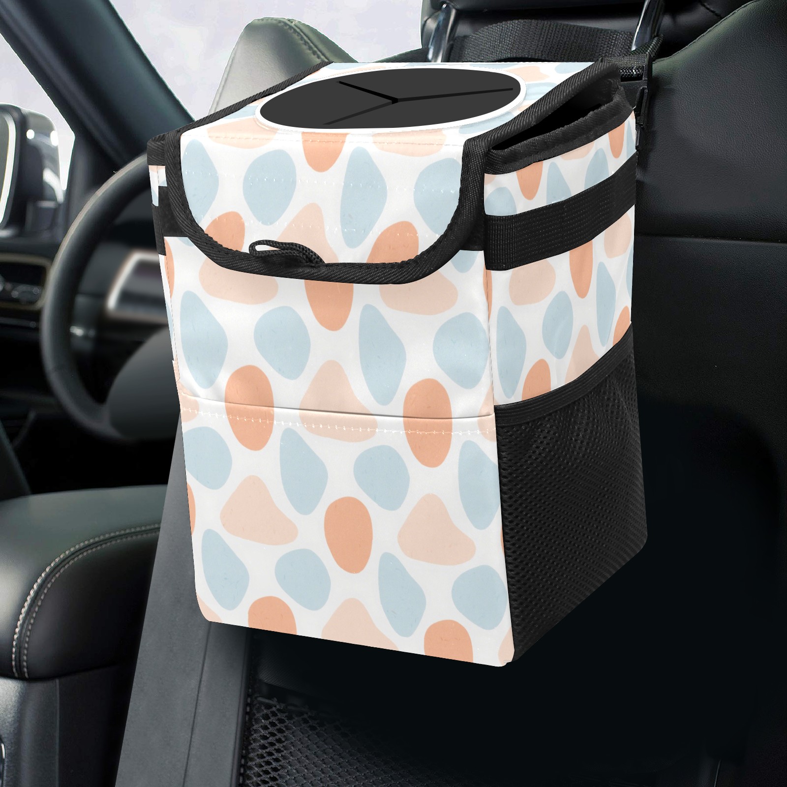 • <p>This multi-functional car trash can features a stylish printed design, combining practicality and aesthetics. Made with high-quality twill fabric and woven straps, it's sturdy and durable. Dimensions: 24×17×16cm (9.5×6.7×6.3 inches). The top rubber opening lid makes disposing of trash easy, while side mesh pockets and a front pocket easily store snacks, mobile phones, and other small items. Equipped with a dual securing system of straps and elastic hooks, it can be flexibly hung behind headrests, inside armrest boxes, or hooked to the bottom of seat cushions. Not only can it be used as a trash can, but it can also function as a food or miscellaneous item storage box, achieving multiple uses. When not in use, it can be folded for storage, saving space and creating a clean and tidy environment for your car.<br></p>