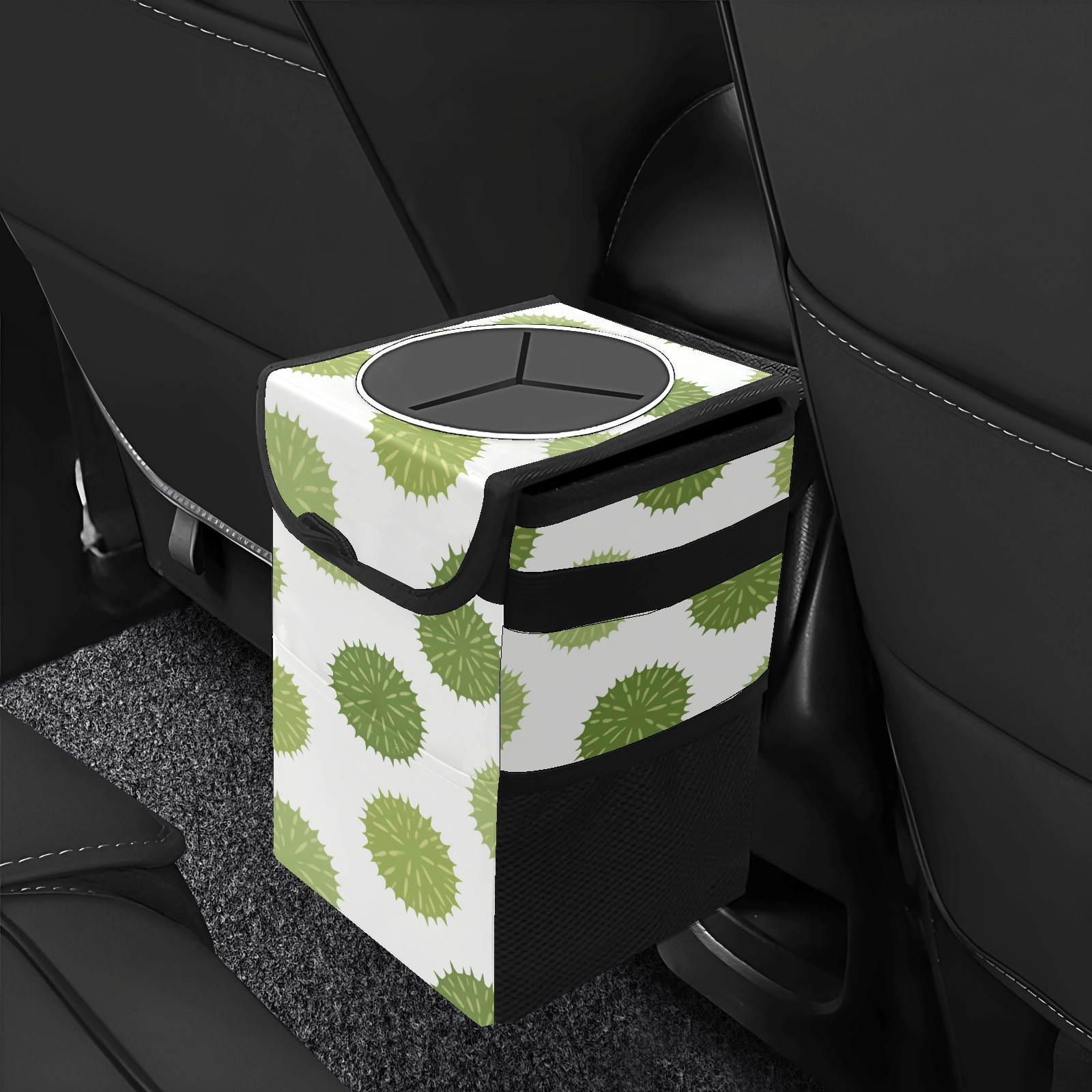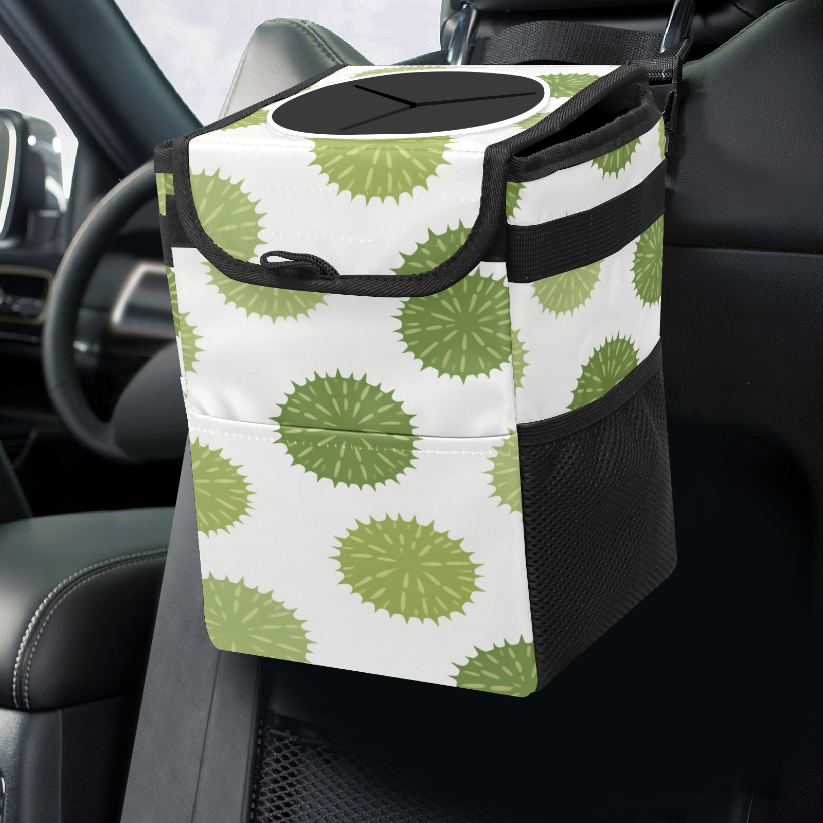 Universal Hanging Car Trash Can - Leakproof Design with Secure Lid | Fits SUV, Truck, Van | Front & Back Seat Friendly | Smart Automotive Accessory Green Plants Pattern