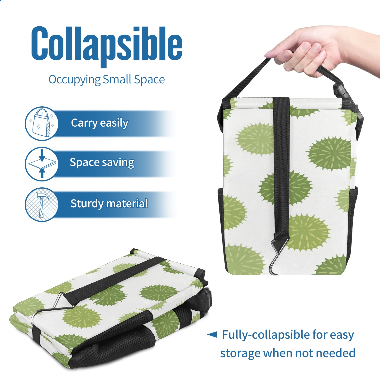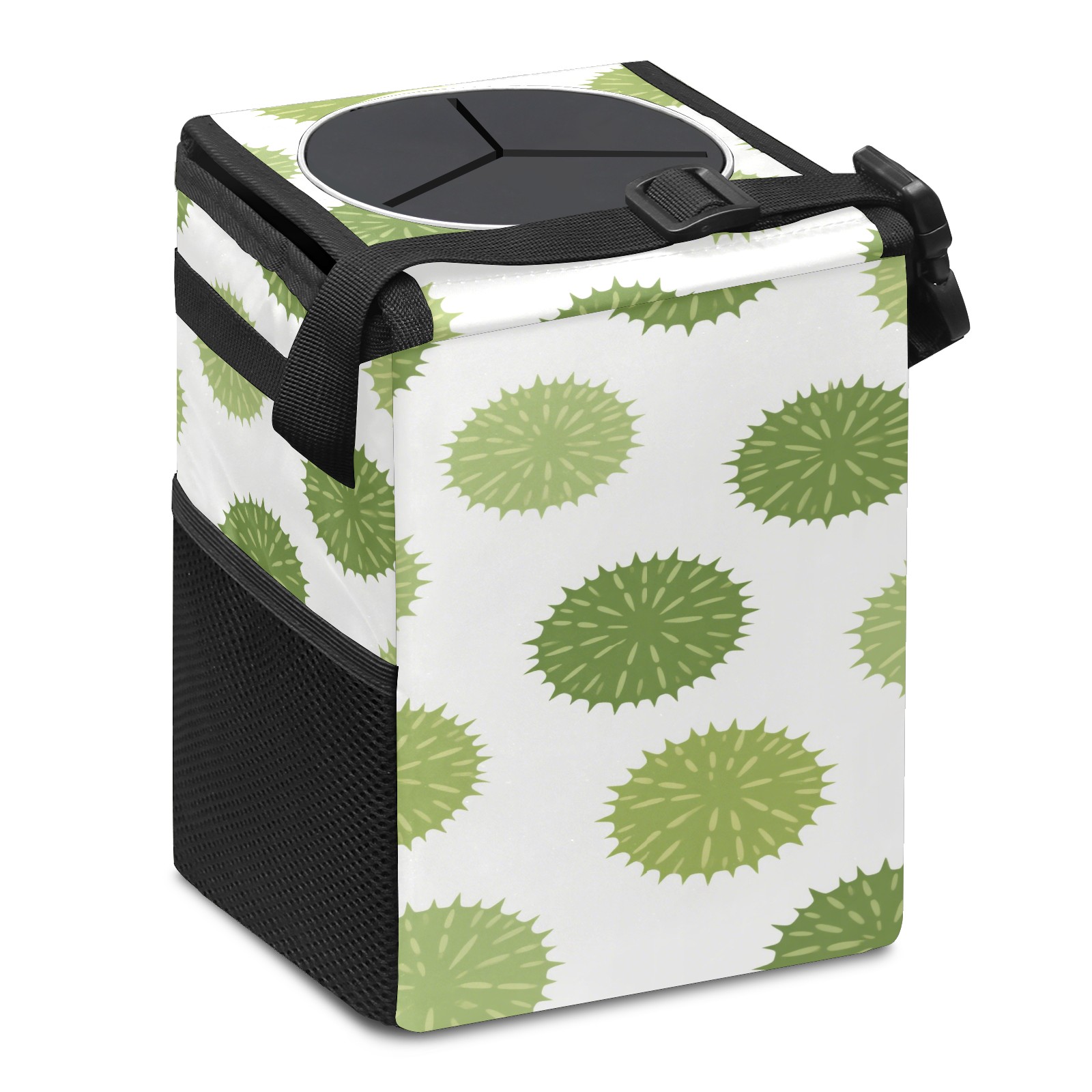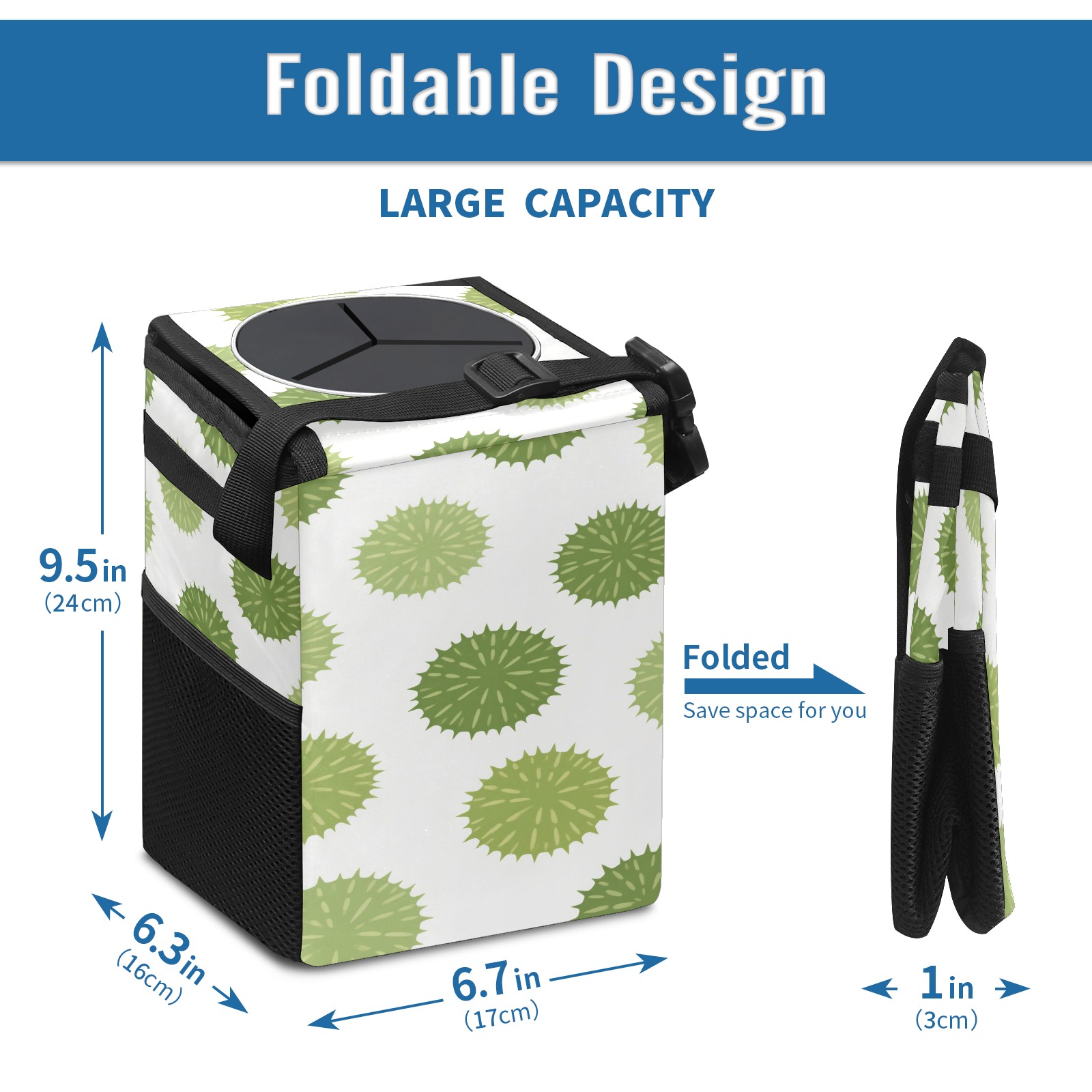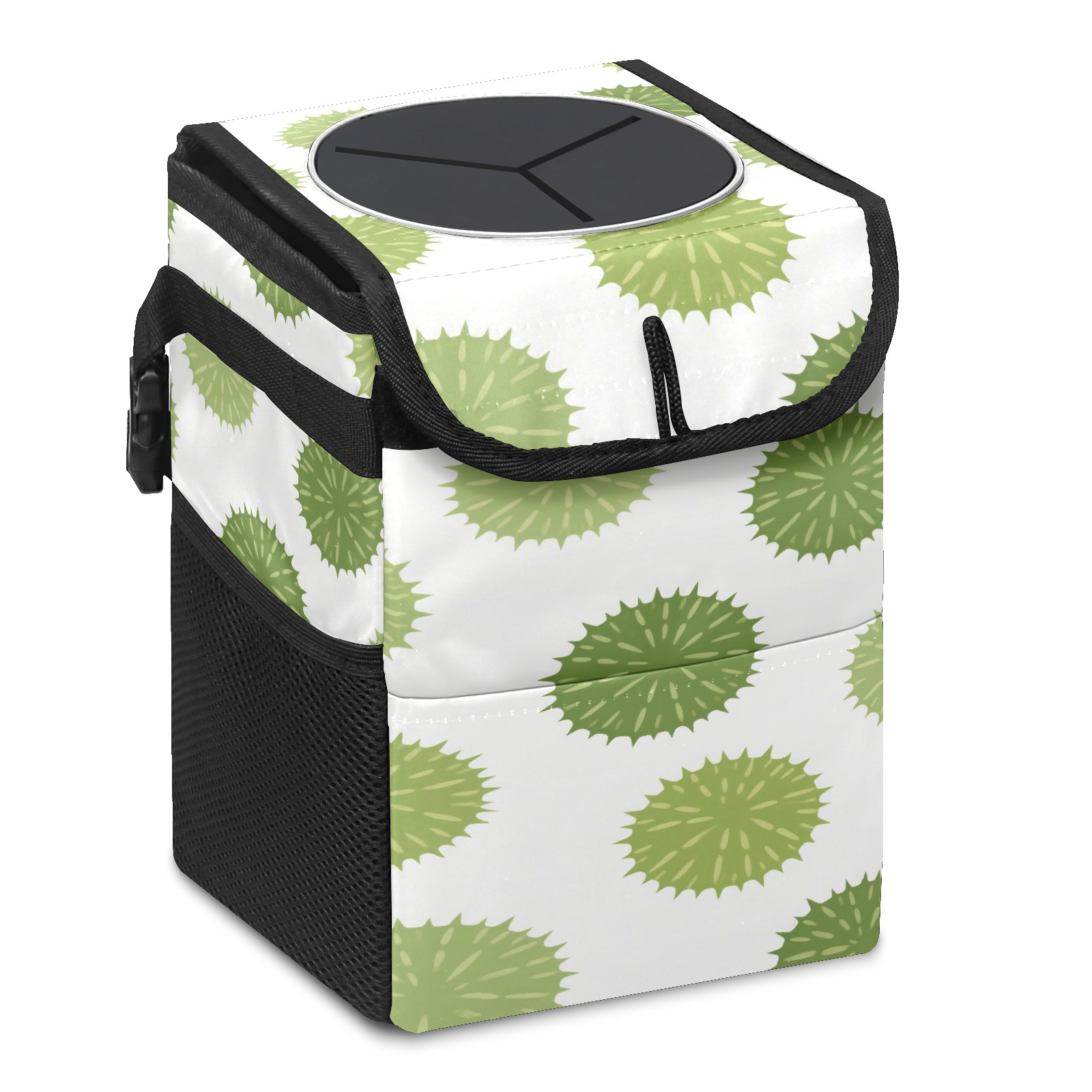 • <p>This multi-functional car trash can features a stylish printed design, combining practicality and aesthetics. Made with high-quality twill fabric and woven straps, it's sturdy and durable. Dimensions: 24×17×16cm (9.5×6.7×6.3 inches). The top rubber opening lid makes disposing of trash easy, while side mesh pockets and a front pocket easily store snacks, mobile phones, and other small items. Equipped with a dual securing system of straps and elastic hooks, it can be flexibly hung behind headrests, inside armrest boxes, or hooked to the bottom of seat cushions. Not only can it be used as a trash can, but it can also function as a food or miscellaneous item storage box, achieving multiple uses. When not in use, it can be folded for storage, saving space and creating a clean and tidy environment for your car.<br></p>
