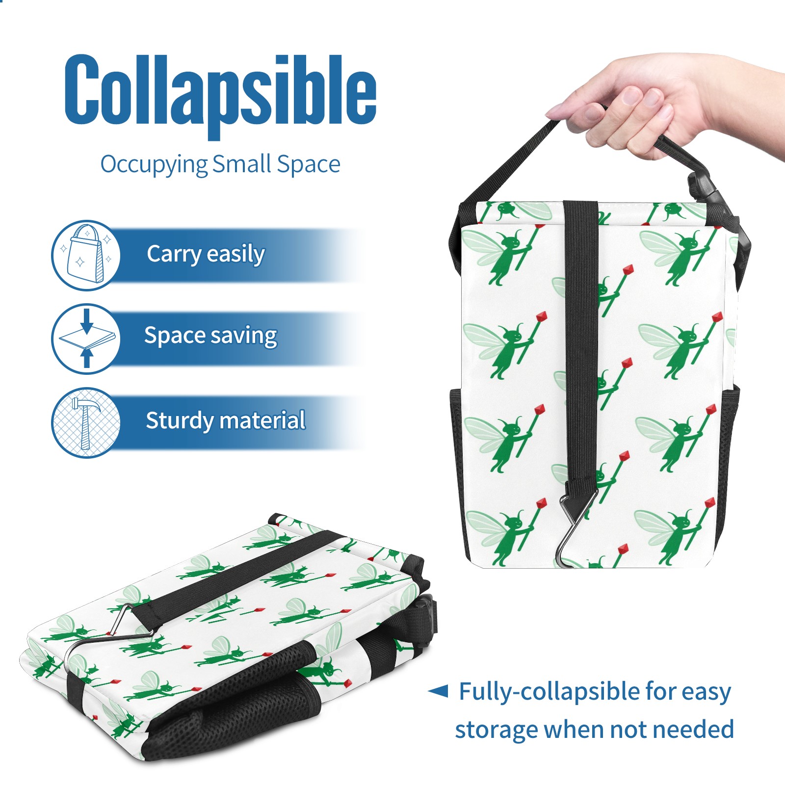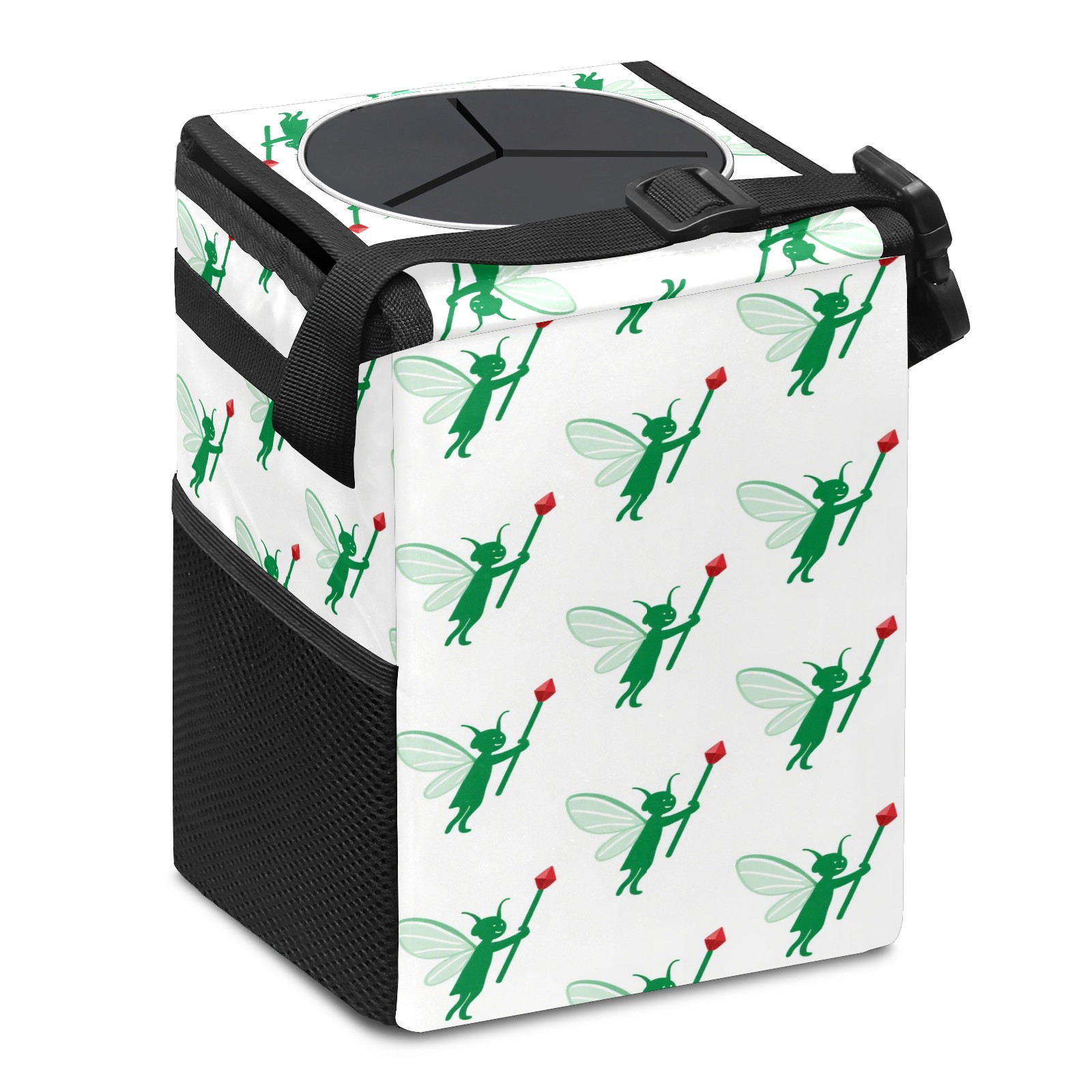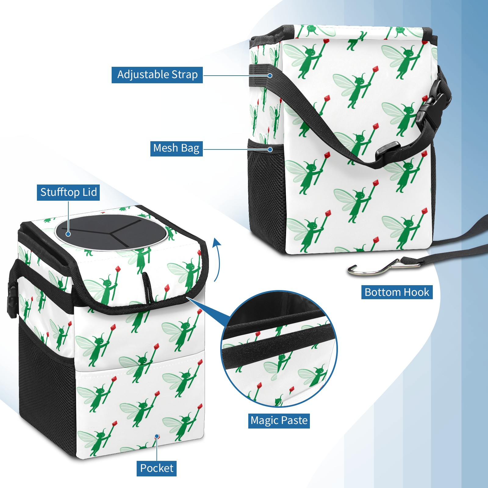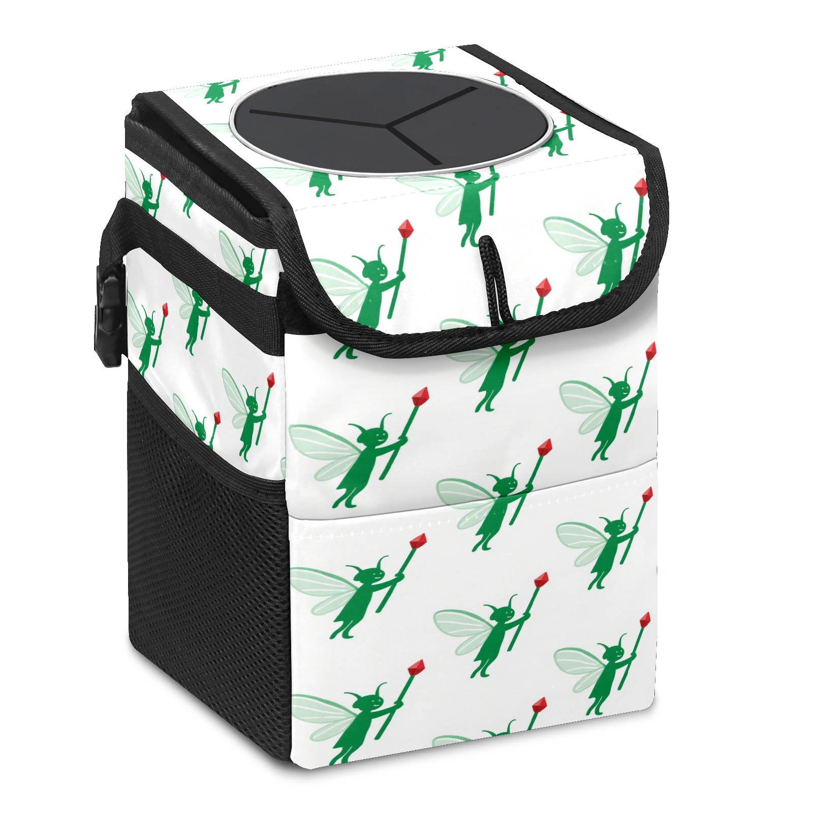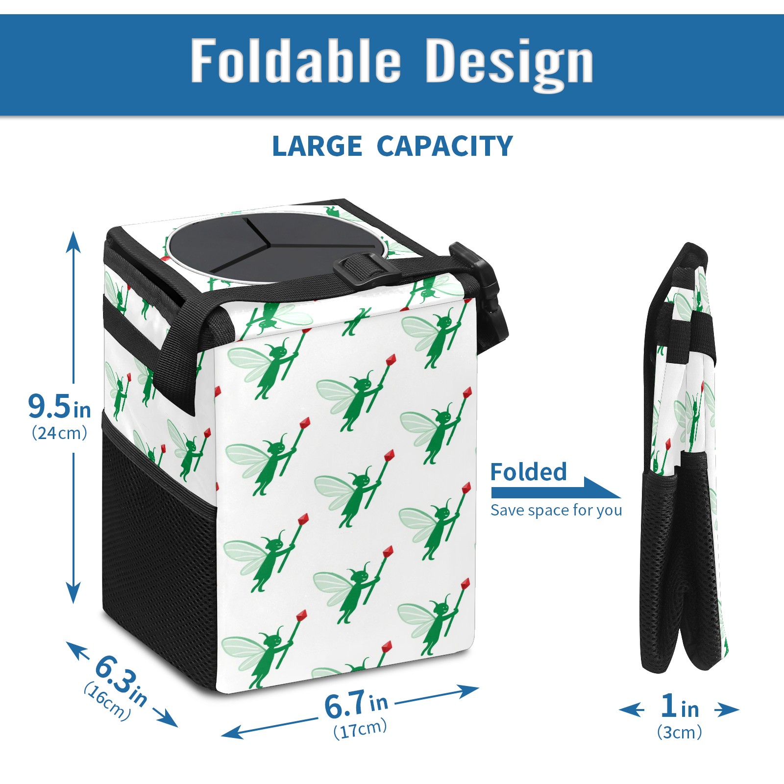 • <p>This multi-functional car trash can features a stylish printed design, combining practicality and aesthetics. Made with high-quality twill fabric and woven straps, it's sturdy and durable. Dimensions: 24×17×16cm (9.5×6.7×6.3 inches). The top rubber opening lid makes disposing of trash easy, while side mesh pockets and a front pocket easily store snacks, mobile phones, and other small items. Equipped with a dual securing system of straps and elastic hooks, it can be flexibly hung behind headrests, inside armrest boxes, or hooked to the bottom of seat cushions. Not only can it be used as a trash can, but it can also function as a food or miscellaneous item storage box, achieving multiple uses. When not in use, it can be folded for storage, saving space and creating a clean and tidy environment for your car.<br></p>