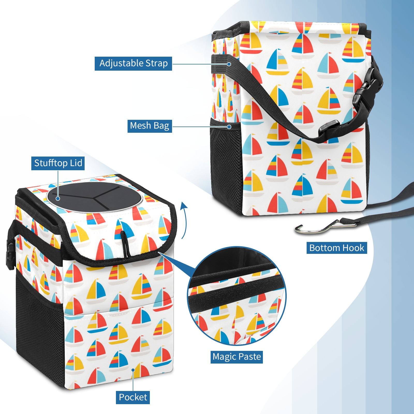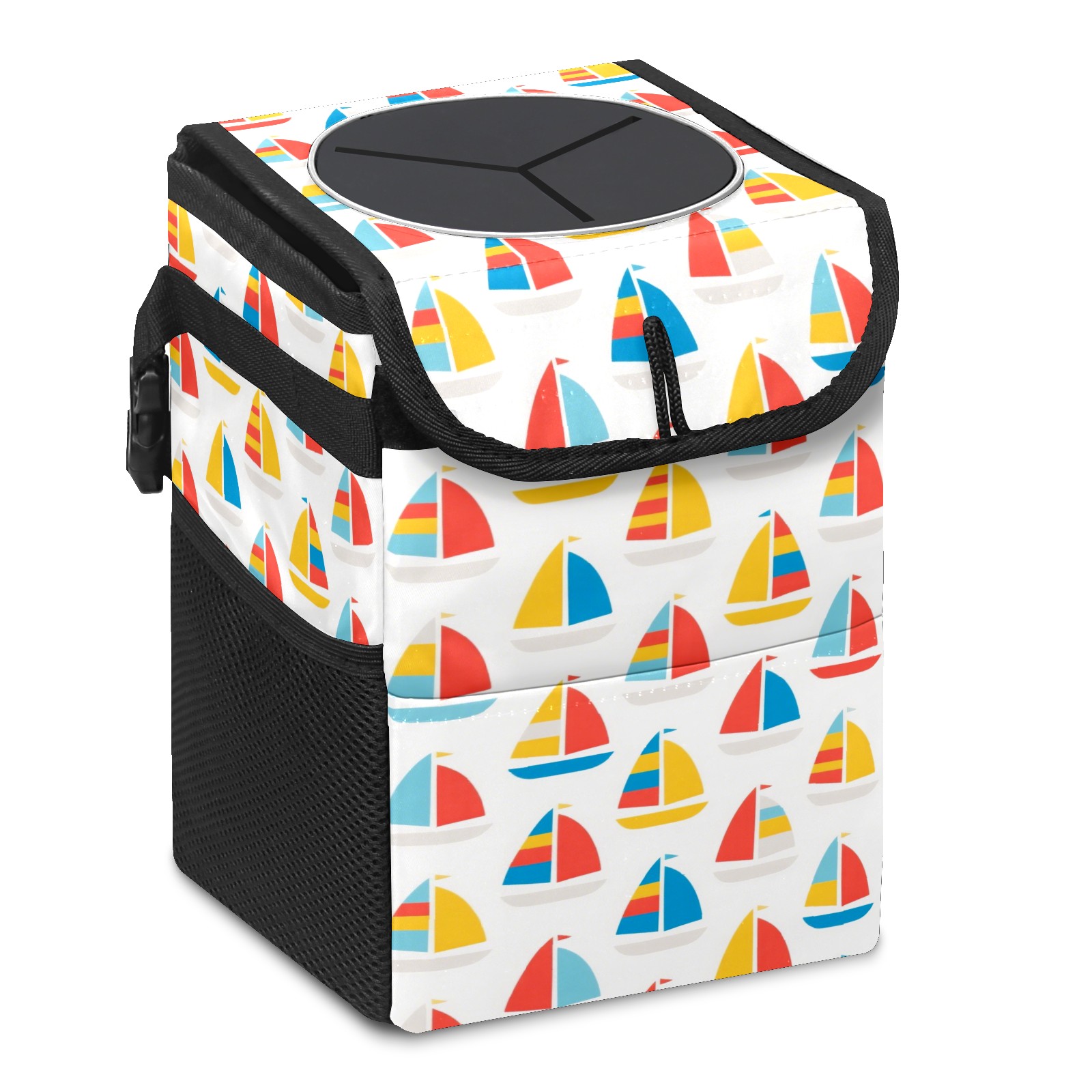 • <p>This multi-functional car trash can features a stylish printed design, combining practicality and aesthetics. Made with high-quality twill fabric and woven straps, it's sturdy and durable. Dimensions: 24×17×16cm (9.5×6.7×6.3 inches). The top rubber opening lid makes disposing of trash easy, while side mesh pockets and a front pocket easily store snacks, mobile phones, and other small items. Equipped with a dual securing system of straps and elastic hooks, it can be flexibly hung behind headrests, inside armrest boxes, or hooked to the bottom of seat cushions. Not only can it be used as a trash can, but it can also function as a food or miscellaneous item storage box, achieving multiple uses. When not in use, it can be folded for storage, saving space and creating a clean and tidy environment for your car.<br></p>