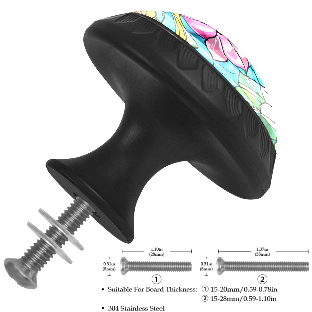 <p><b>Package includes:</b></p> <p>4 x cabinet knobs</p> <p>4 x screws 1.1'' (28 mm) </p> <p>4 x screws 1.37'' (35 mm)</p> <p><b>How to Install?</b></p> <p>1. Drill a hole in the drawer panel.</p> <p>2. Pass the screw through from the backside of the drawer.</p> <p>3. Tighten the knob onto the screw.</p> <p>ABS + Glass: The combination of sturdy ABS with high-transparency glass offers a long-lasting shine that enhances the quality of your home. Suitable for cabinets, drawers, dressers, wardrobes, office furniture, etc.</p> <p>Easy Maintenance: The smooth glass surface wipes clean easily, making it ideal for long-term use in kitchens and bathrooms.</p>