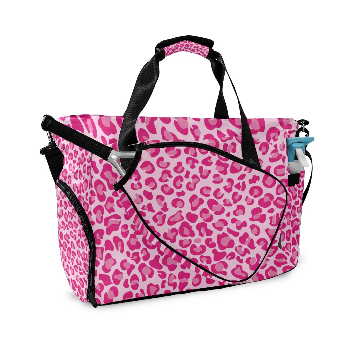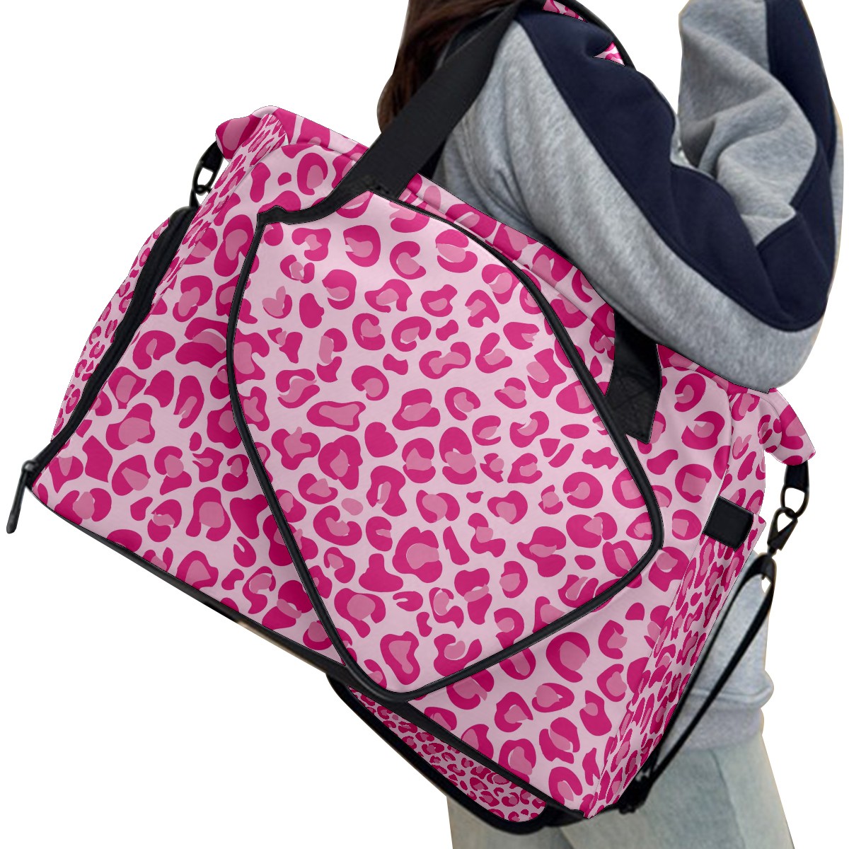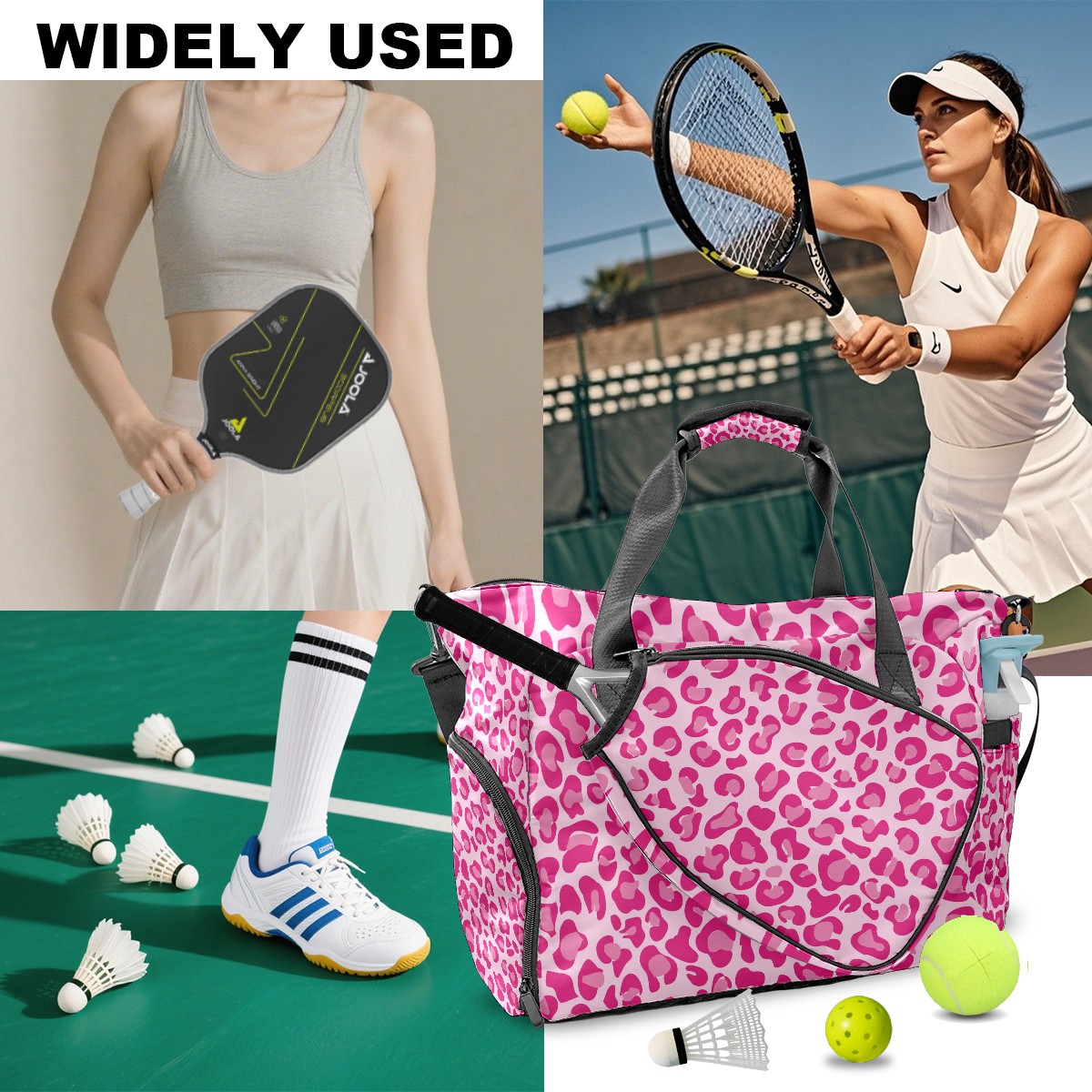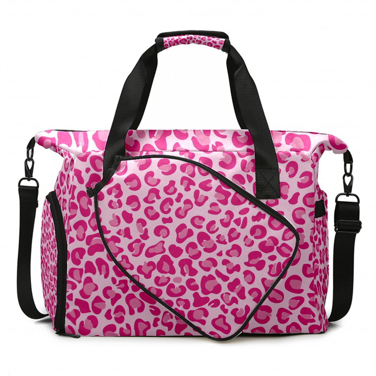 Pickleball Tote Bag Pink Leopard Print Pickleball Bag with Paddle Storage for Women Men Large Sports Bag for Paddles Balls Tennis