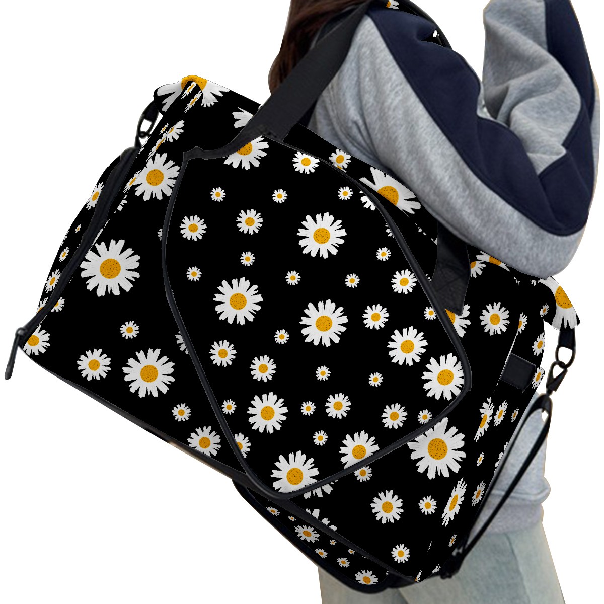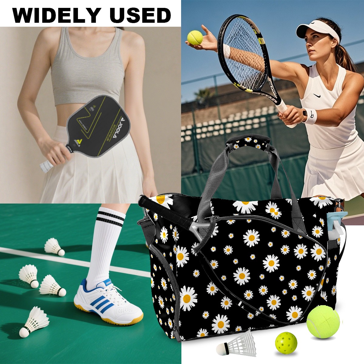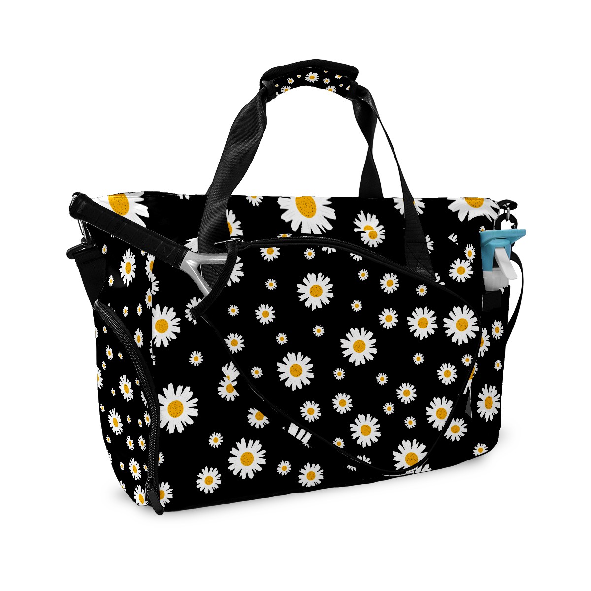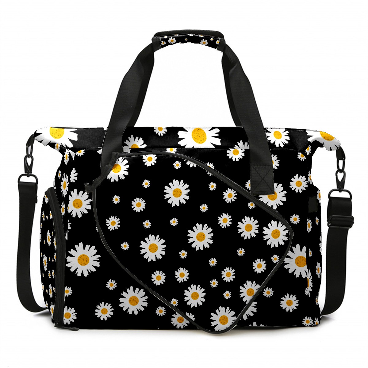Pickleball Tote Bag White Daisy On Black Pickleball Bag with Paddle Storage for Women Men Large Sports Bag for Paddles Balls Tennis