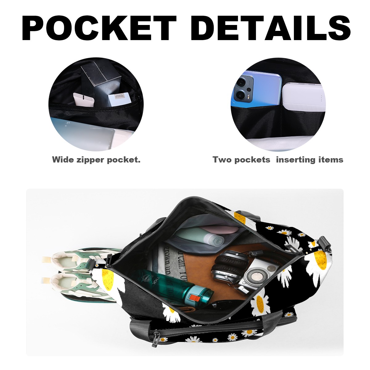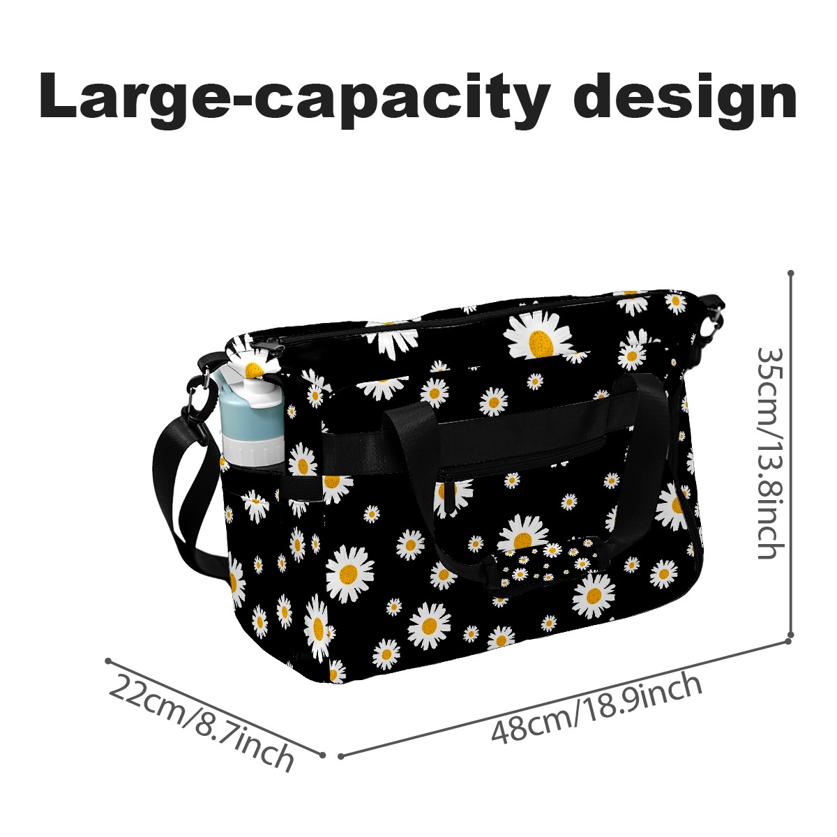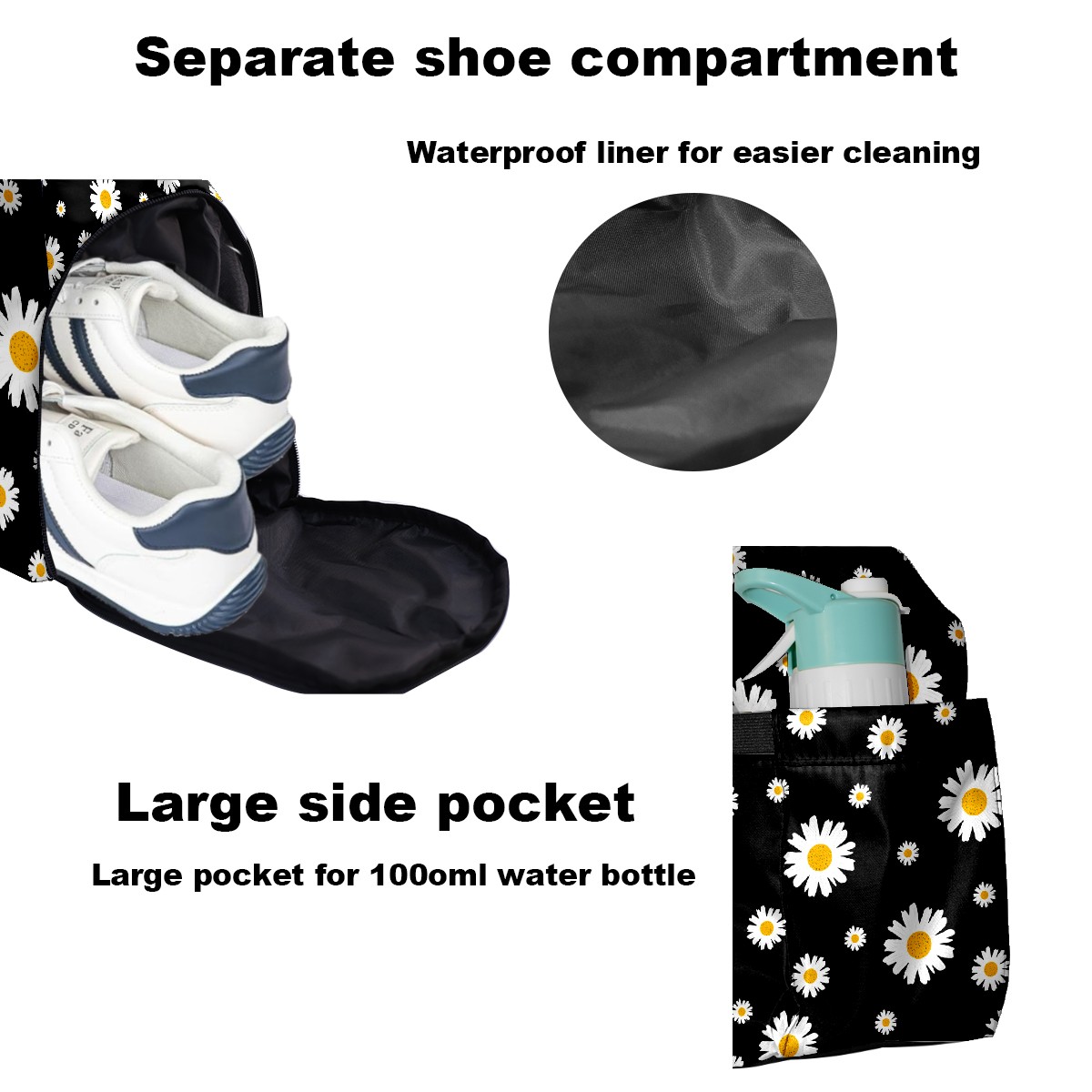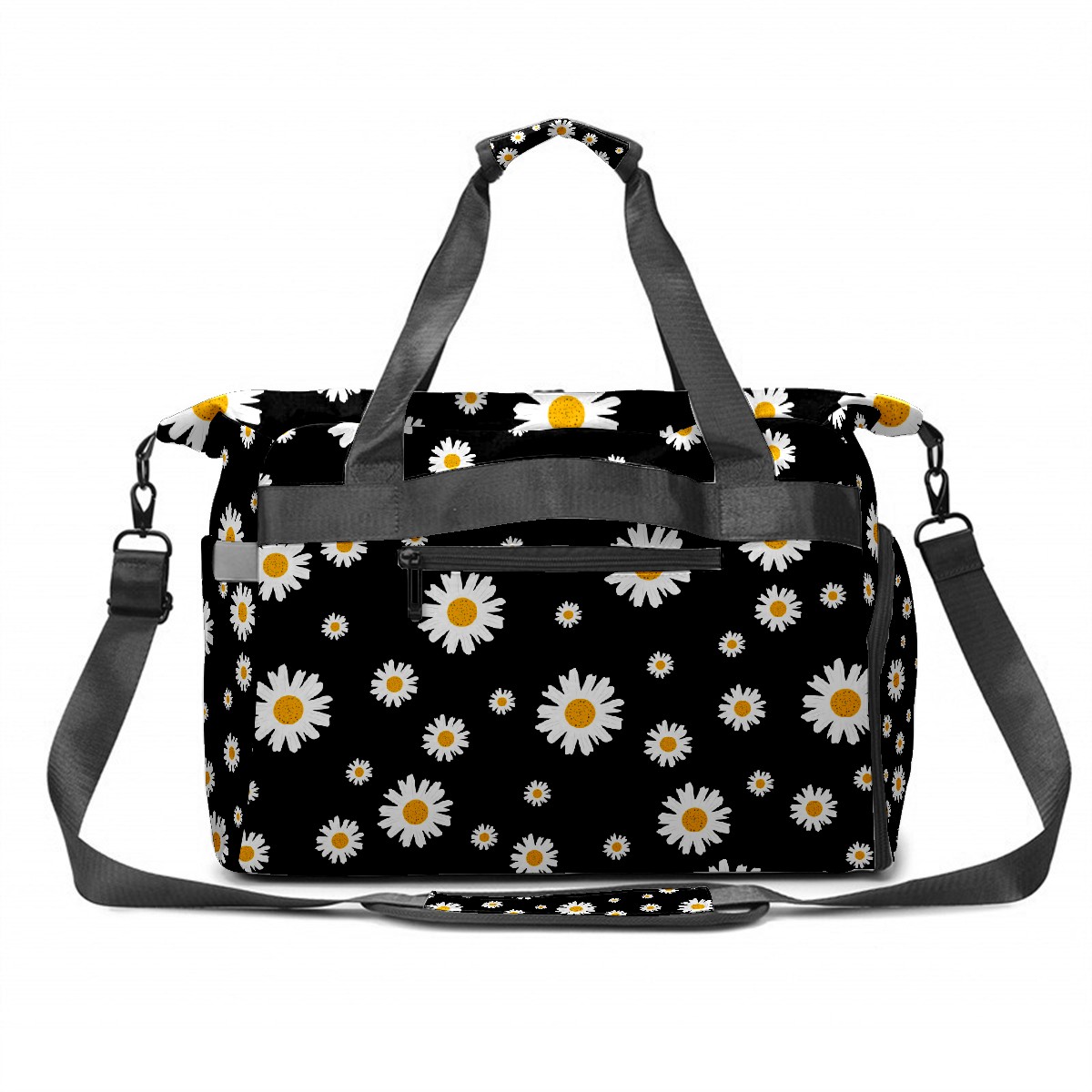 Pickleball Tote Bag White Daisy On Black Pickleball Bag with Paddle Storage for Women Men Large Sports Bag for Paddles Balls Tennis
