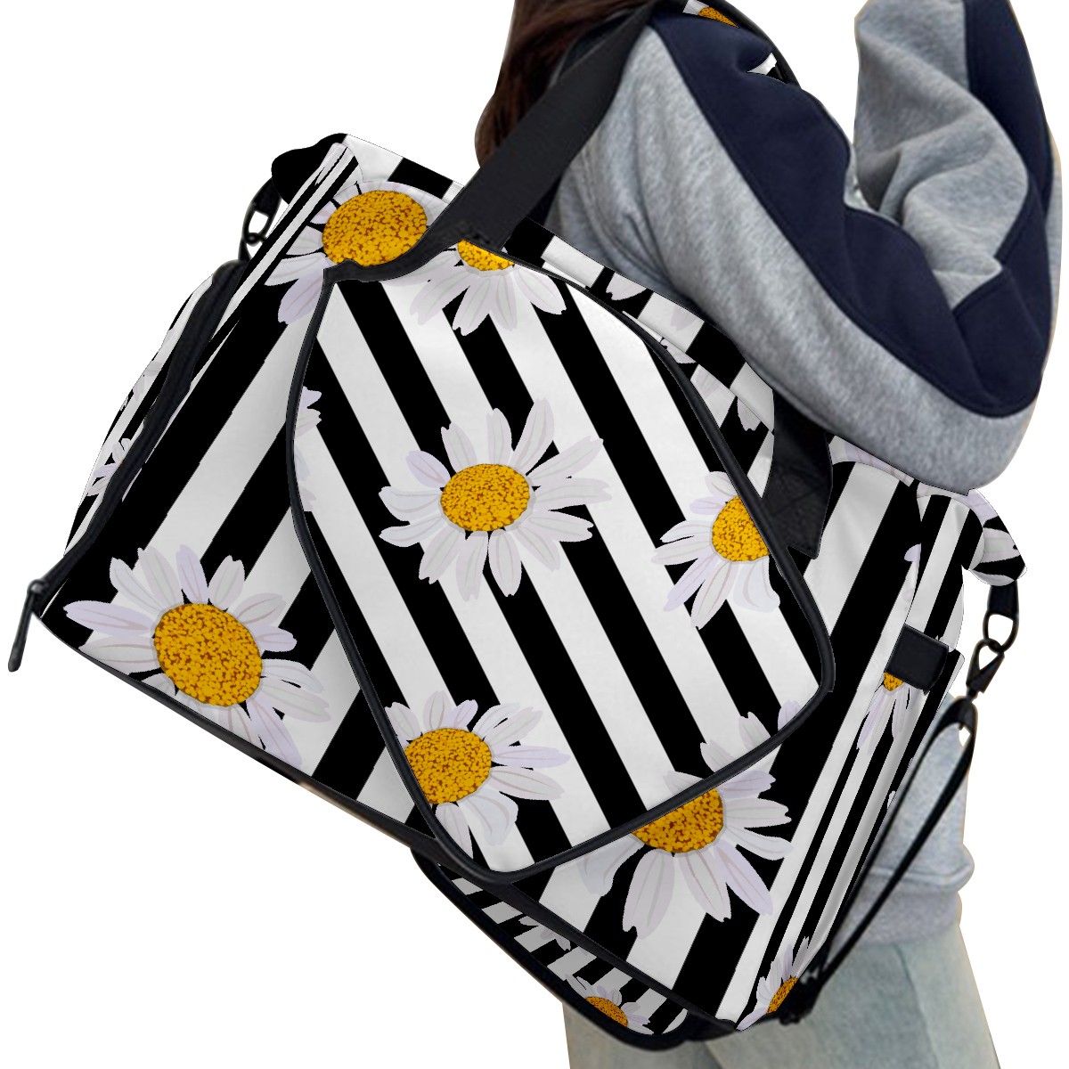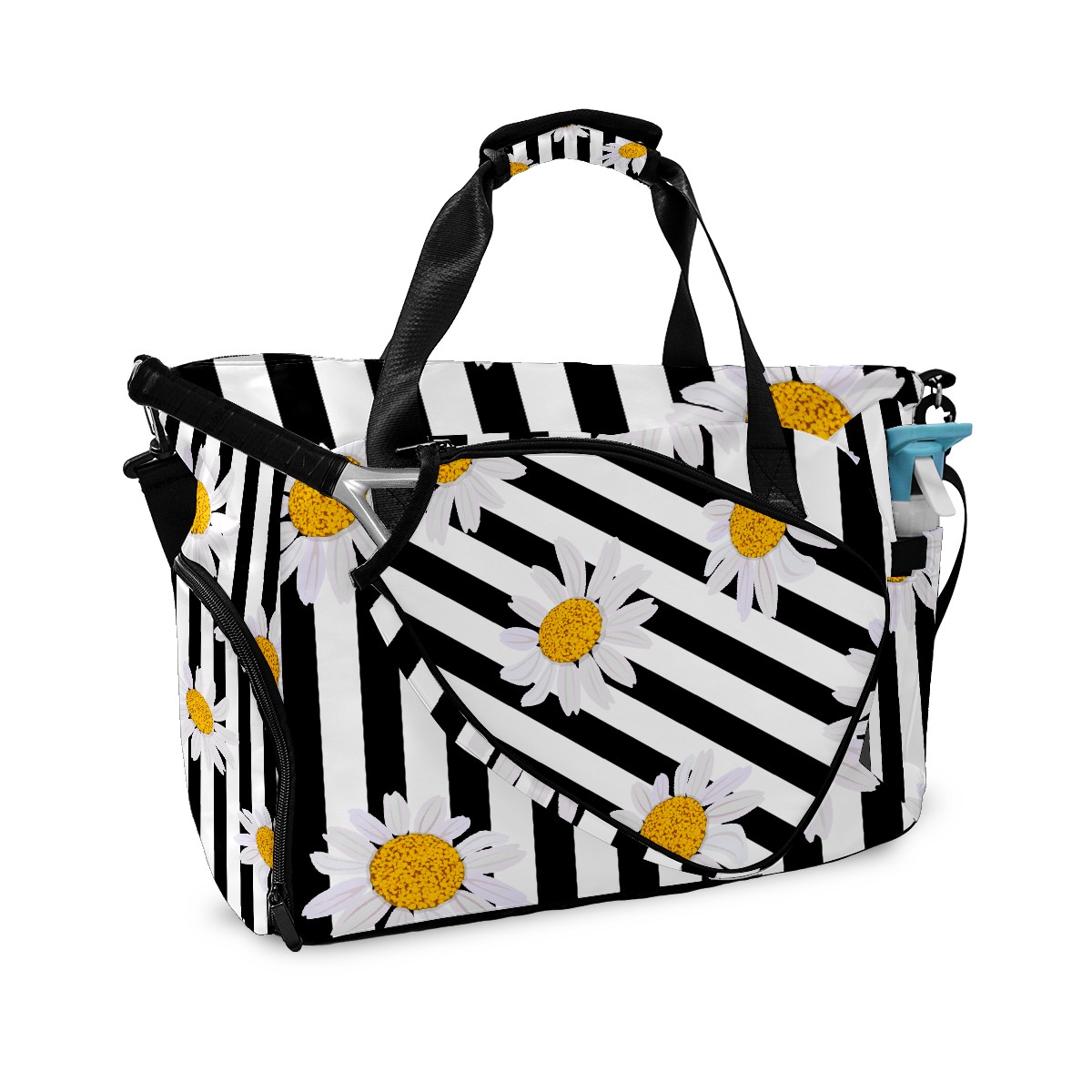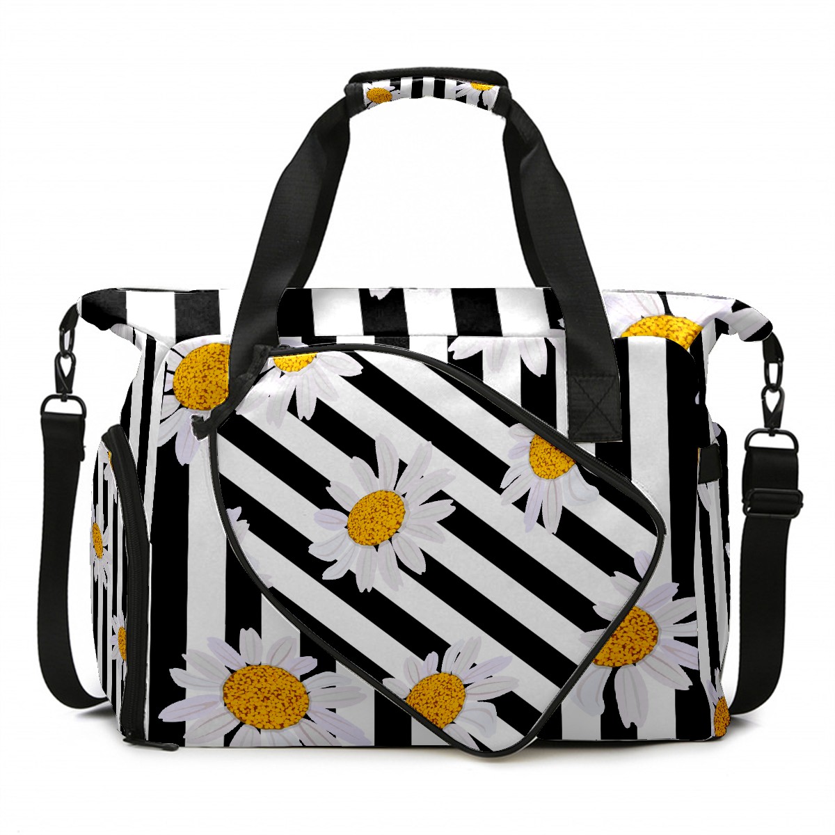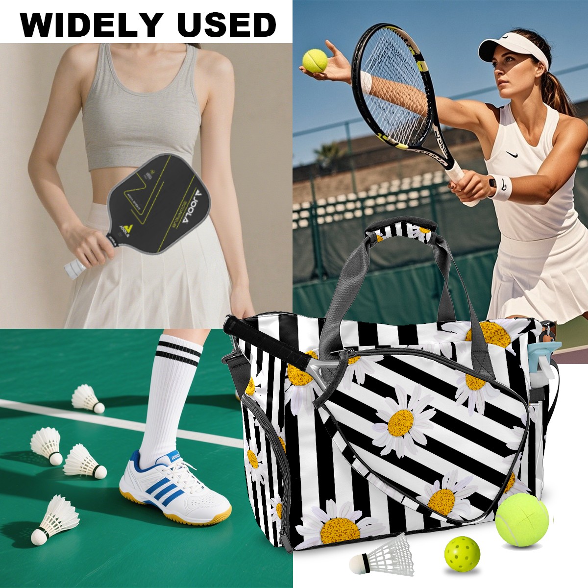 Pickleball Tote Bag Daisy Black White Vertical Stripes Pickleball Bag with Paddle Storage for Women Men Large Sports Bag for Paddles Balls Tennis