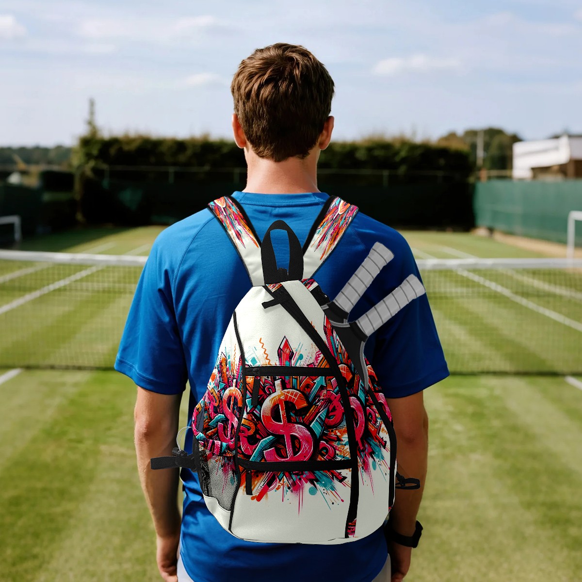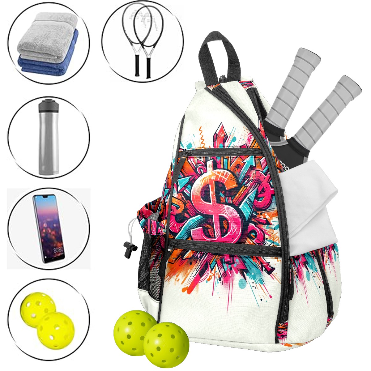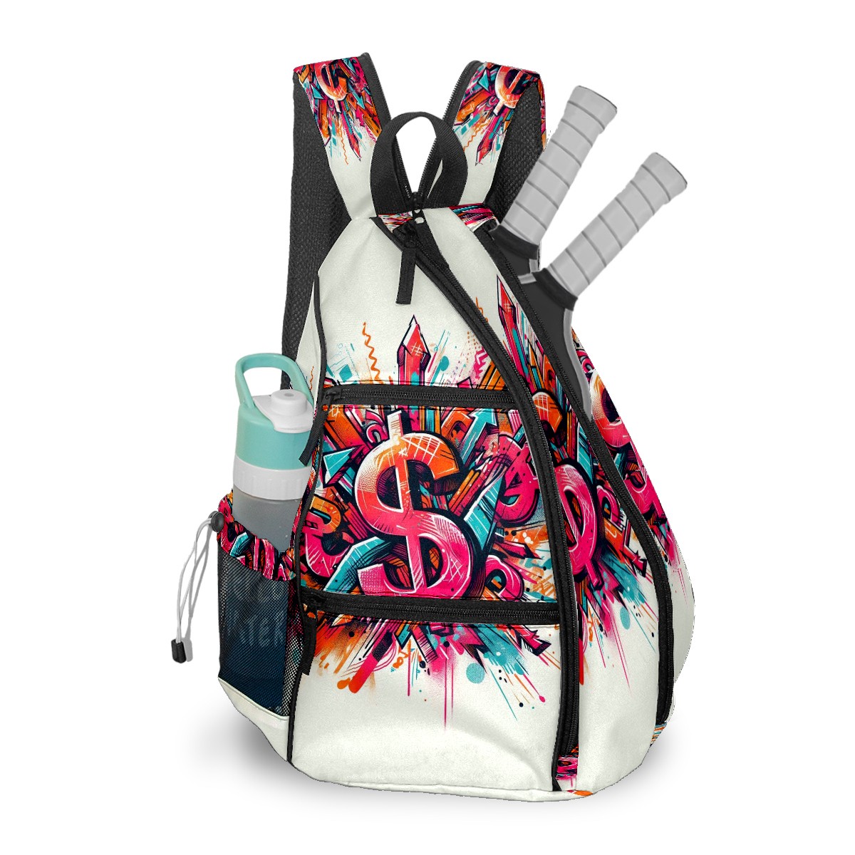 Print Pickleball Backpack Multicolor Dollar Signs | Padded 6-Paddle Compartment & Separate Shoe Bag | Multi-Pocket Sports & Gym Backpack for Tennis, Travel, Commute