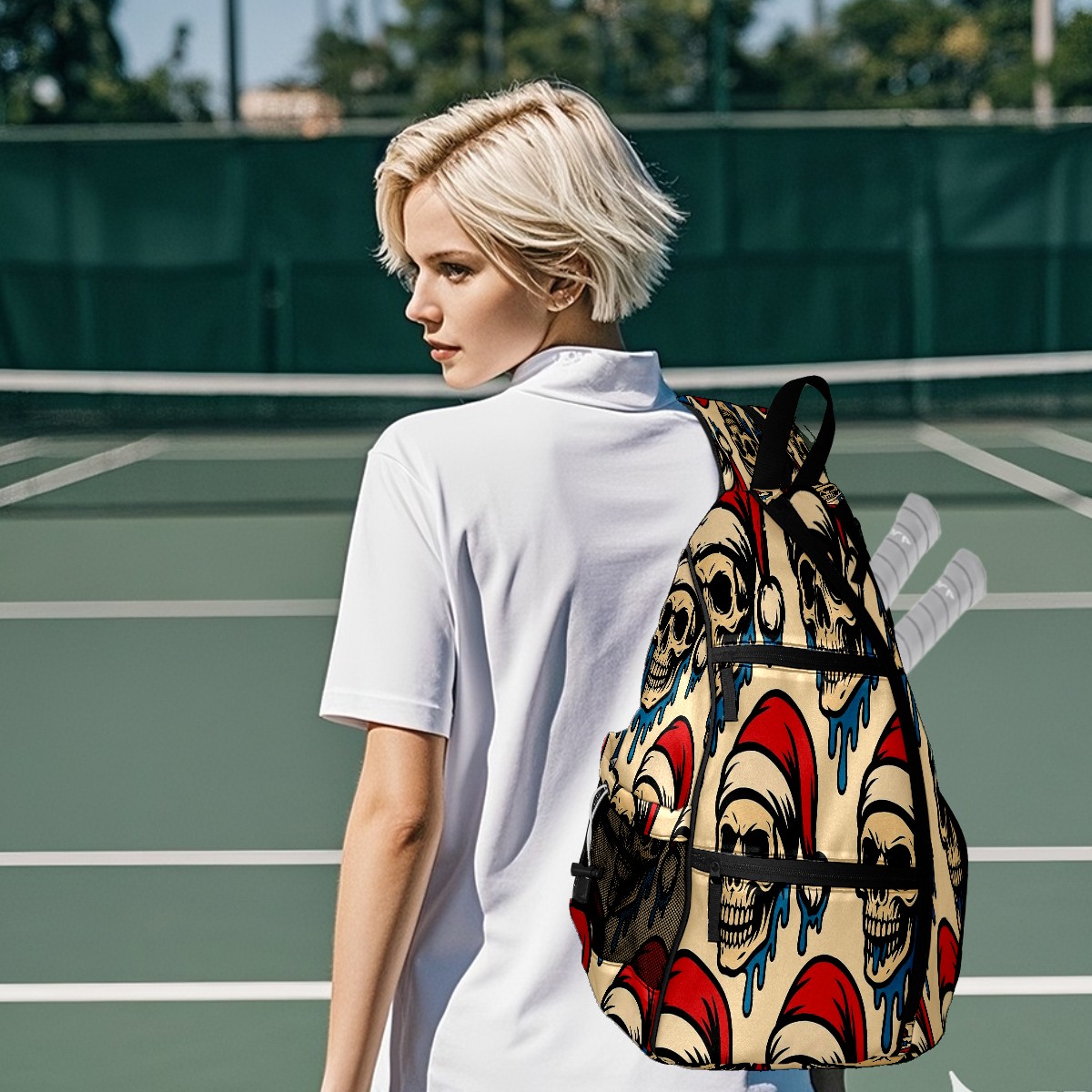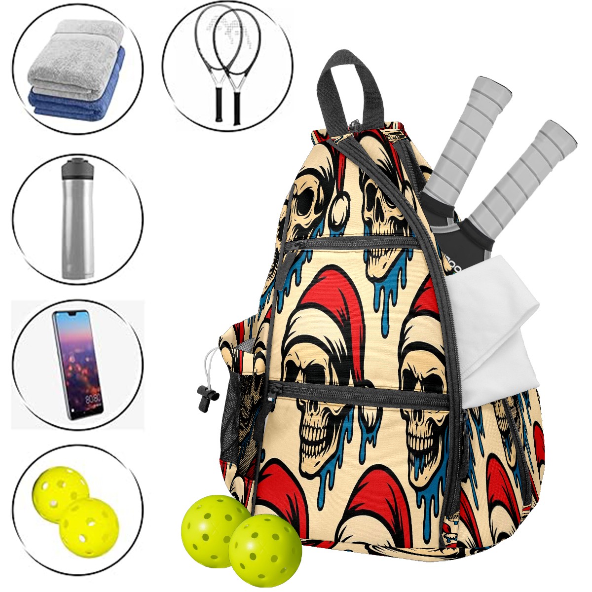 Print Pickleball Backpack Beige Christmas Skulls Drip | Padded 6-Paddle Compartment & Separate Shoe Bag | Multi-Pocket Sports & Gym Backpack for Tennis, Travel, Commute