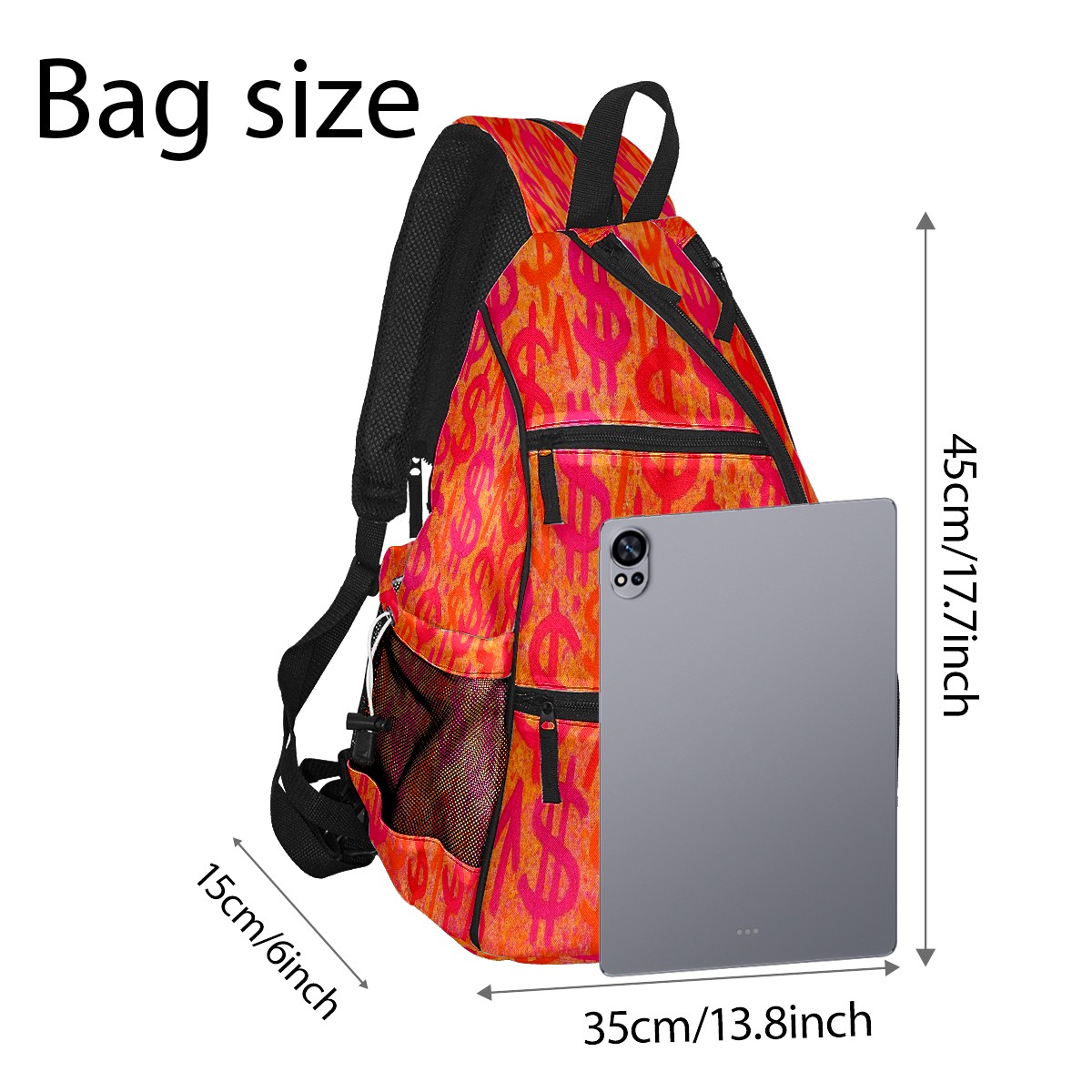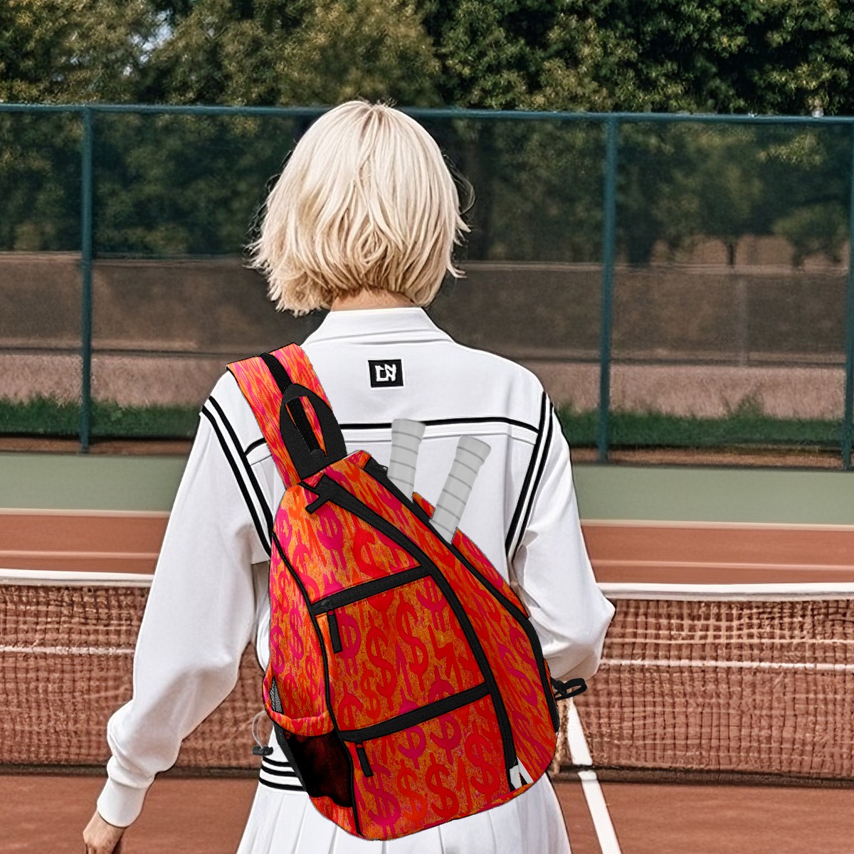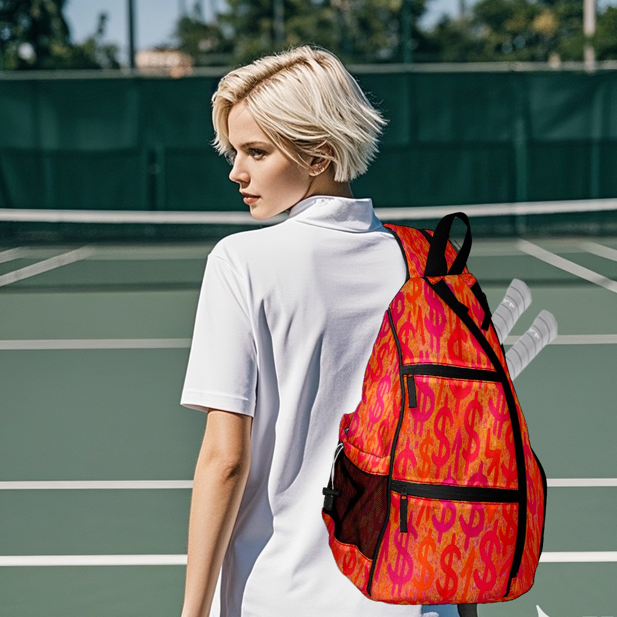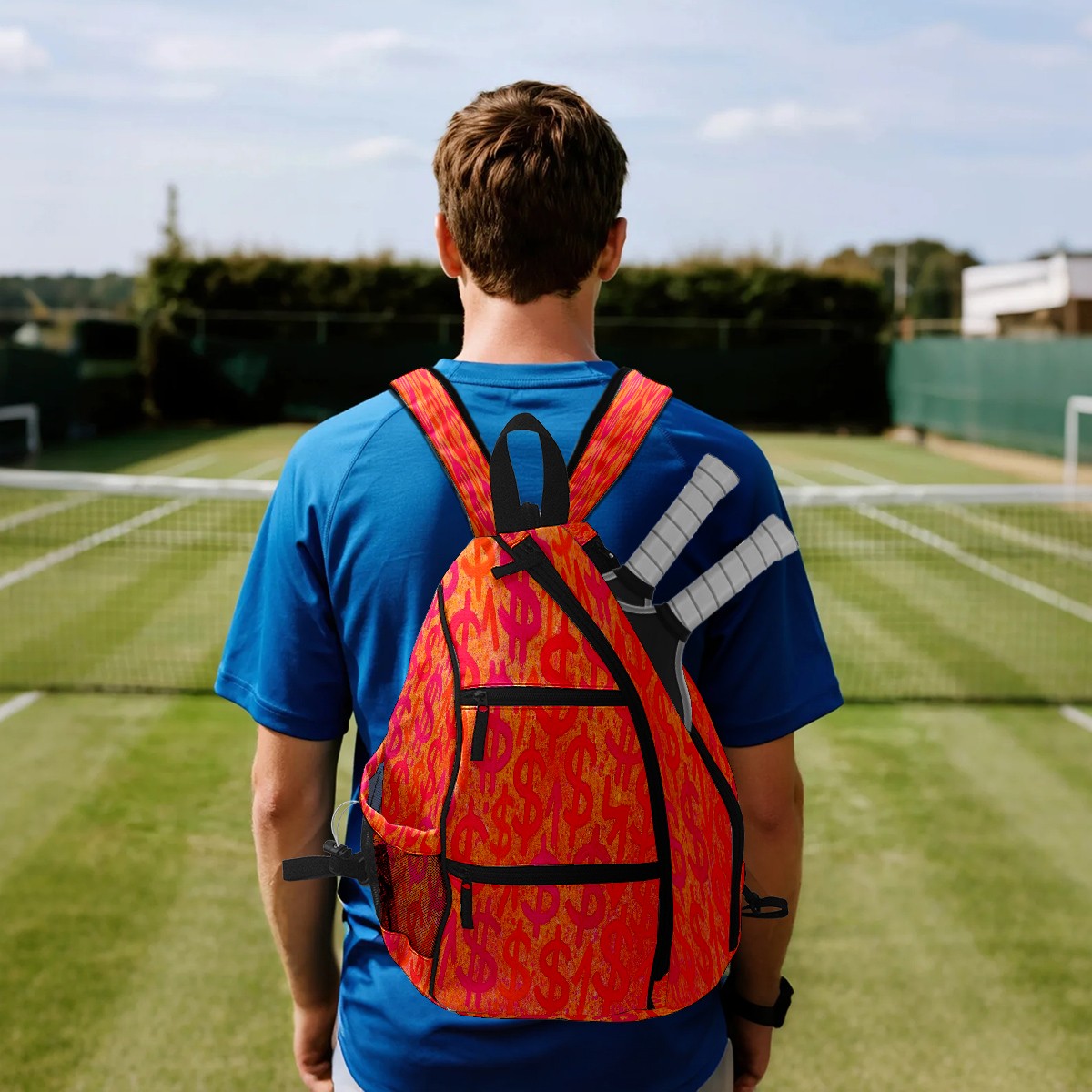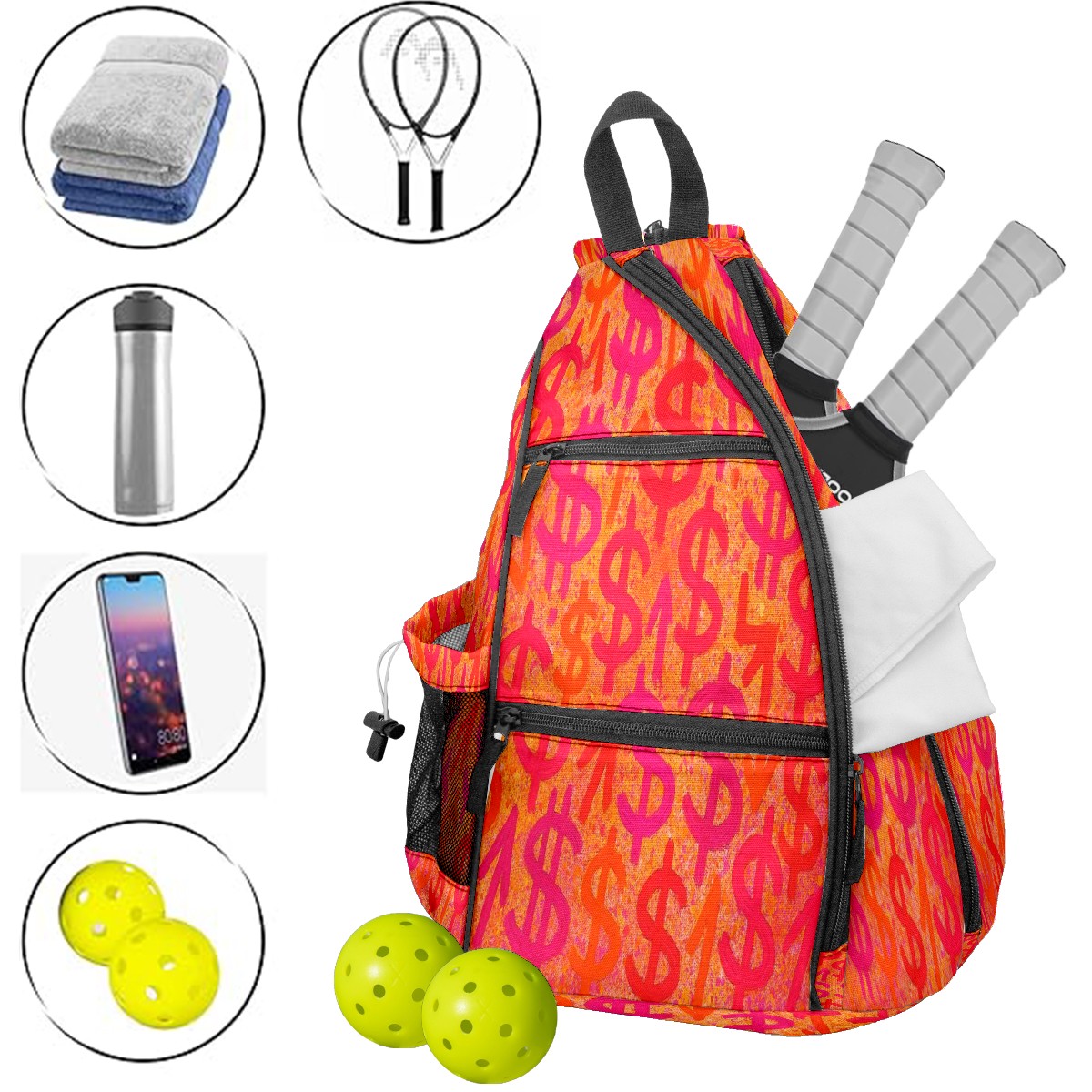 Print Pickleball Backpack Orange Dollar Signs | Padded 6-Paddle Compartment & Separate Shoe Bag | Multi-Pocket Sports & Gym Backpack for Tennis, Travel, Commute