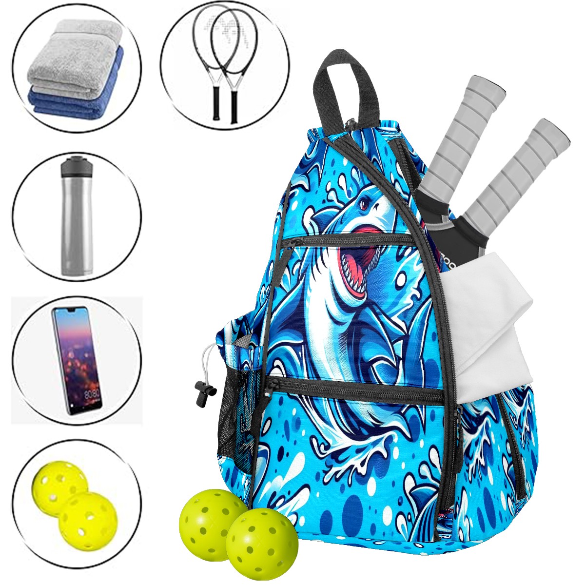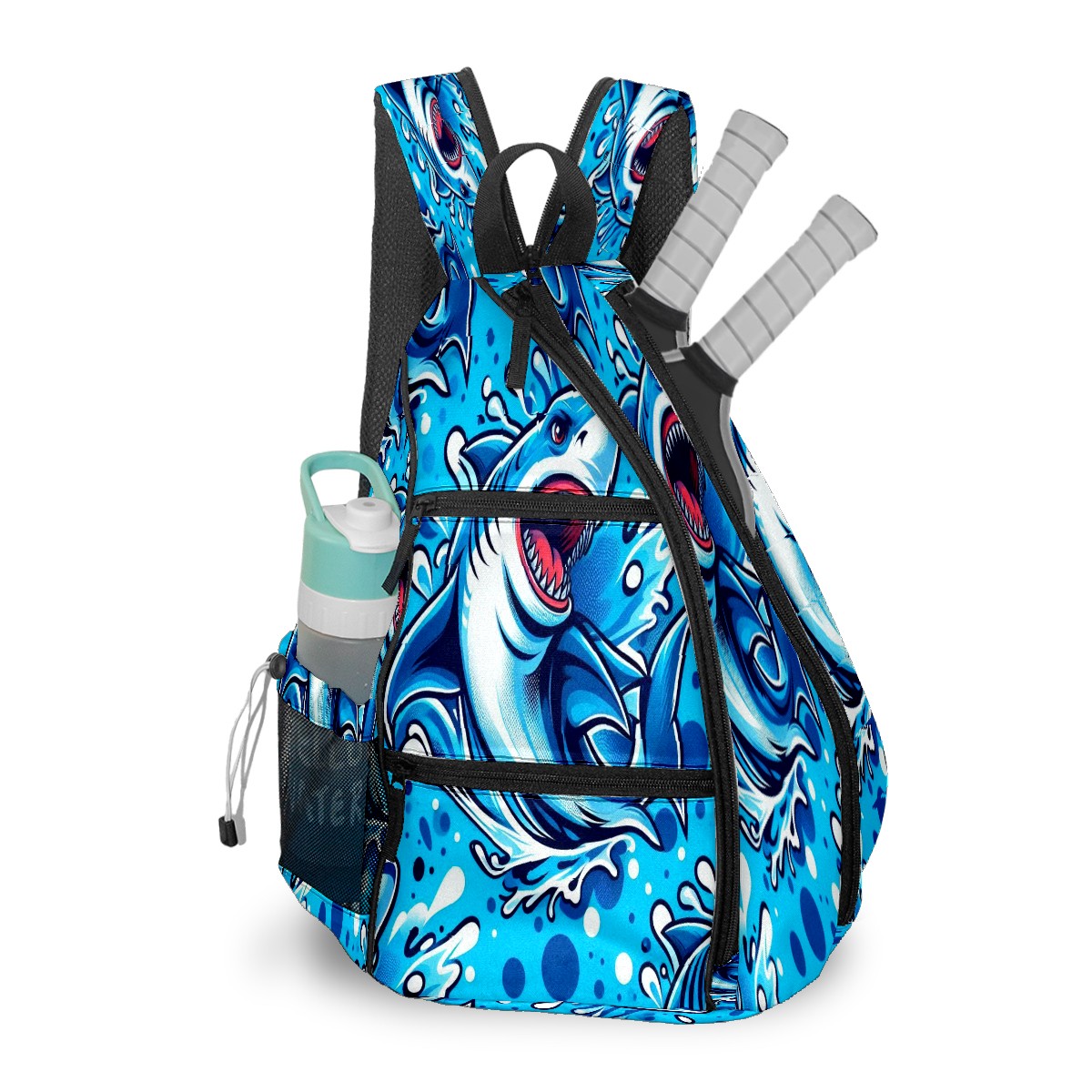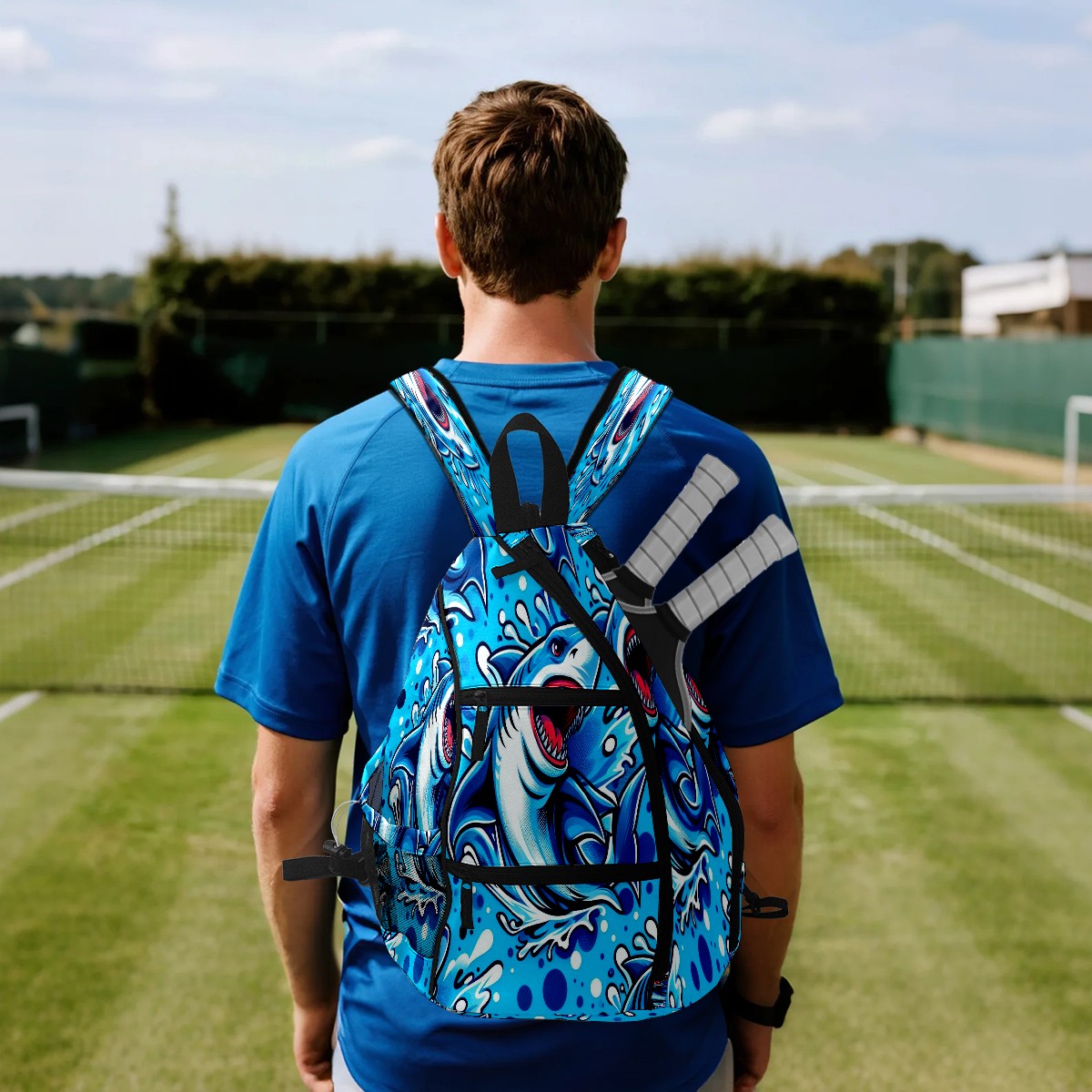 Print Pickleball Backpack Blue Sharks | Padded 6-Paddle Compartment & Separate Shoe Bag | Multi-Pocket Sports & Gym Backpack for Tennis, Travel, Commute