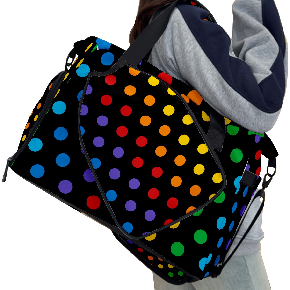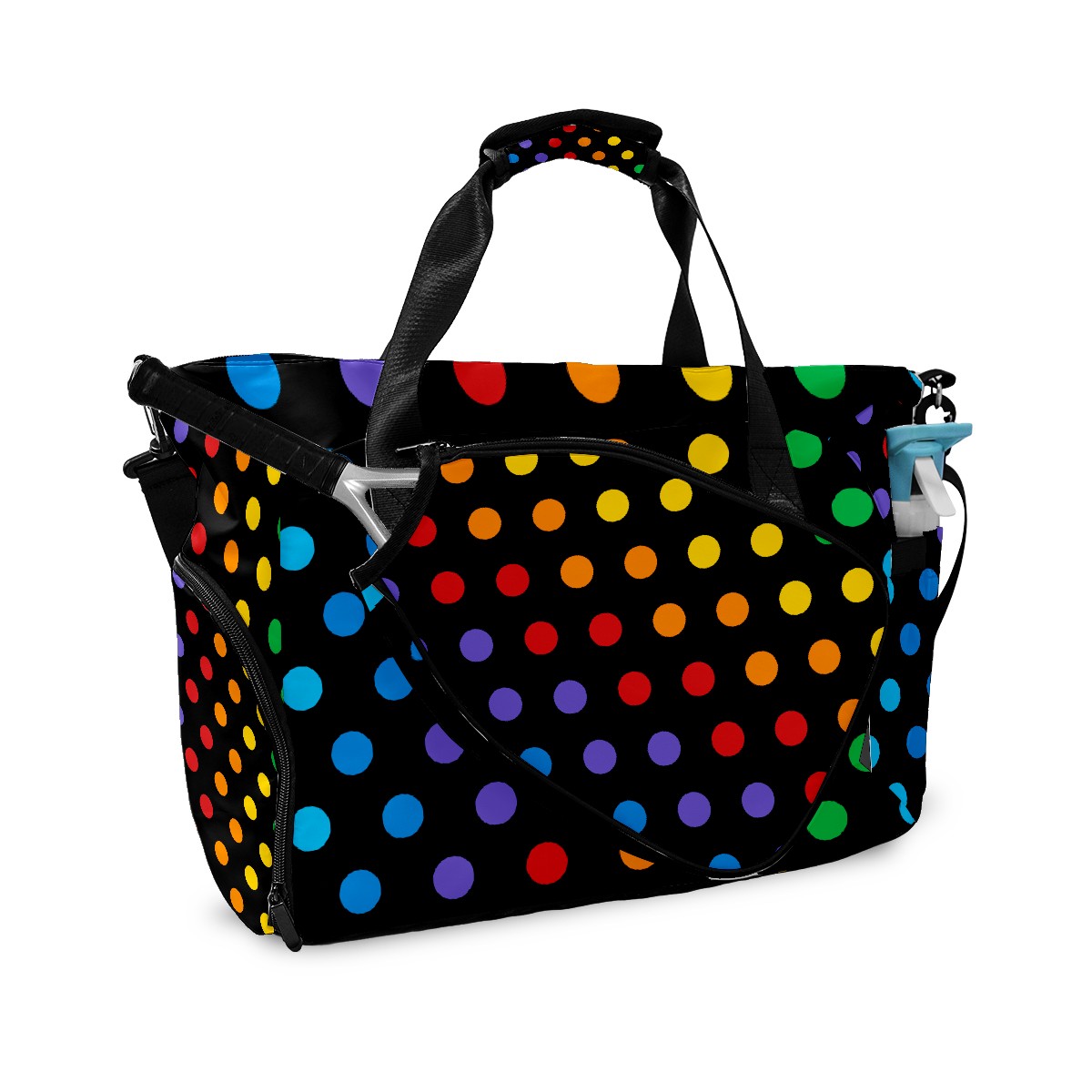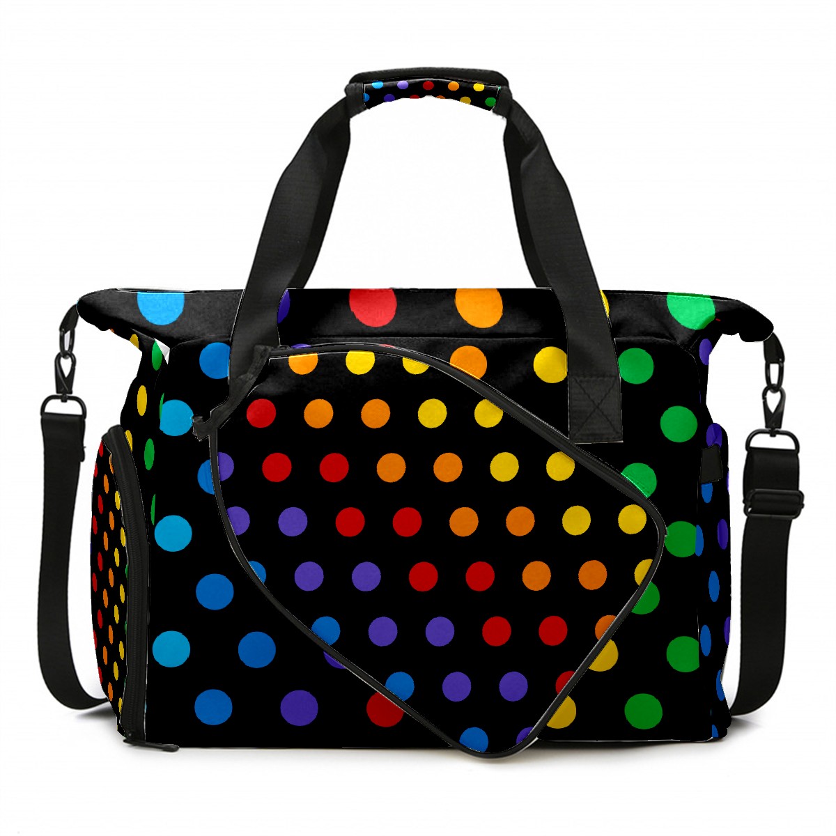 Pickleball Tote Bag Colorful Polka Dot On Black Pickleball Bag with Paddle Storage for Women Men Large Sports Bag for Paddles Balls Tennis