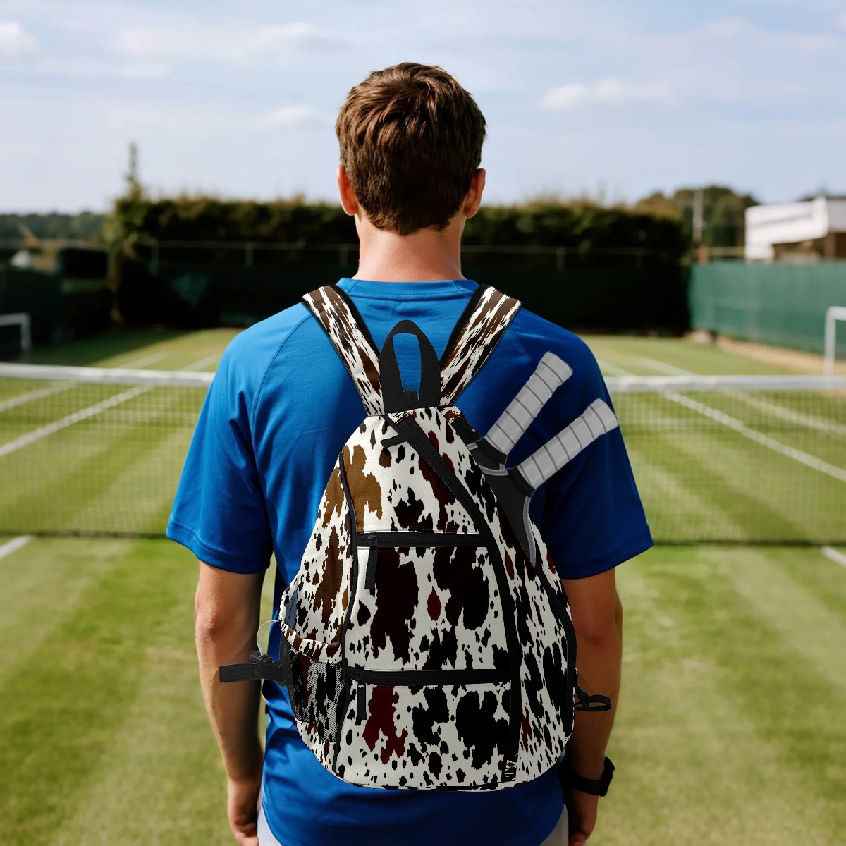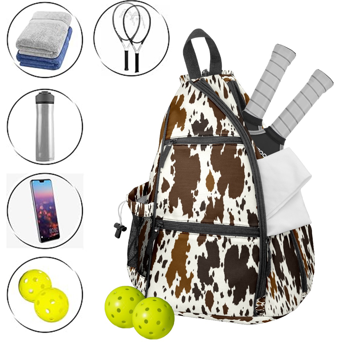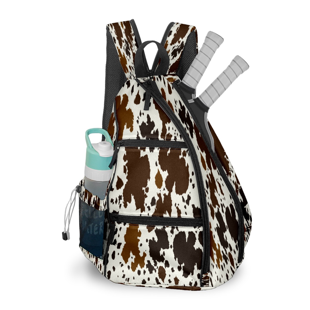 Print Pickleball Backpack Western Brown Black Cow Print | Padded 6-Paddle Compartment & Separate Shoe Bag | Multi-Pocket Sports & Gym Backpack for Tennis, Travel, Commute
