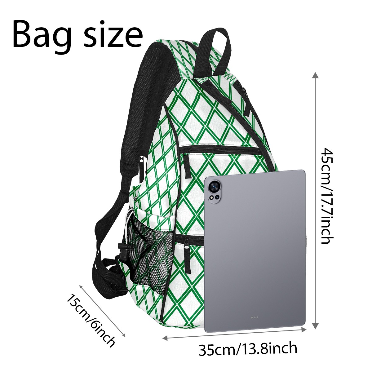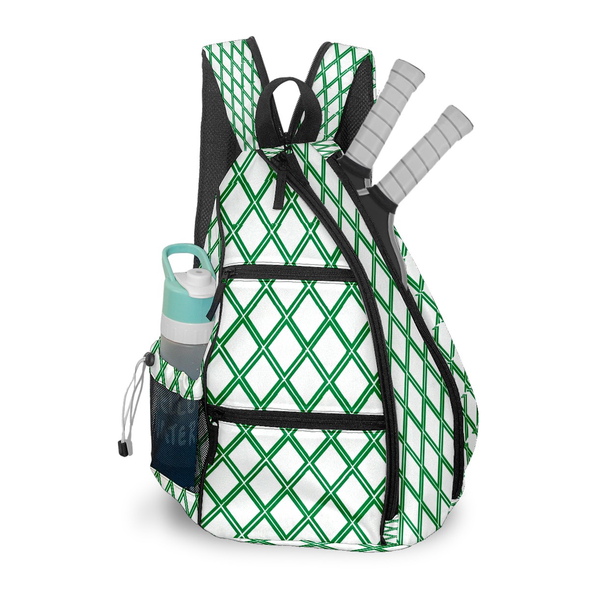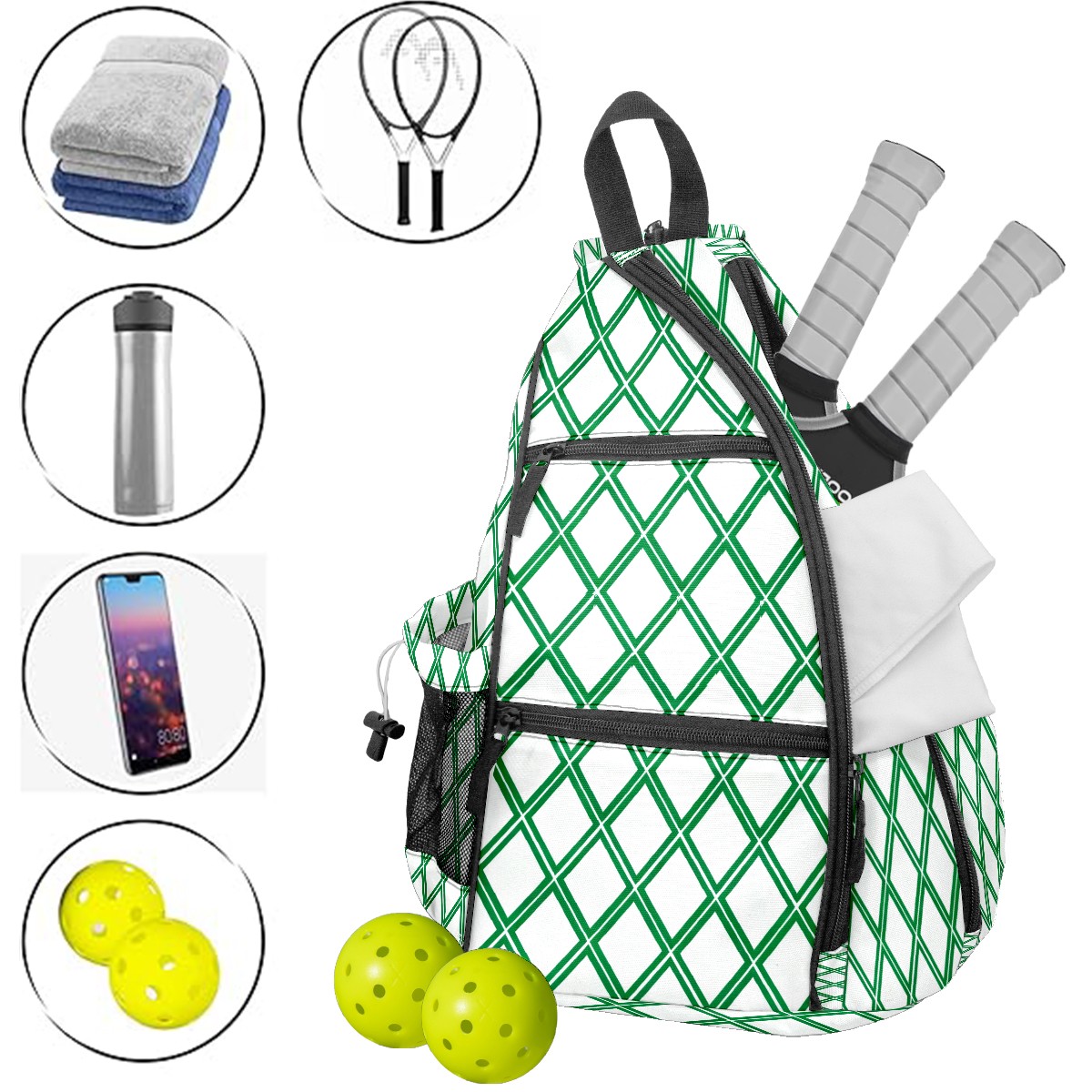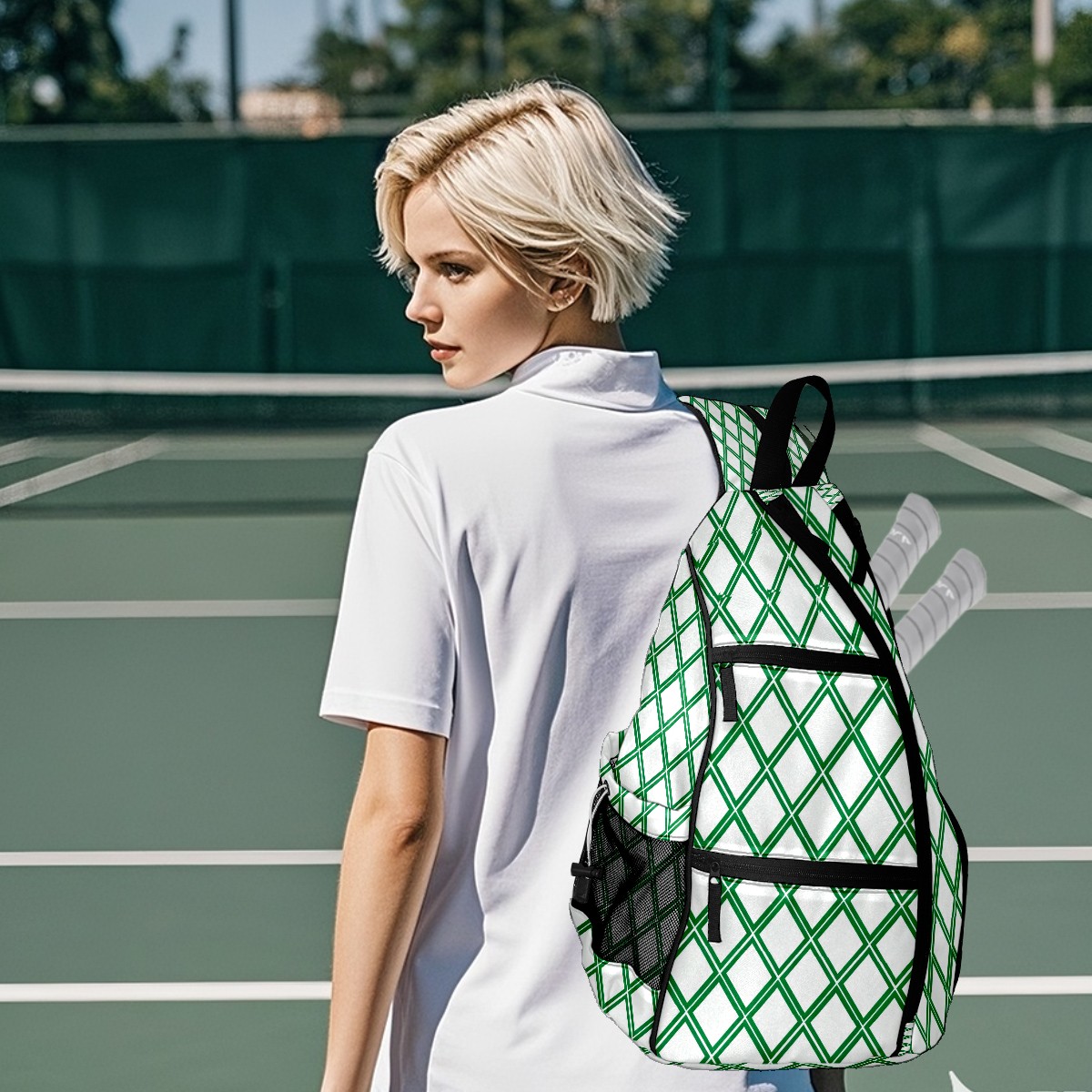 Pickleball Sling Bag for Women and Men - Backpack with Nylon Fabric/Woven Strap/Mesh Pocket/Fence Hook/Small Capacity/Adjustable Sling Bag Green Geometric Pattern