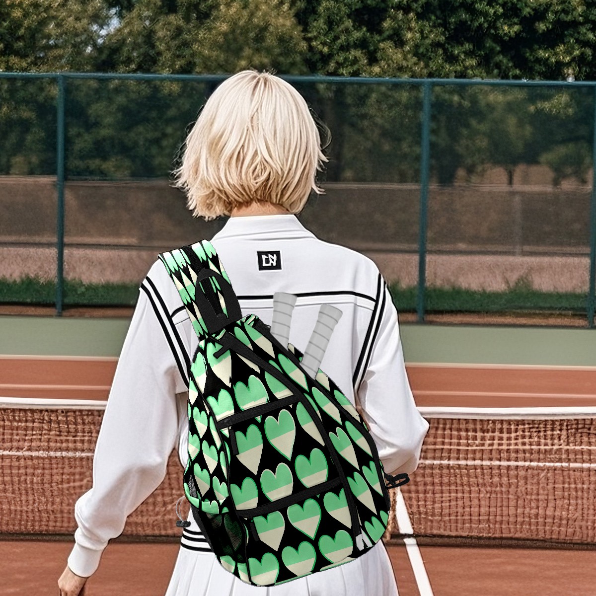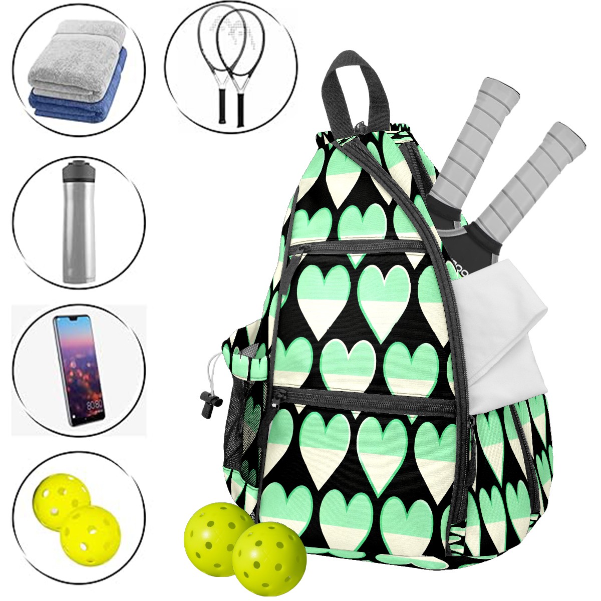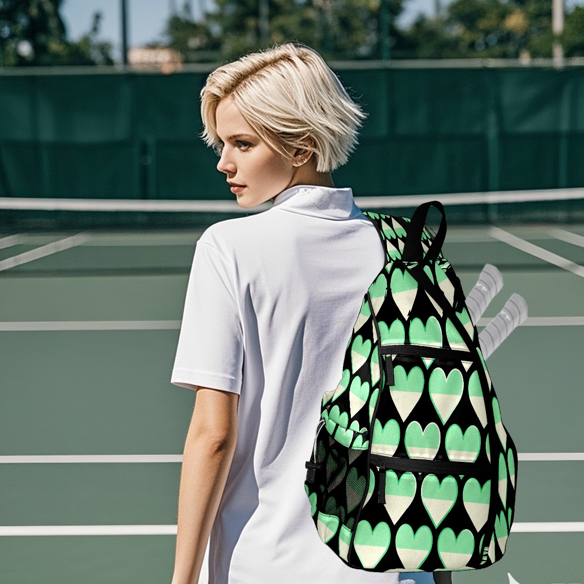 Pickleball Sling Bag for Women and Men - Backpack with Nylon Fabric/Woven Strap/Mesh Pocket/Fence Hook/Small Capacity/Adjustable Sling Bag Green Heart Pattern