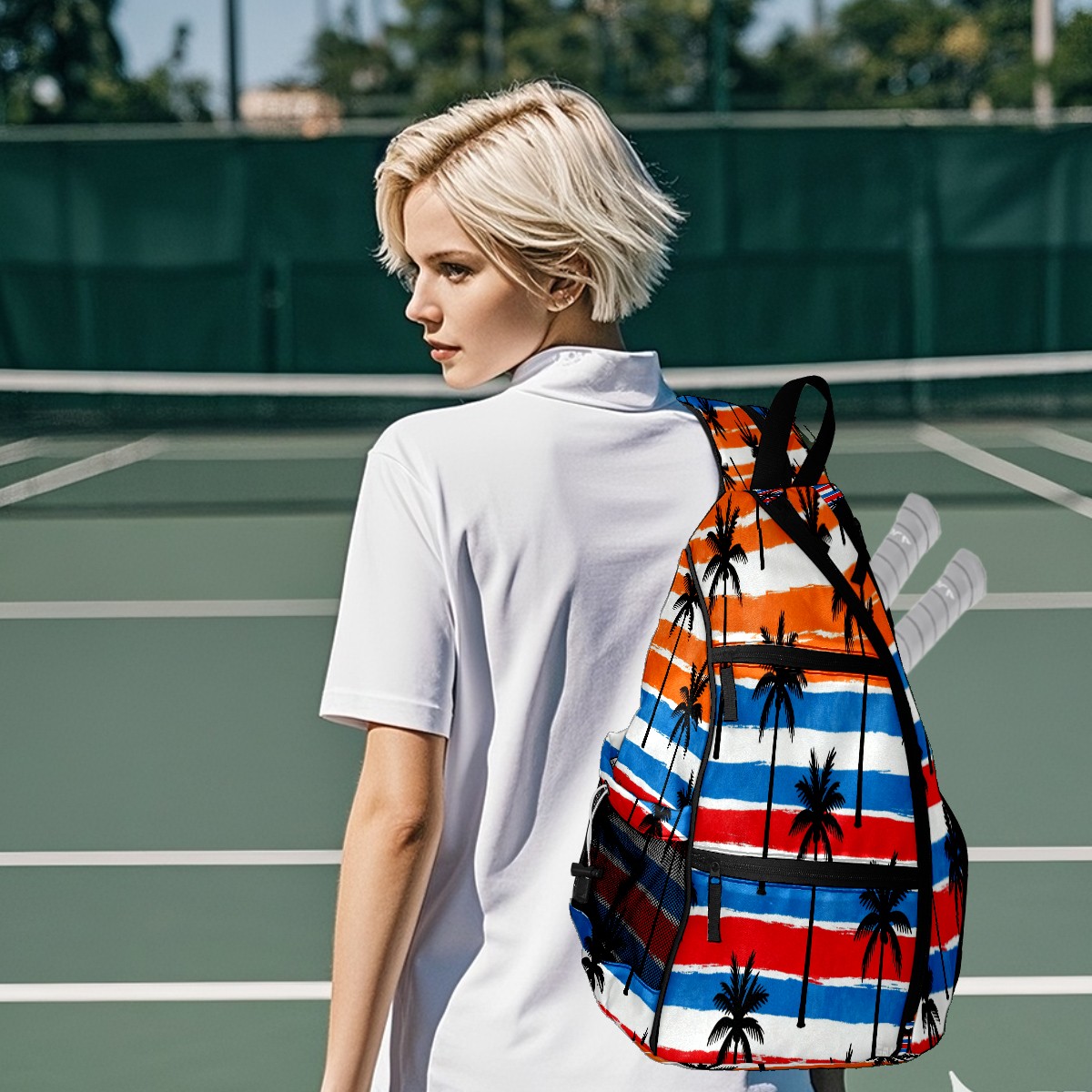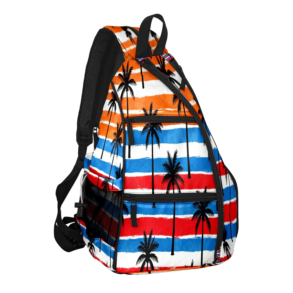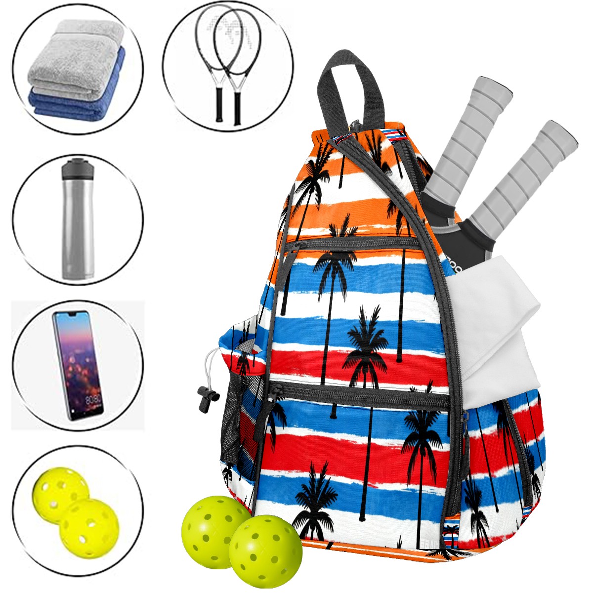 Pickleball Sling Bag for Women and Men - Backpack with Nylon Fabric/Woven Strap/Mesh Pocket/Fence Hook/Small Capacity/Adjustable Sling Bag Tropical Palm Tree Pattern