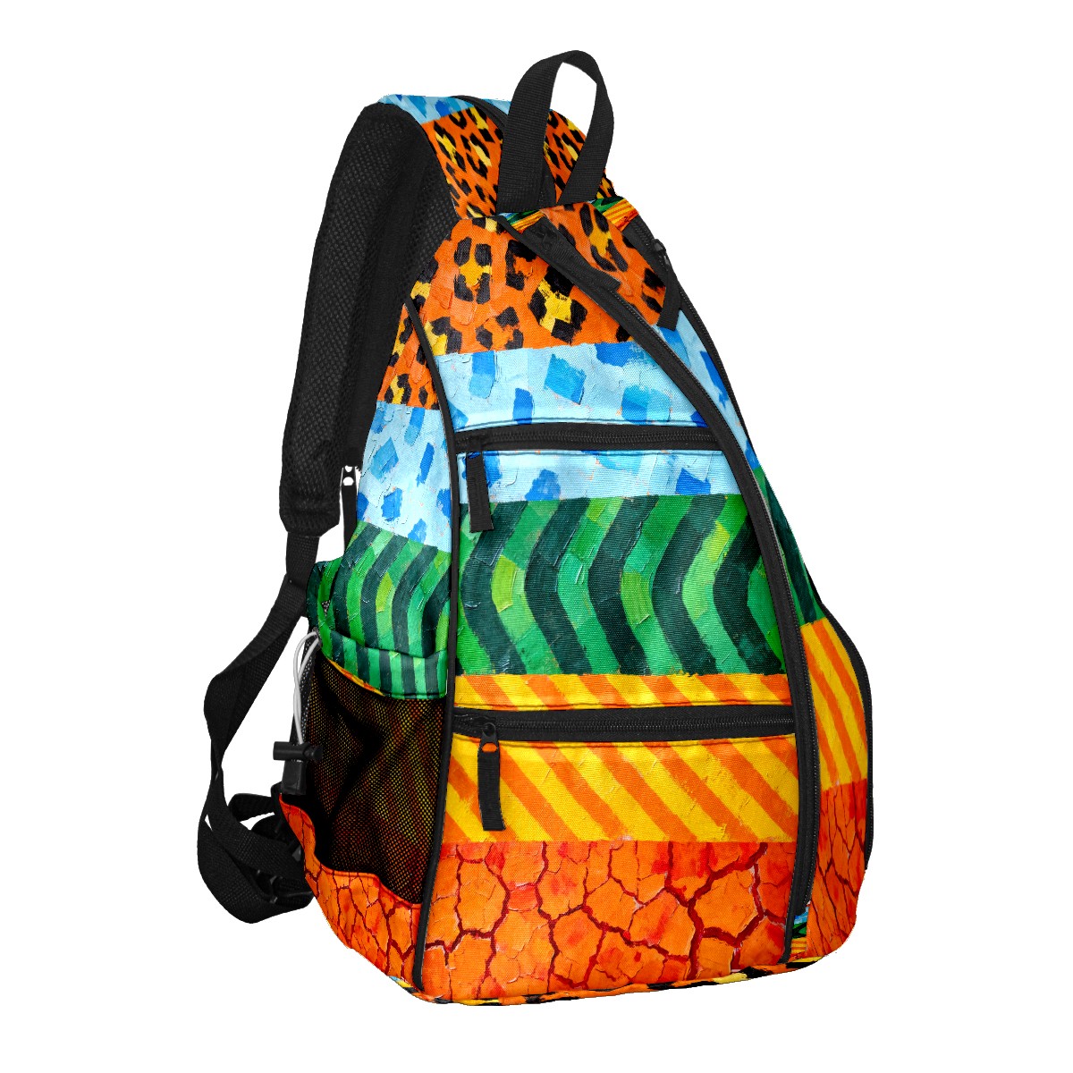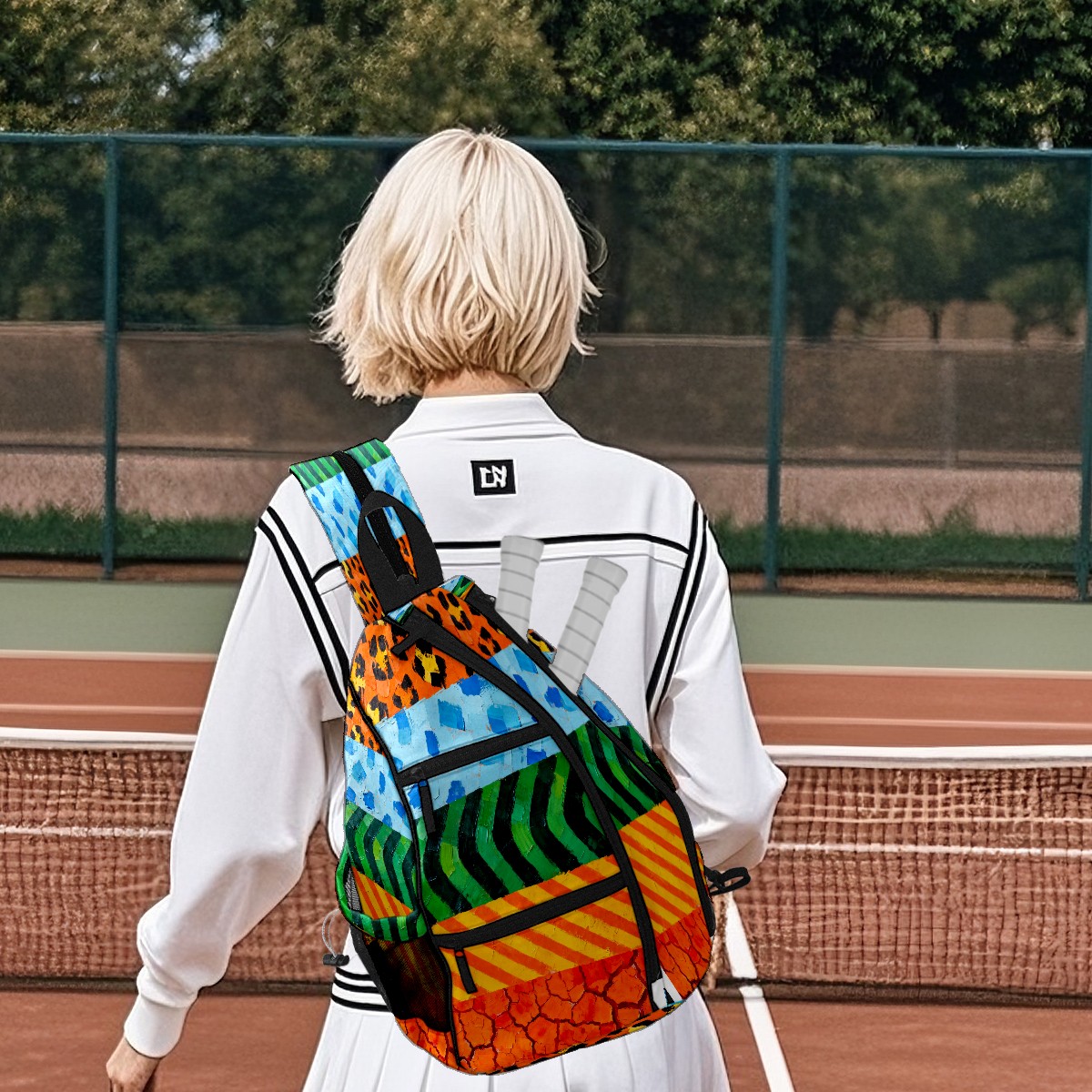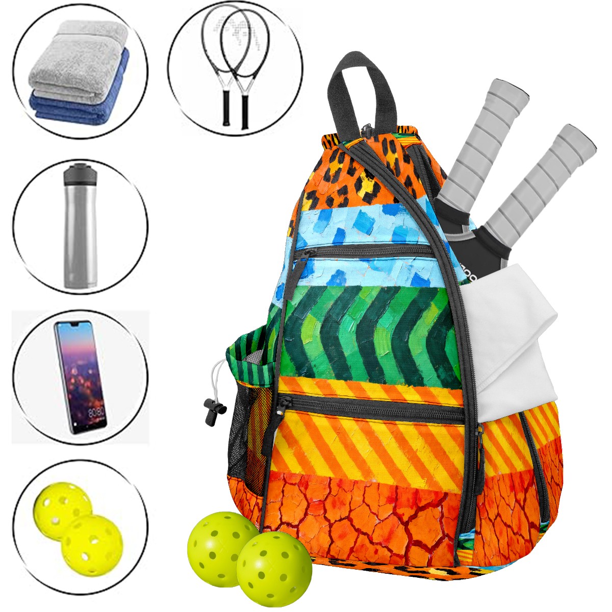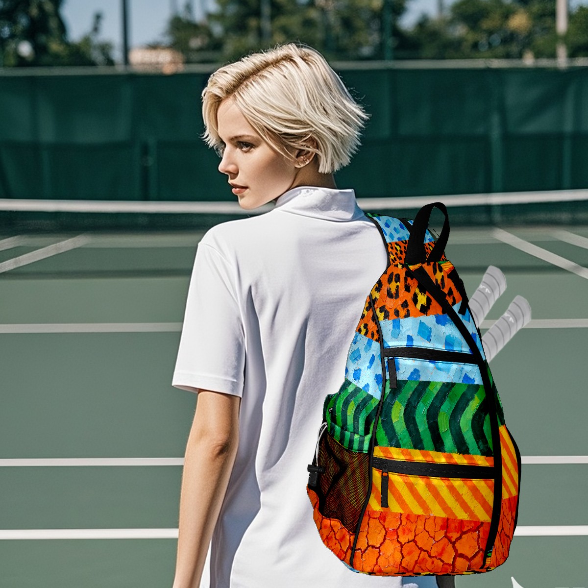 Pickleball Sling Bag for Women and Men - Backpack with Nylon Fabric/Woven Strap/Mesh Pocket/Fence Hook/Small Capacity/Adjustable Sling Bag Texture Patchwork Pattern