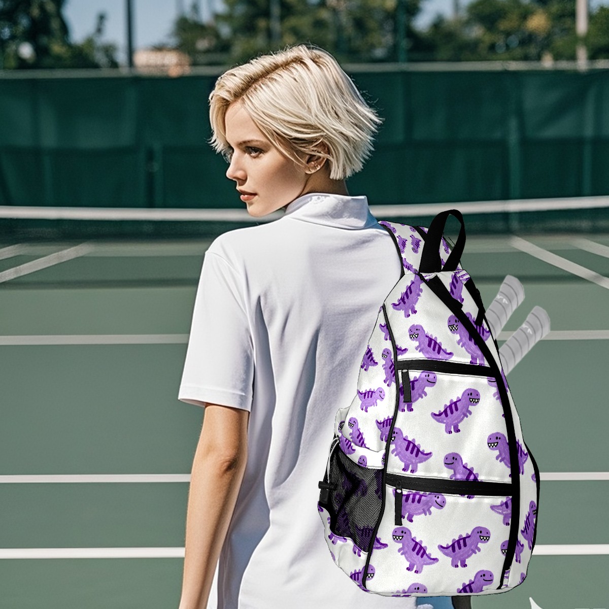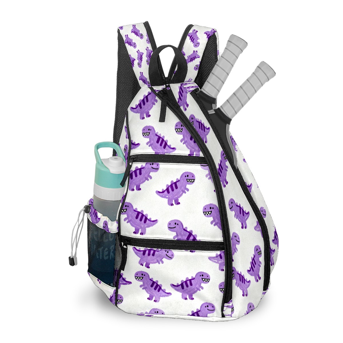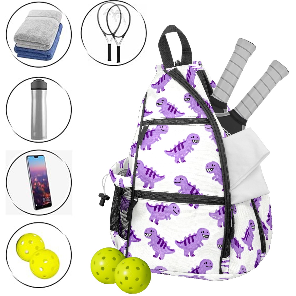 Pickleball Sling Bag for Women and Men - Backpack with Nylon Fabric/Woven Strap/Mesh Pocket/Fence Hook/Small Capacity/Adjustable Sling Bag Purple Cartoon Dinosaur