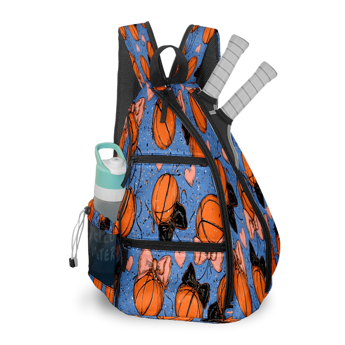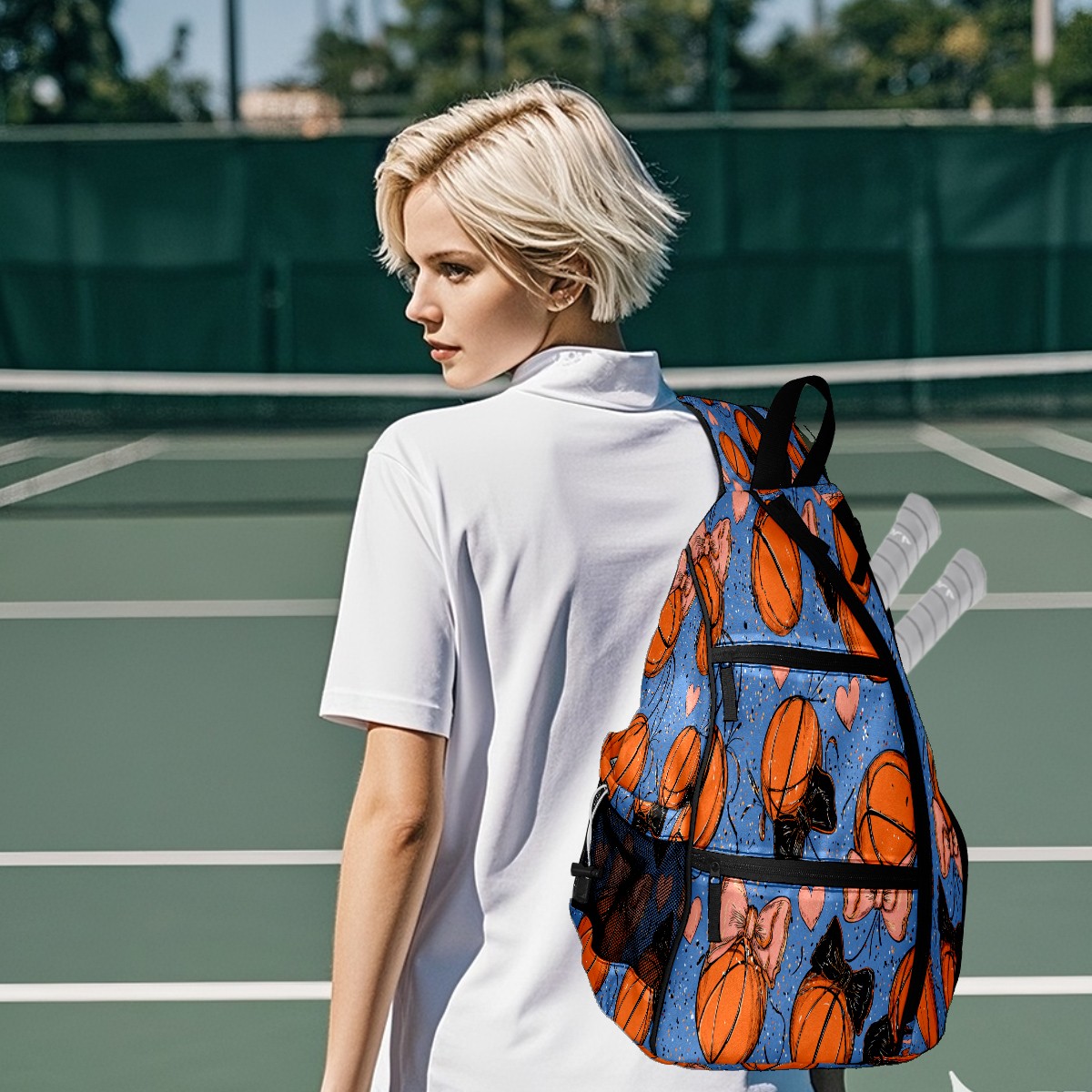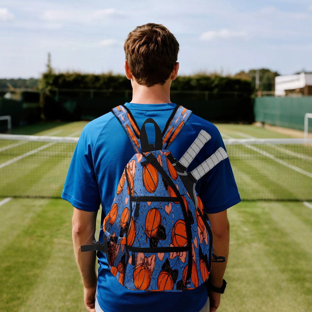 Print Pickleball Backpack Blue Basketballs Bows | Padded 6-Paddle Compartment & Separate Shoe Bag | Multi-Pocket Sports & Gym Backpack for Tennis, Travel, Commute