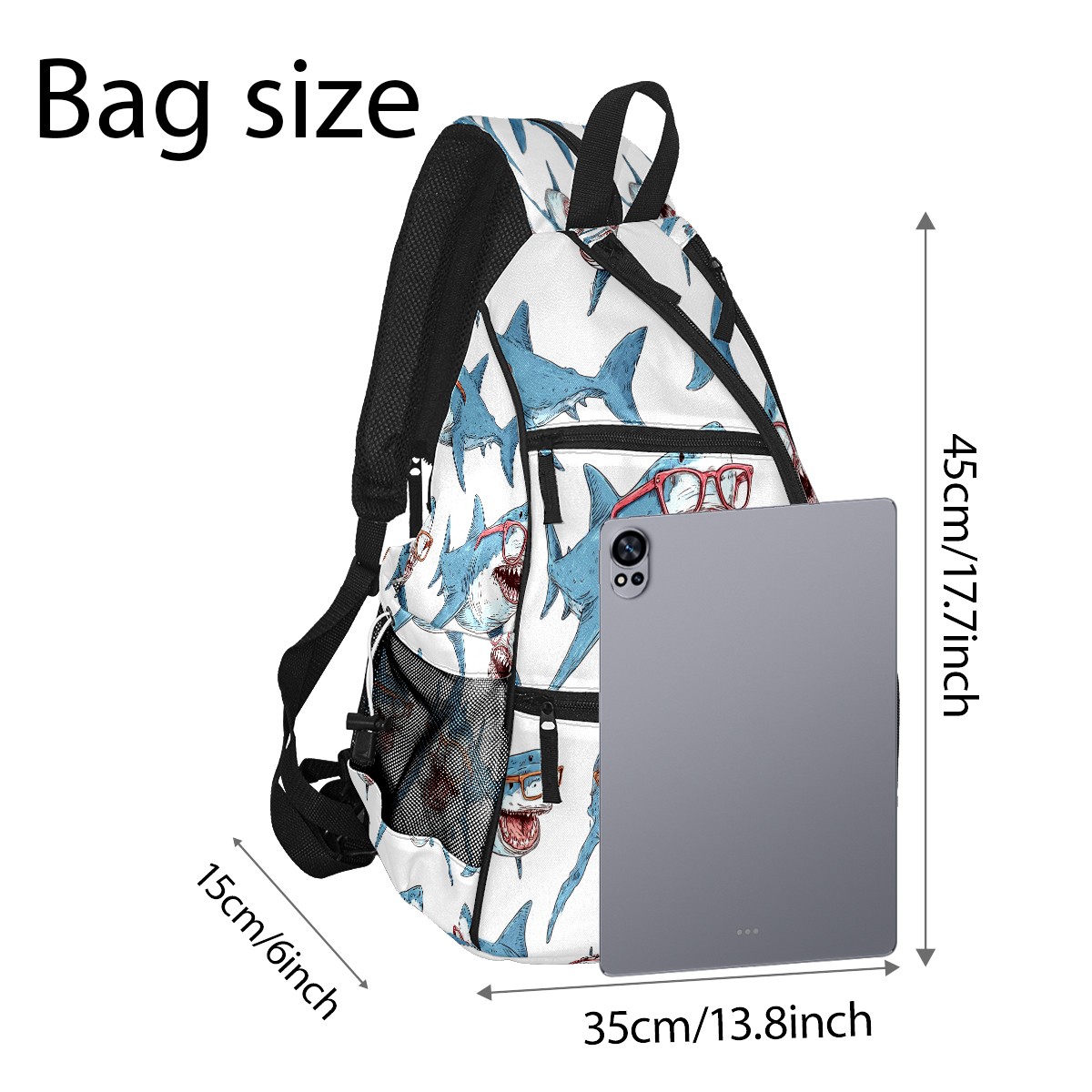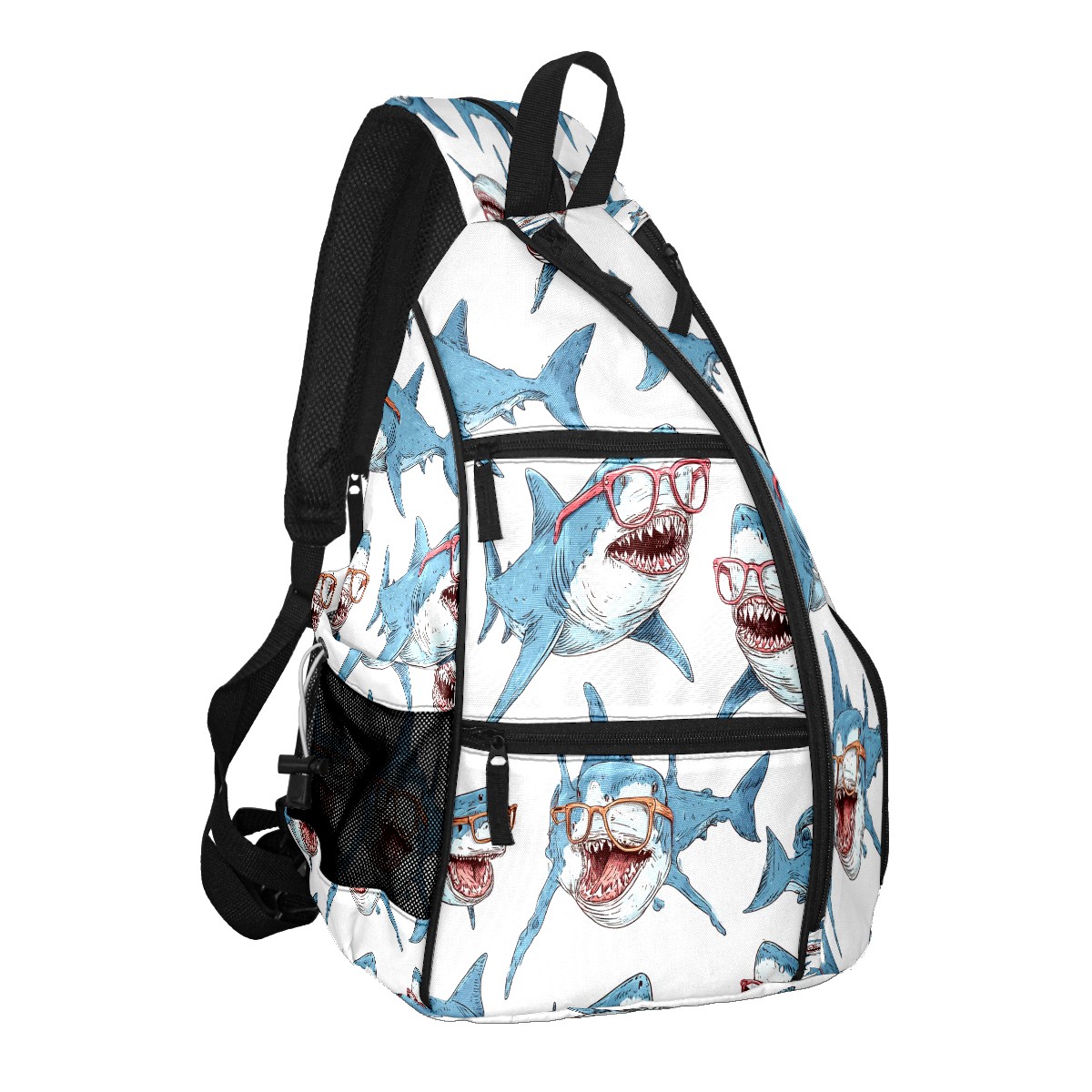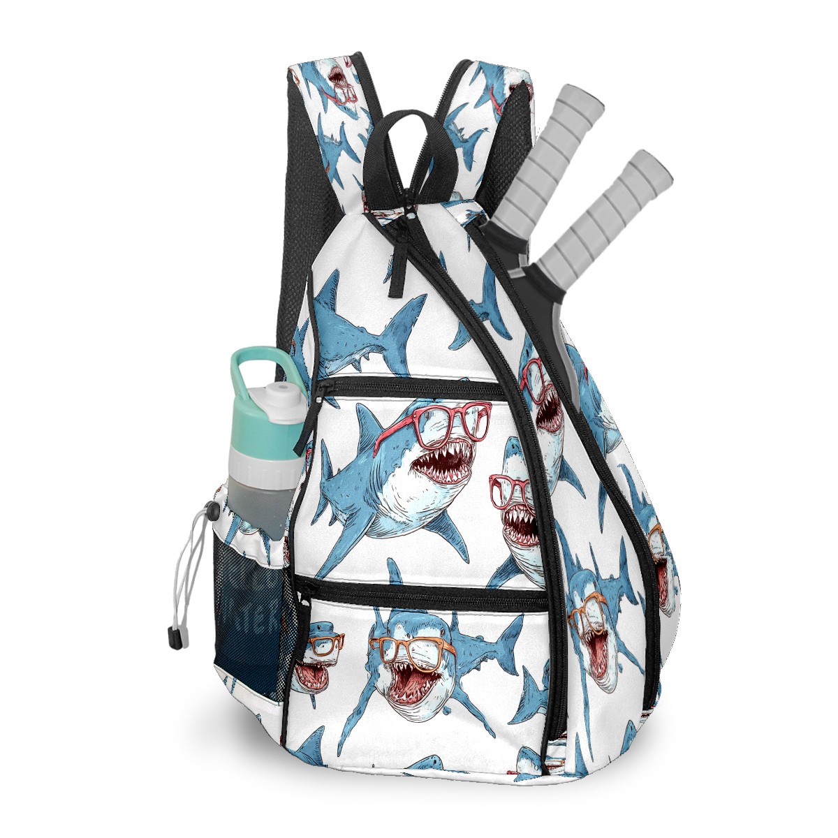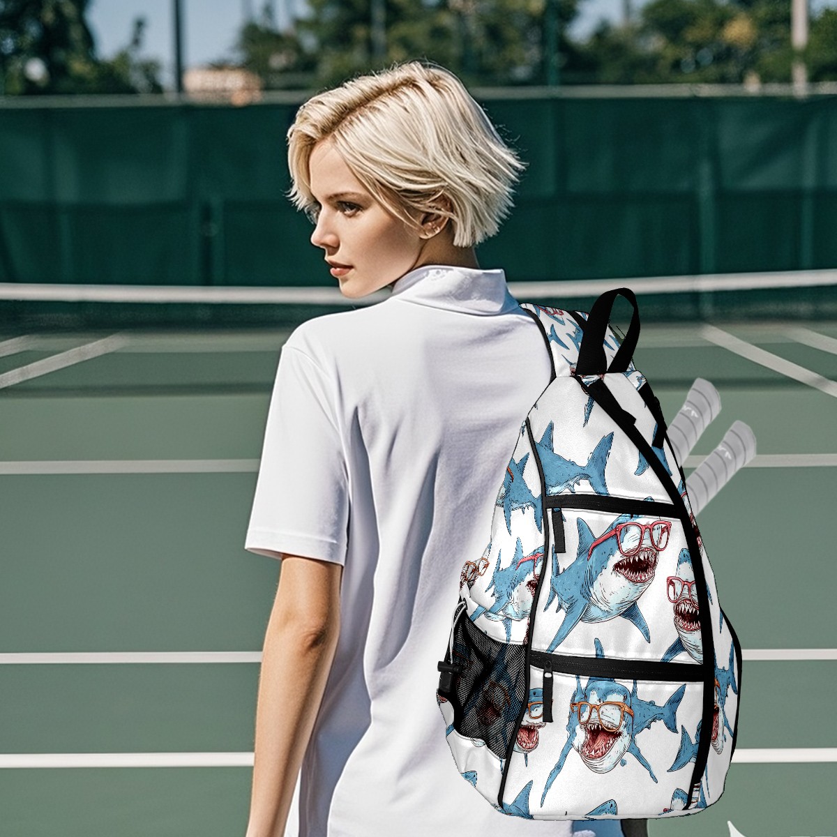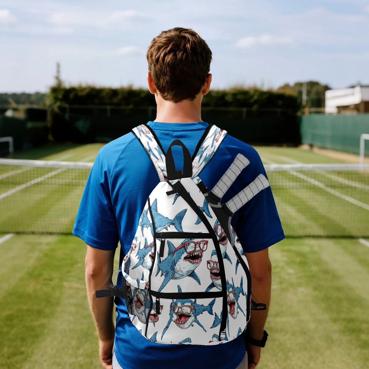 Print Pickleball Backpack Blue Funny Sharks | Padded 6-Paddle Compartment & Separate Shoe Bag | Multi-Pocket Sports & Gym Backpack for Tennis, Travel, Commute