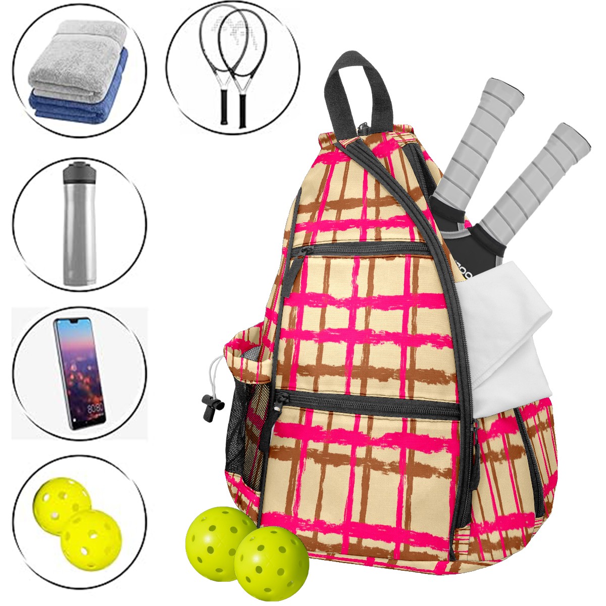 Print Pickleball Backpack Pink Brown Plaid | Padded 6-Paddle Compartment & Separate Shoe Bag | Multi-Pocket Sports & Gym Backpack for Tennis, Travel, Commute