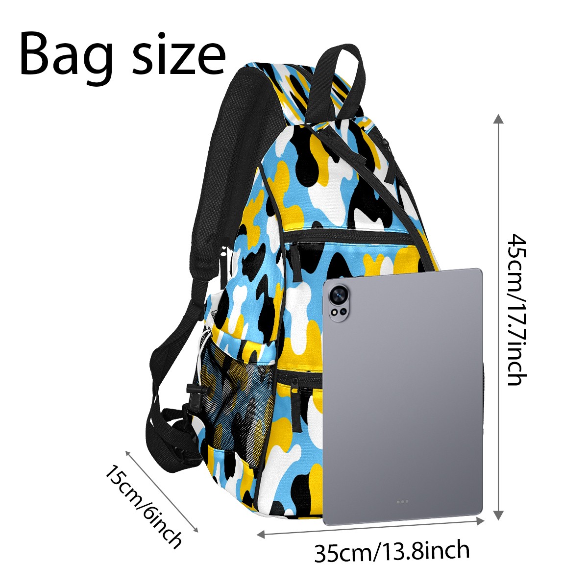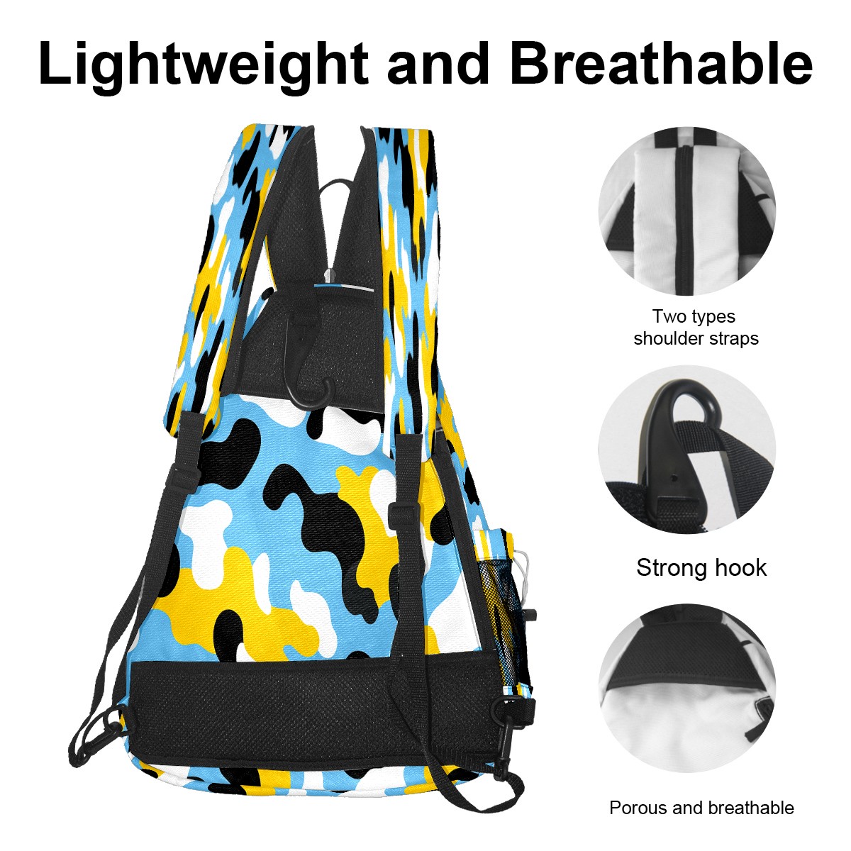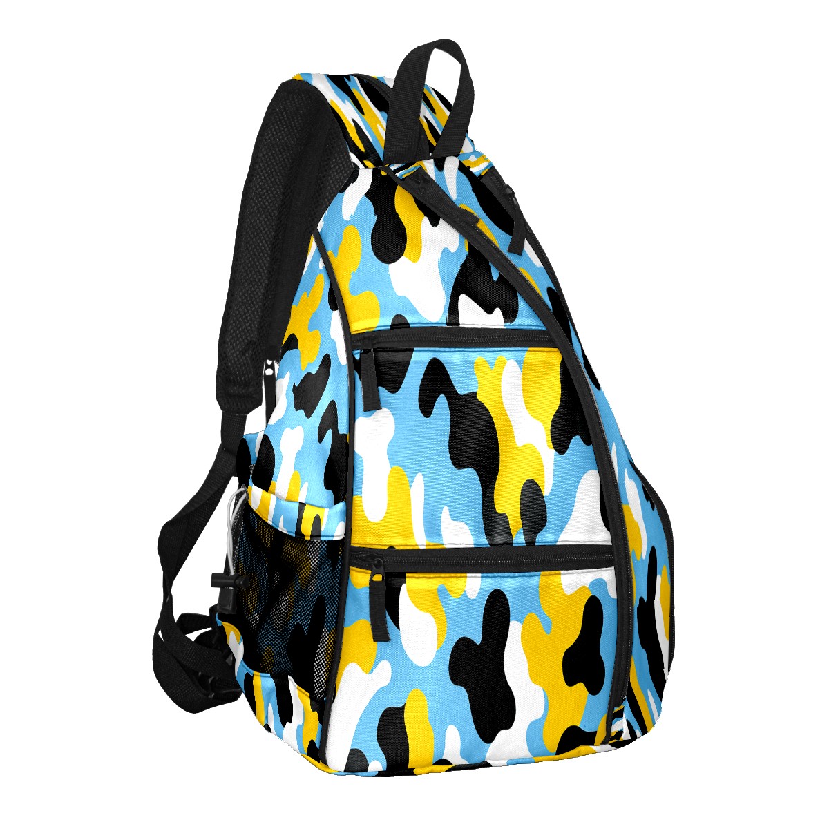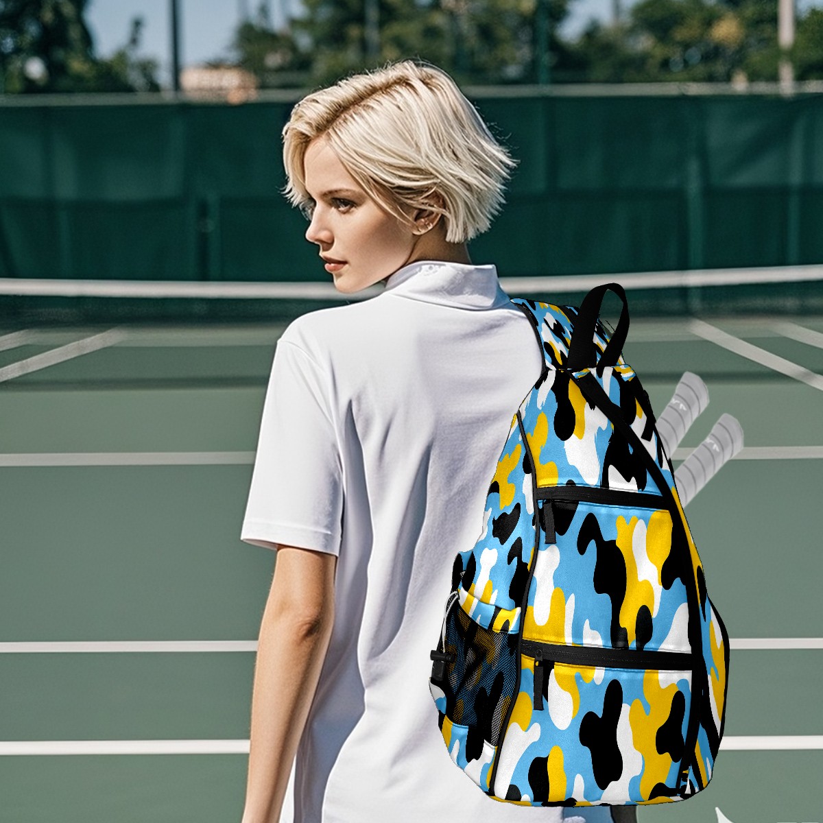 Print Pickleball Backpack Blue Yellow Camo | Padded 6-Paddle Compartment & Separate Shoe Bag | Multi-Pocket Sports & Gym Backpack for Tennis, Travel, Commute