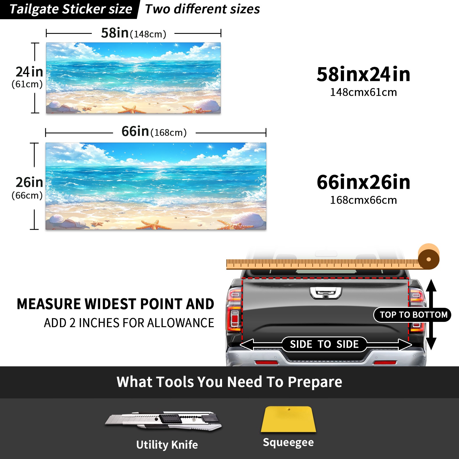• <p>Upgrade your truck’s appearance with our durable and easy-to-apply Tailgate Decal! Designed for pickup owners who value style and functionality, this vinyl decal offers a sleek, single-sided print with adhesive backing for a seamless look. Made from high-quality PET material, it’s built to resist water and wear, ensuring long-lasting performance in all conditions.Available in two versatile sizes—148x61cm (58x24in) and 168x66cm (66x26in)—this decal fits most truck tailgates perfectly. </p>