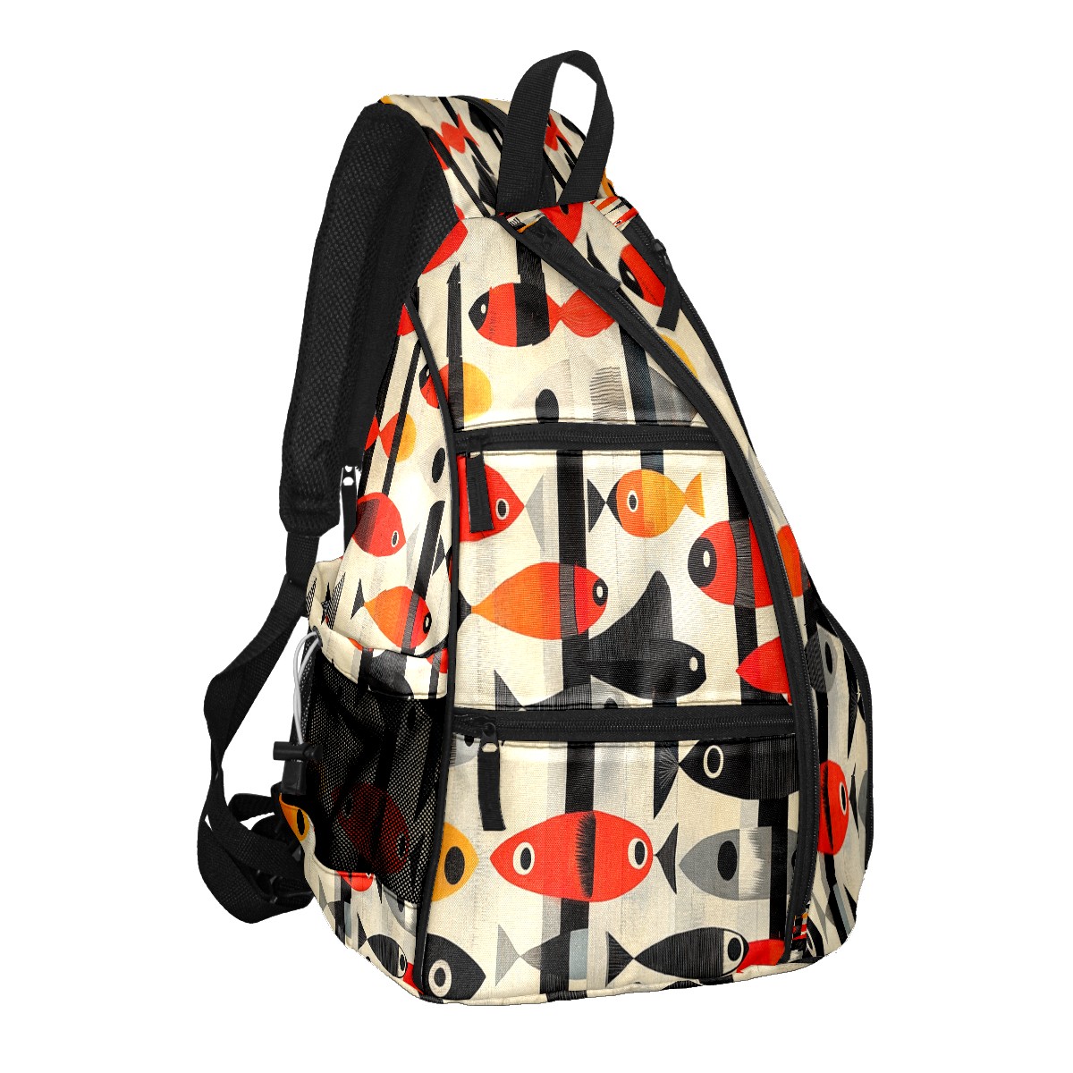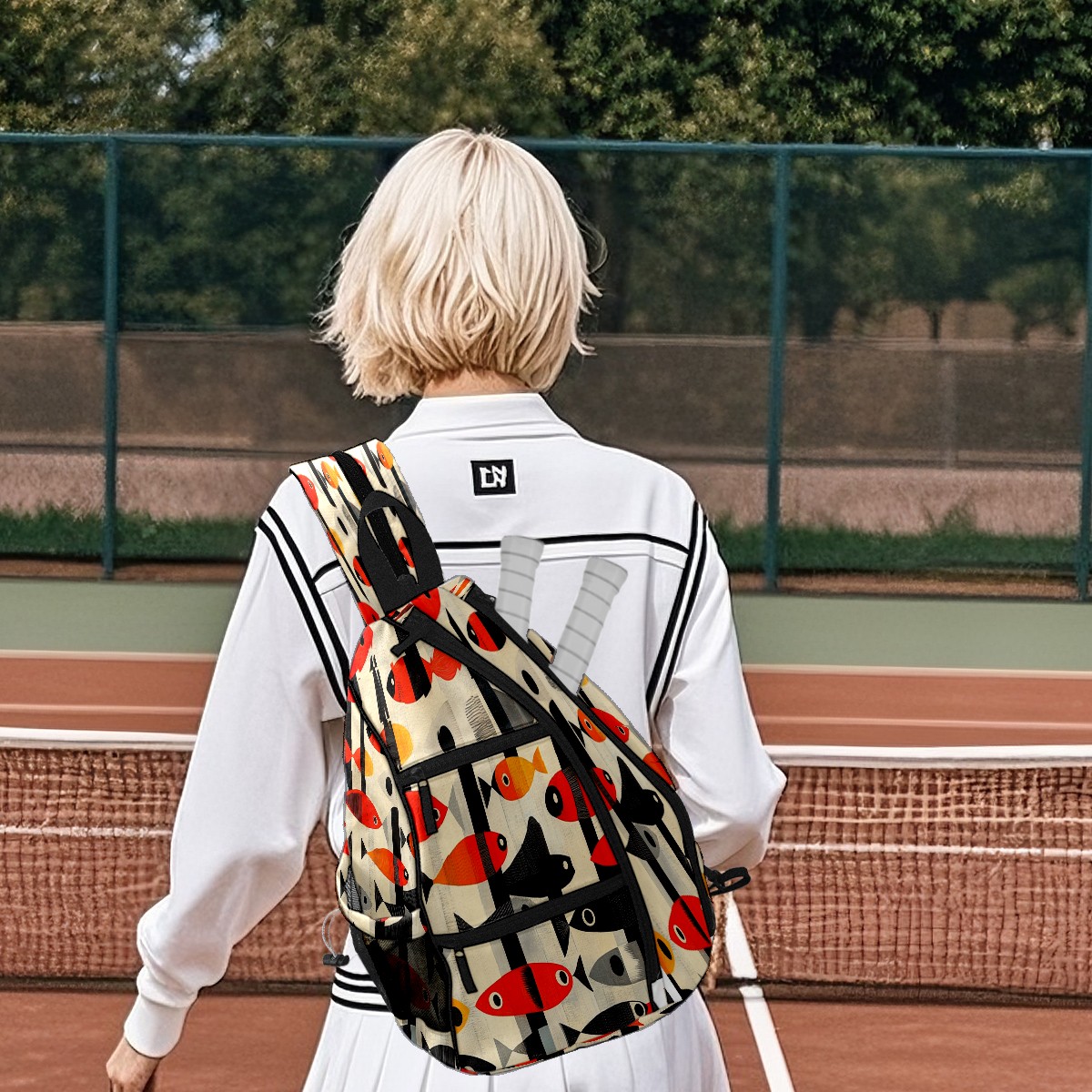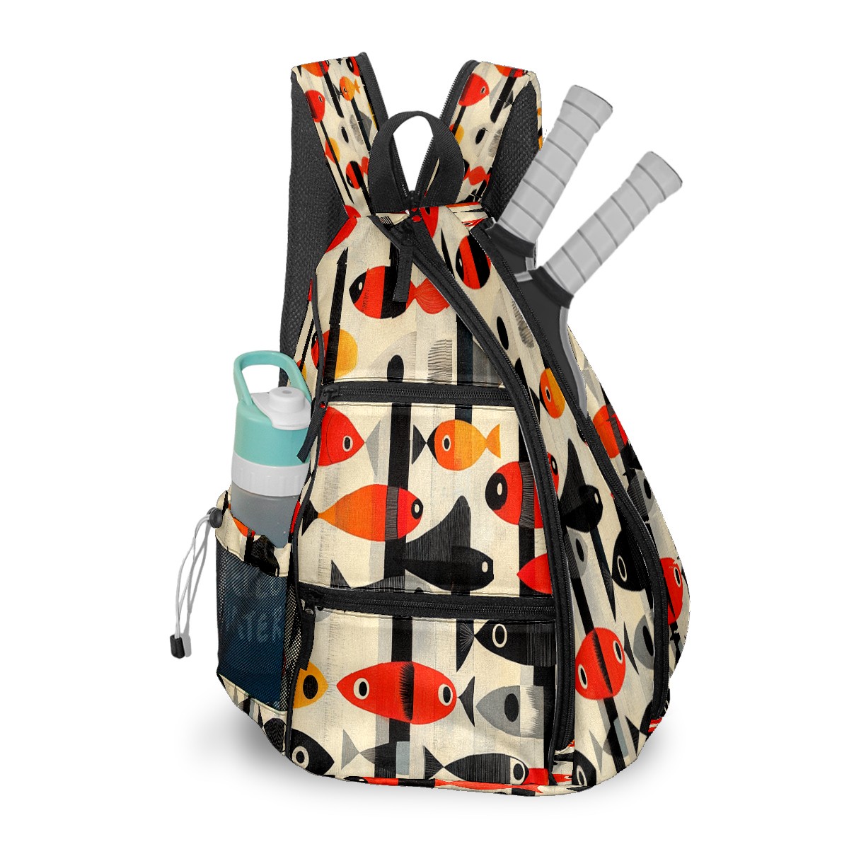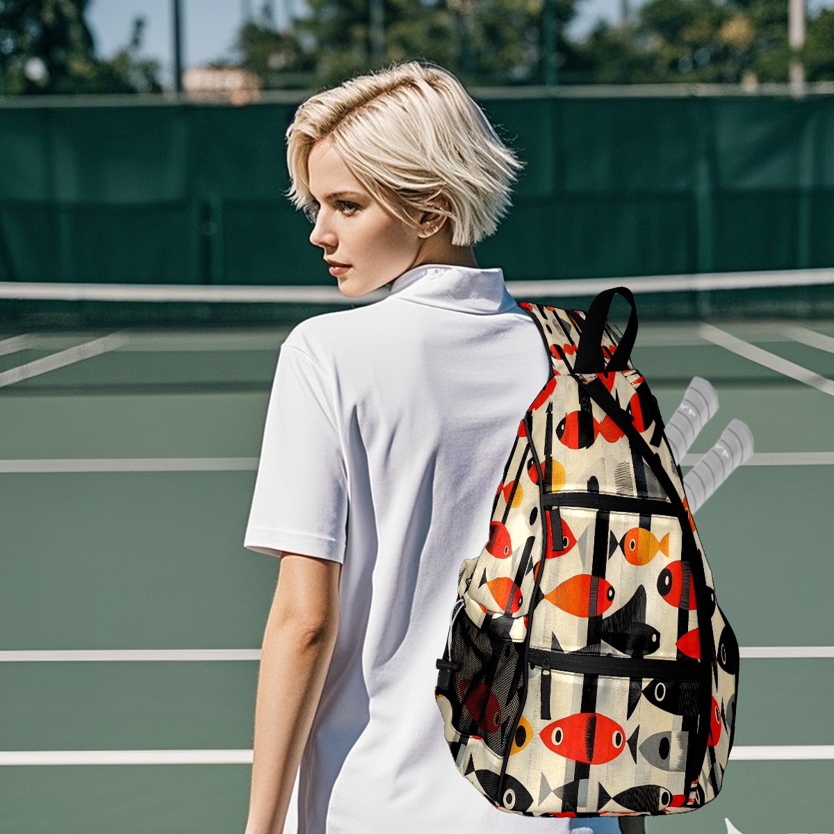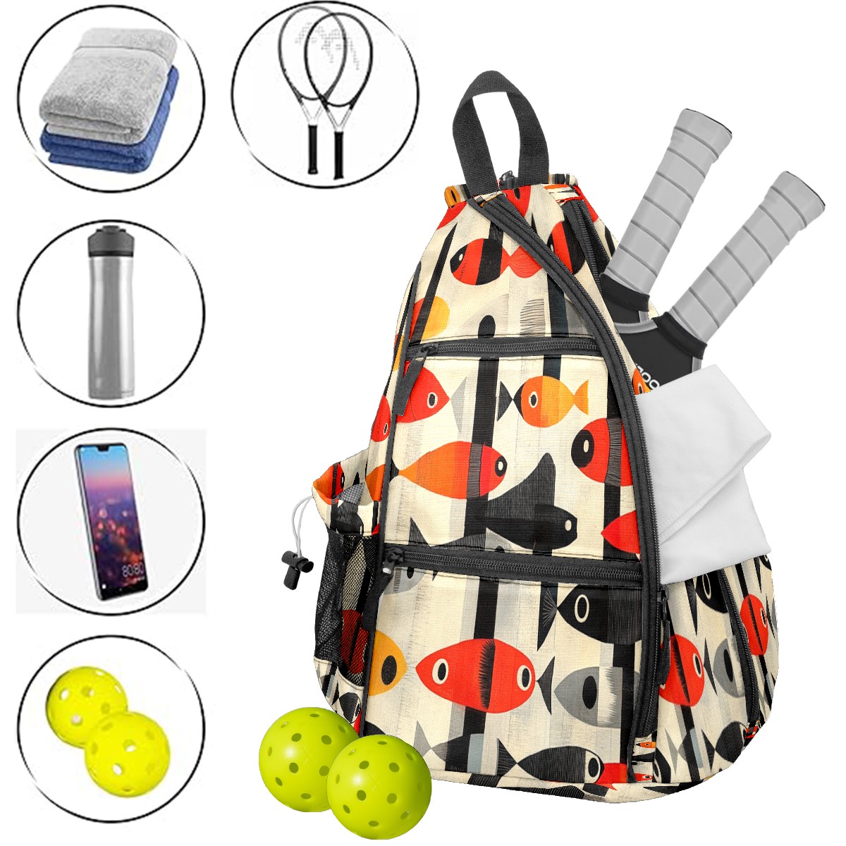 Pickleball Sling Bag for Women and Men - Backpack with Nylon Fabric/Woven Strap/Mesh Pocket/Fence Hook/Small Capacity/Adjustable Sling Bag Striped Fish