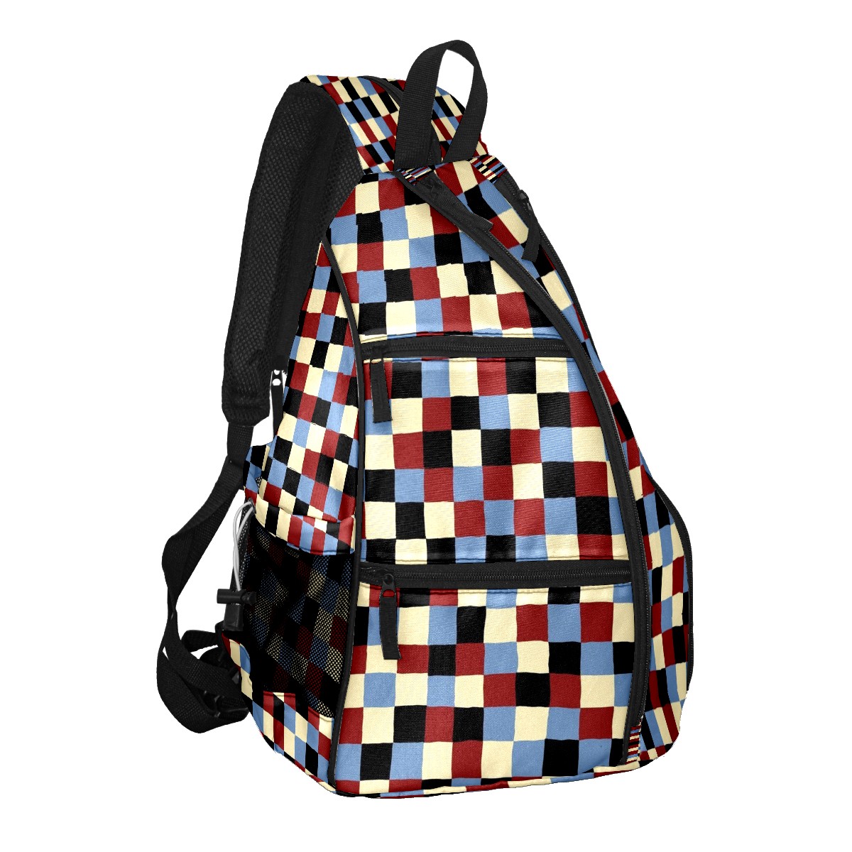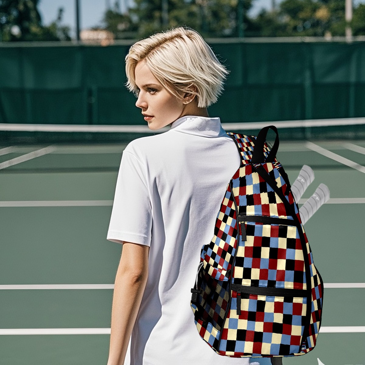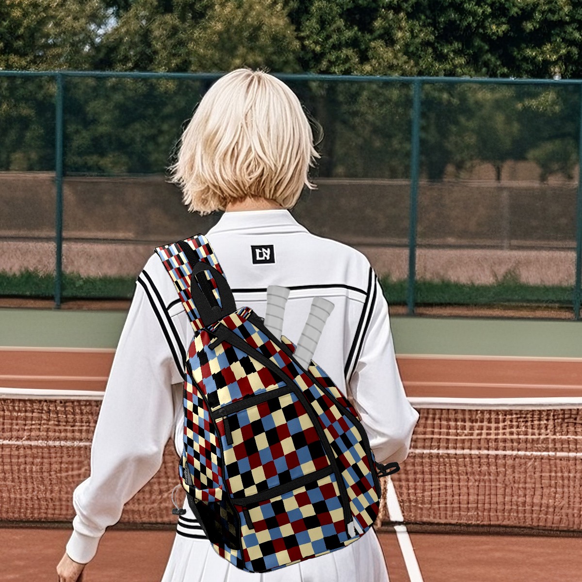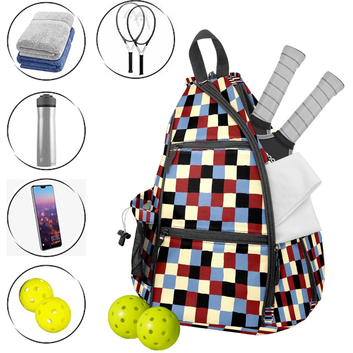 Pickleball Sling Bag for Women and Men - Backpack with Nylon Fabric/Woven Strap/Mesh Pocket/Fence Hook/Small Capacity/Adjustable Sling Bag Plaid Pattern