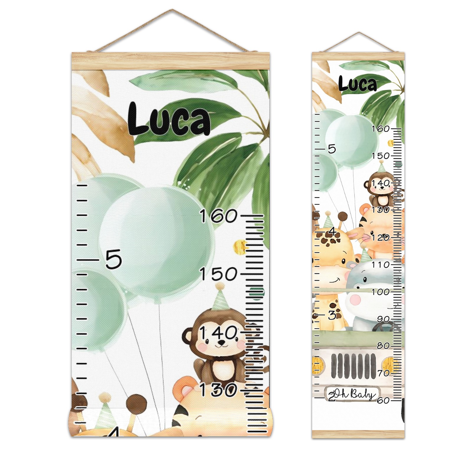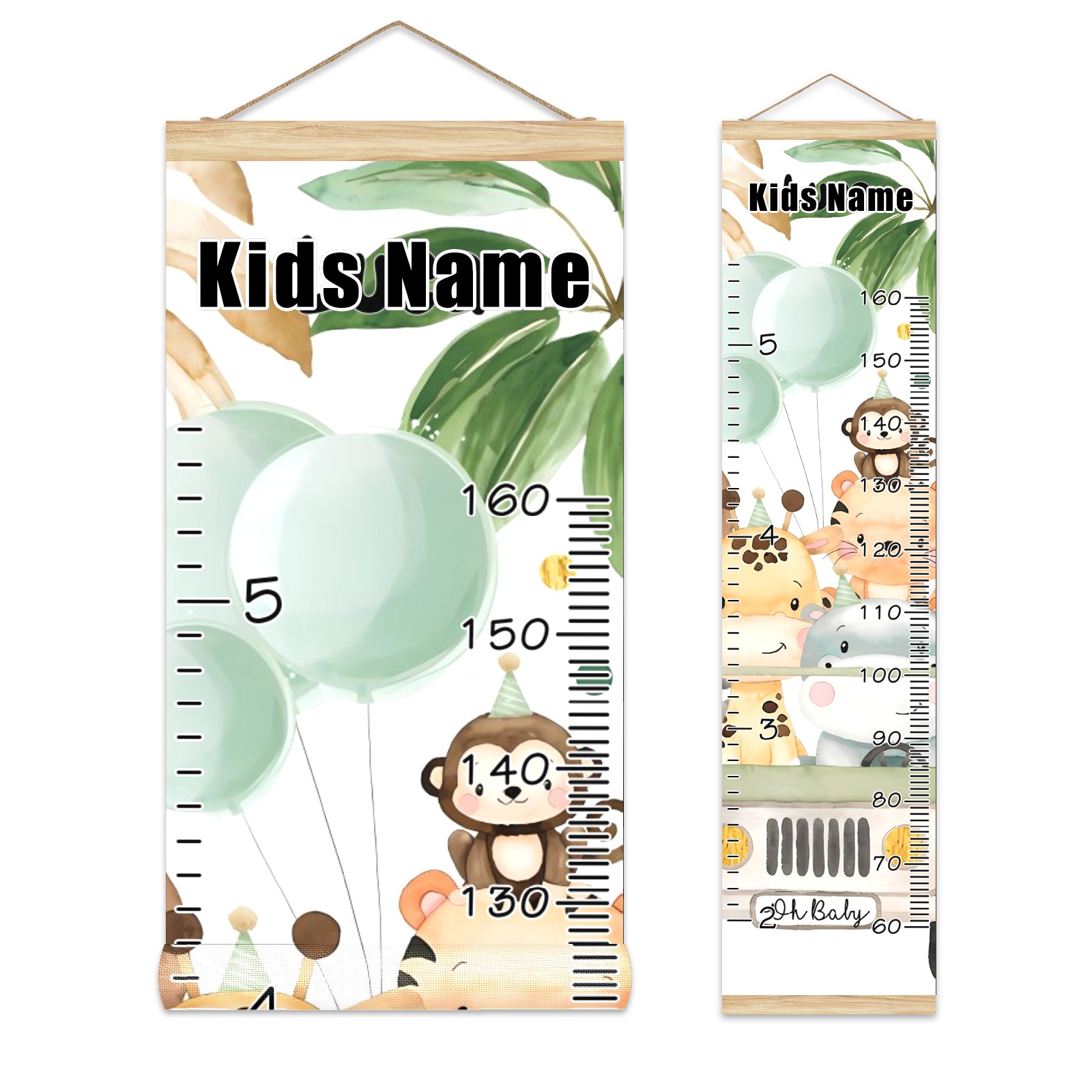 Personalized Kids Name Growth Chart Ruler for Wall Wood Frame Canvas Height Measure Chart 13.4x56 in Hanging Growth Chart Watercolor Safari Animals Jungle Greenery11.24 Boys Girls Room Decor