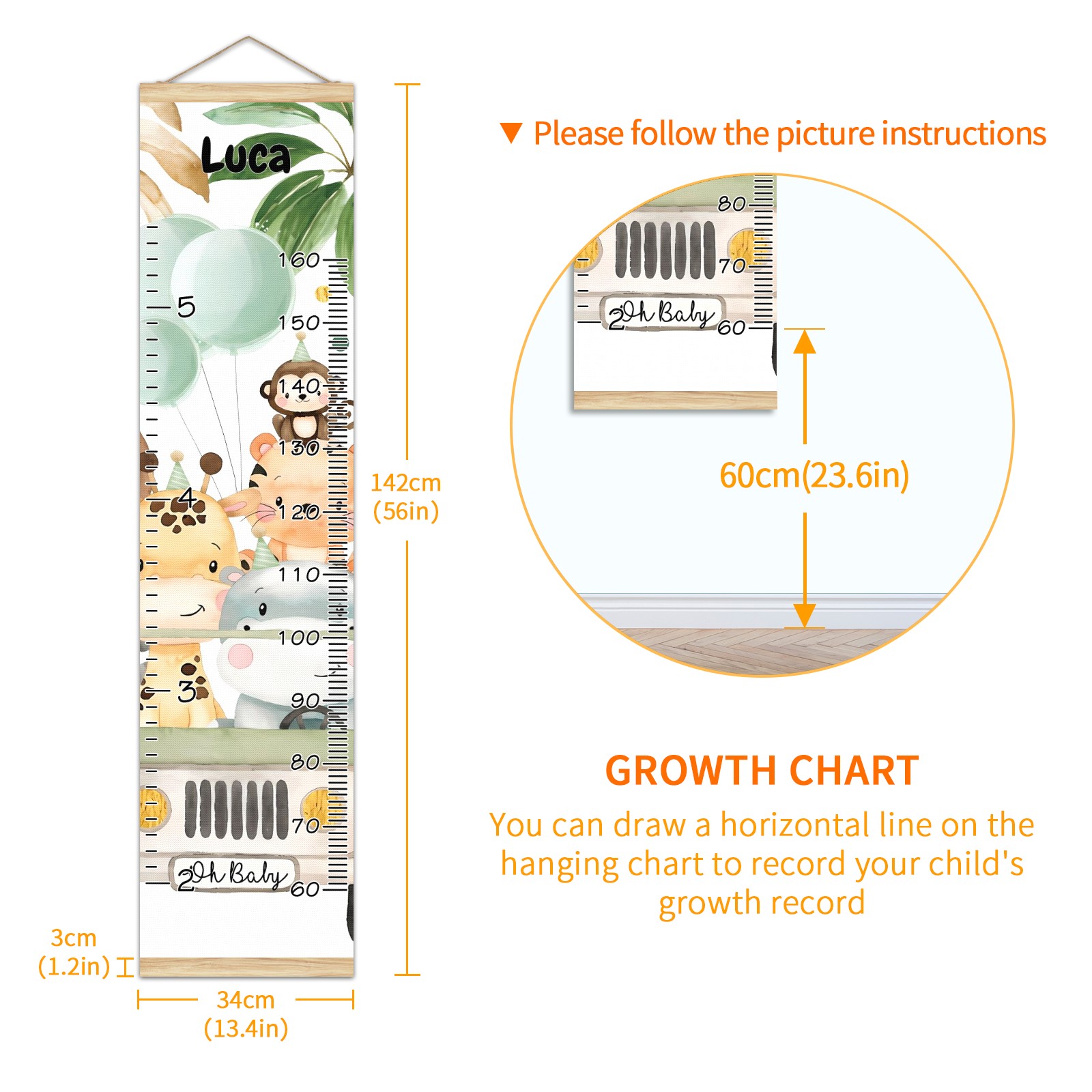 <p><b>Features:</b></p> <p>Rope for Hanging</p> <p>Material: Linen + Wood</p> <p>Dimensions: 13.4x56 inches</p> <p>Package Included: 1 * Baby Growth Chart</p> <p><b>Baby height growth chart can be used anywhere</b></p> <p>Ideal for kids nursery decoration, kids bedroom, interior walls or windows, playroom, living room, homedecoration.Add name and make the growth chart special!</p> <p><b>Easy to fold and carry</b></p> <p>With rope at the top of the growth chart, it is easy to install and remove.You can fold it and unfold any time any where.</p> <p><b>Perfect Gift Idea for Kids</b></p> <p>Environmental and non-toxic for kids use, it must be a perfect gift for baby, kids, girls, and boys.This is a best choice for your friend who have kids or baby as a popular gift.</p> <p><b>Easy to read</b></p> <p>Measurement accrate with 2 scales, Centimeters and feet. The letters are big enough, very easy to read.</p> <p><b>60cm(23.6inch) Over Ground Design</b></p> <p>Not only can protect from dust and other damage, but also will not interfere in floor cleaning.</p>