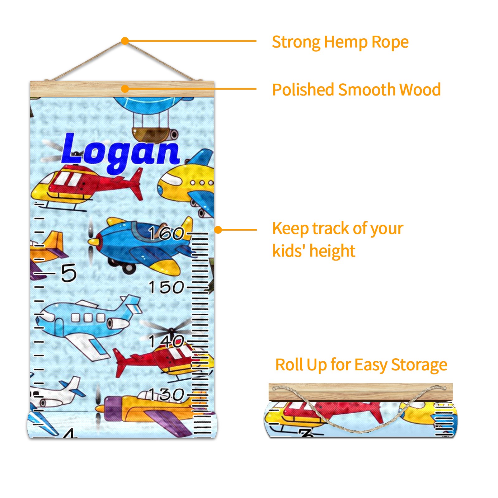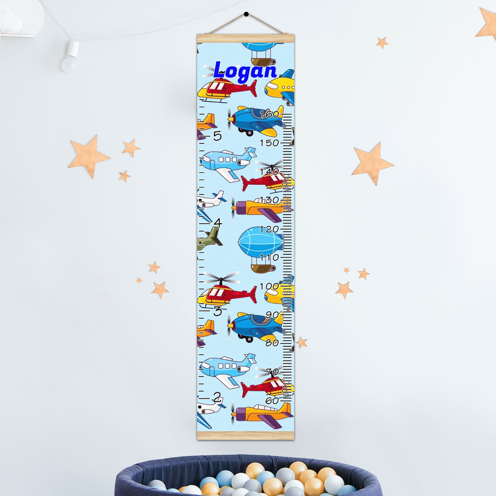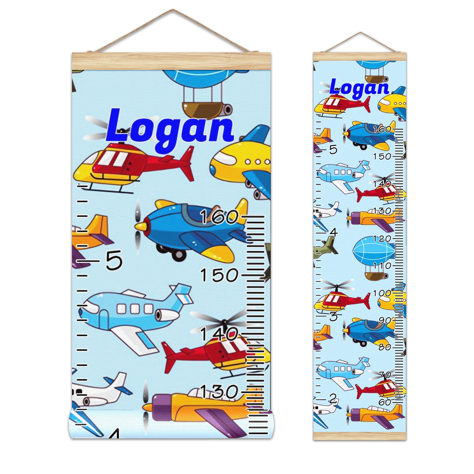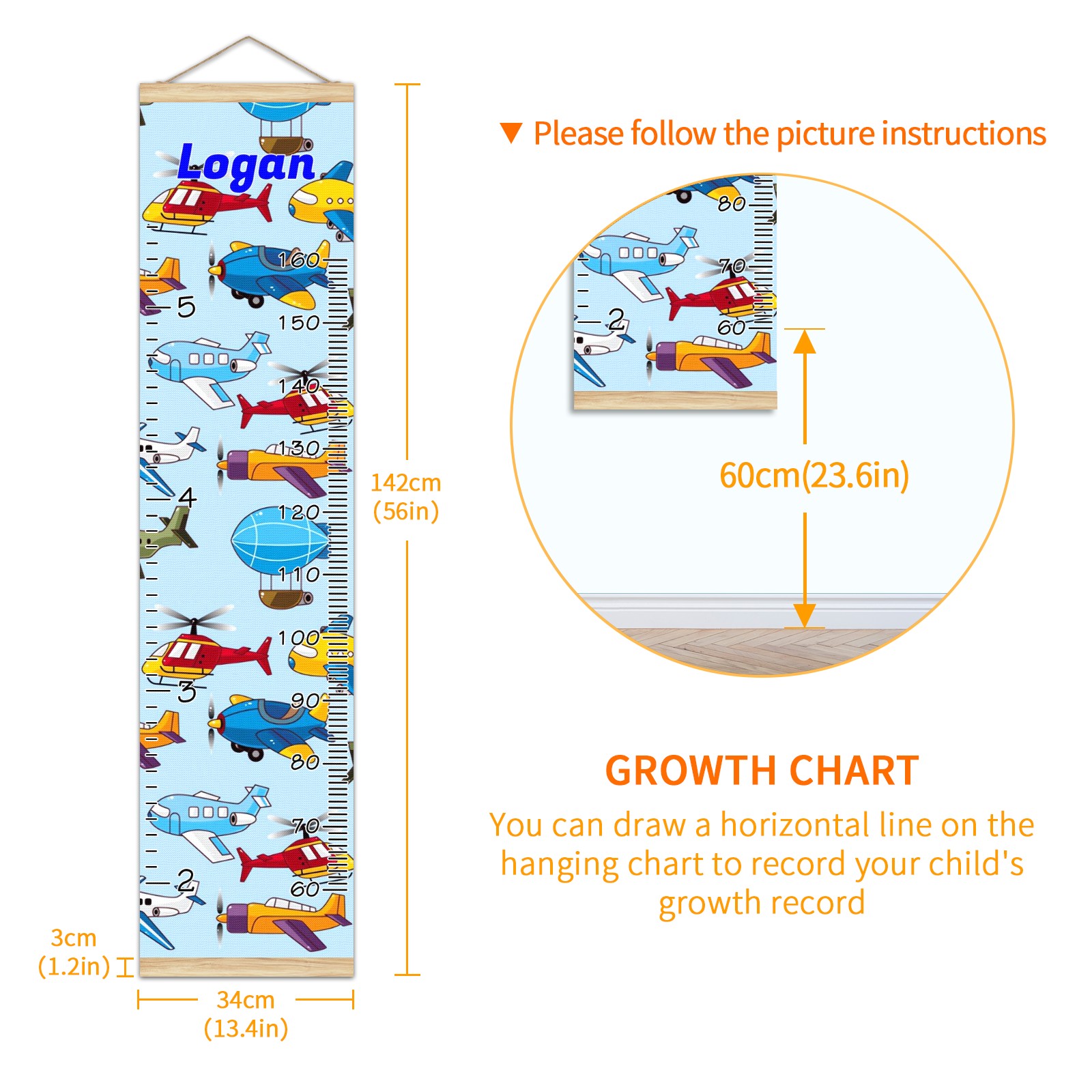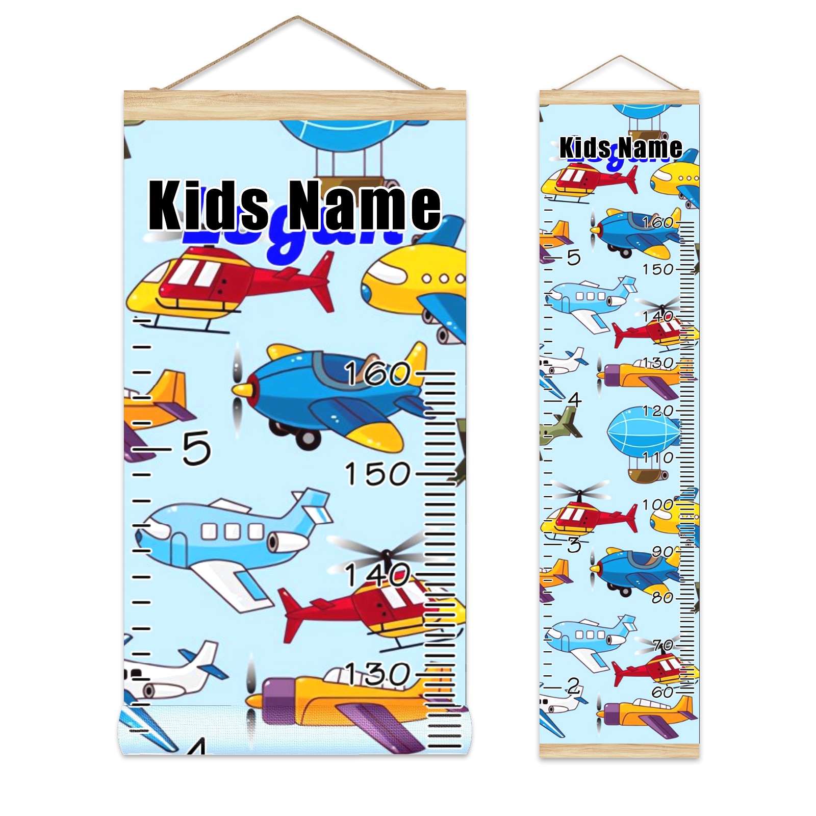 Personalized Kids Name Growth Chart Ruler for Wall Wood Frame Canvas Height Measure Chart 13.4x56 in Hanging Growth Chart Cartoon Airplane Aircraft11.24 Boys Girls Room Decor