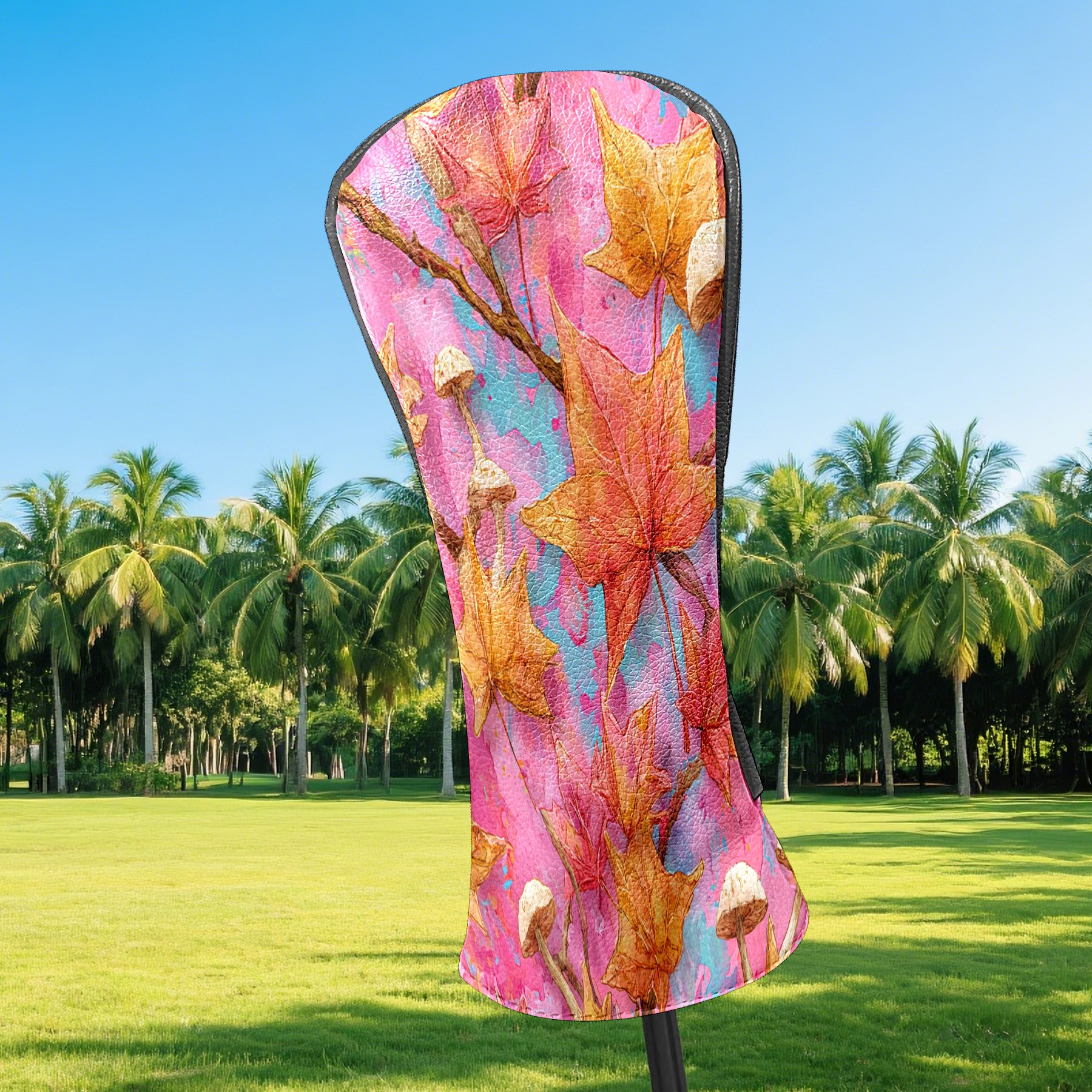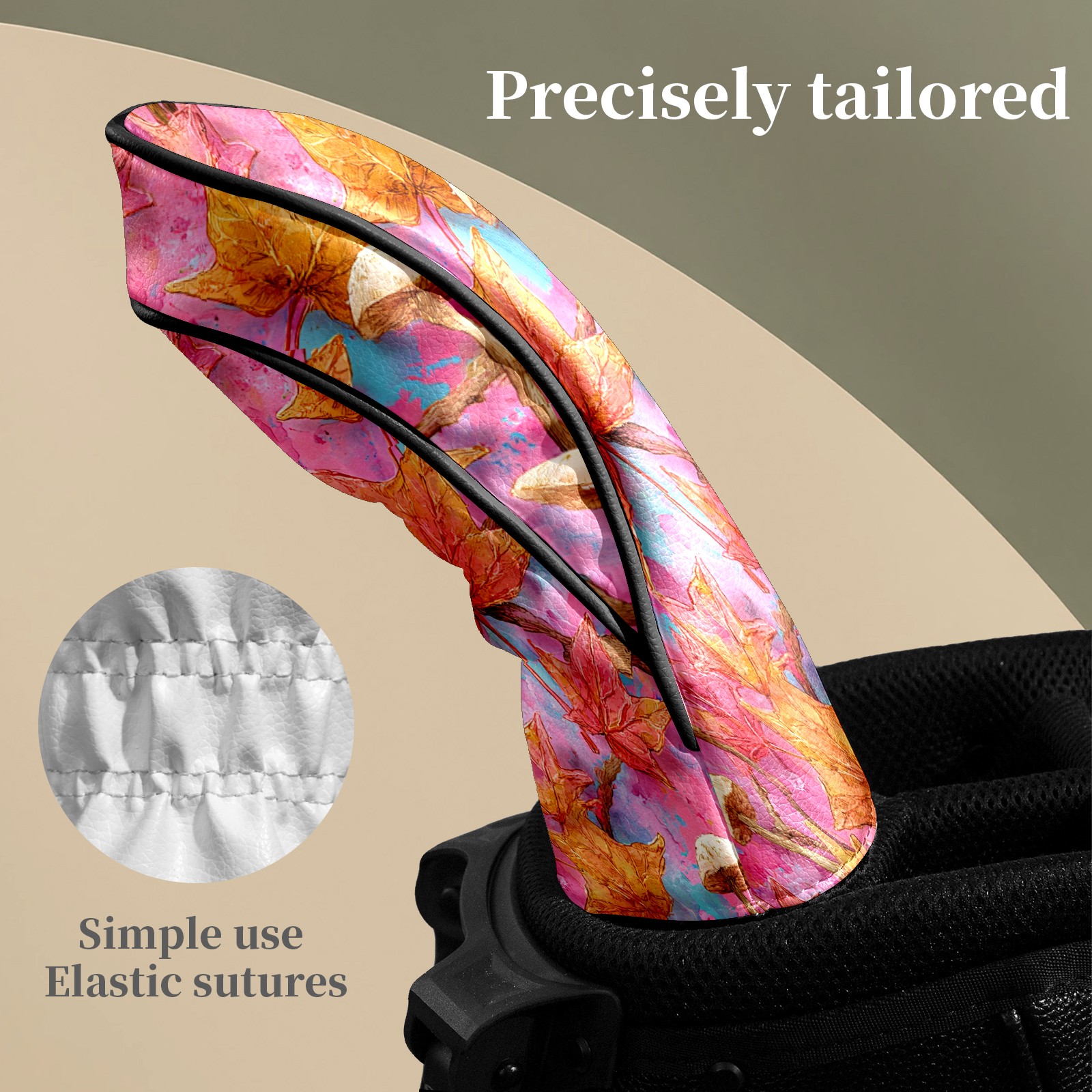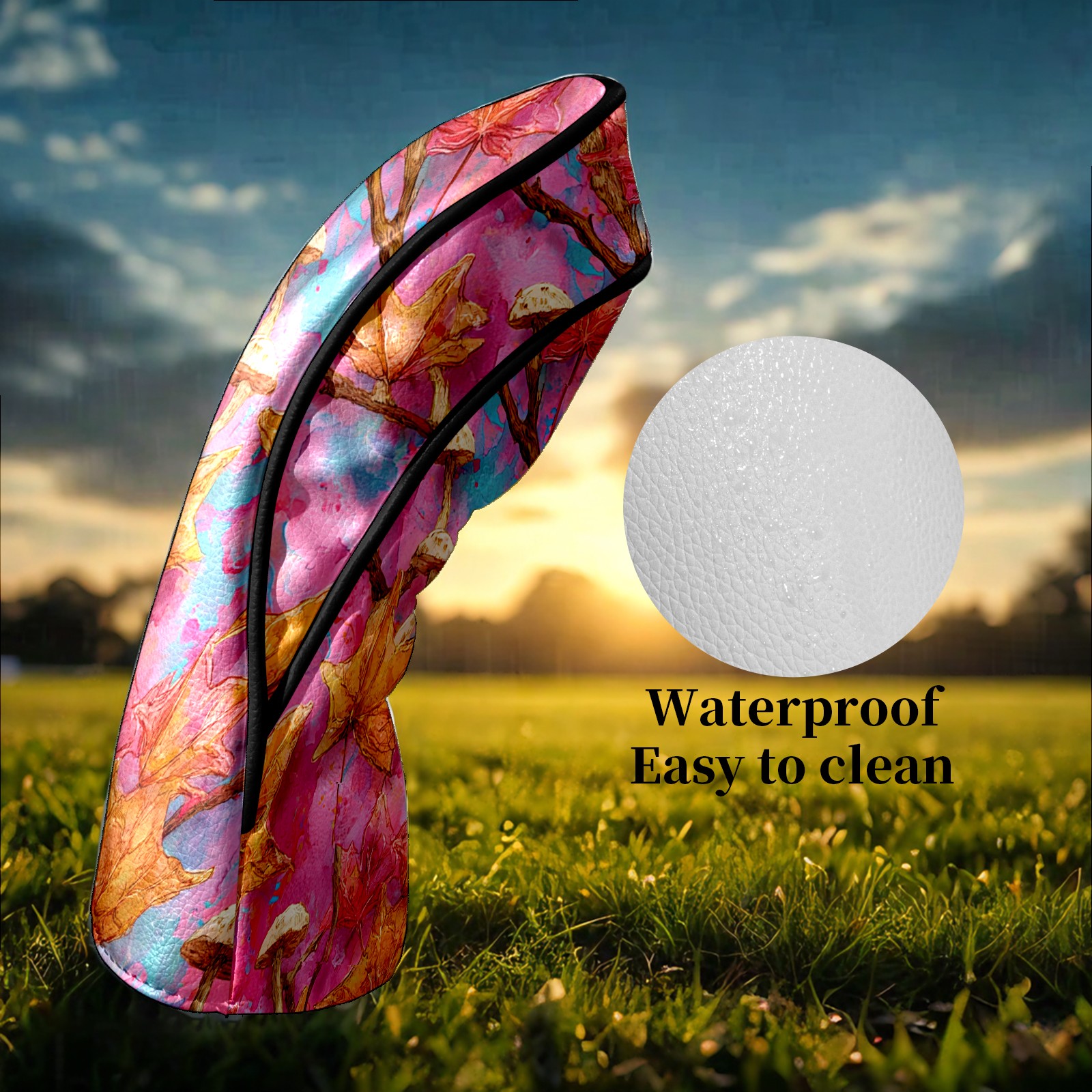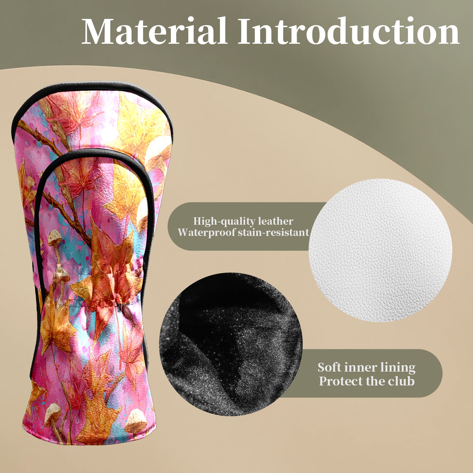 Counullo Golf Head Covers - Pink Autumn Leaves Driver Fairway Headcover, Durable PU Leather & Soft Velvet Lining, Secure Elastic Band, Perfect Christmas Golf Gift for Men