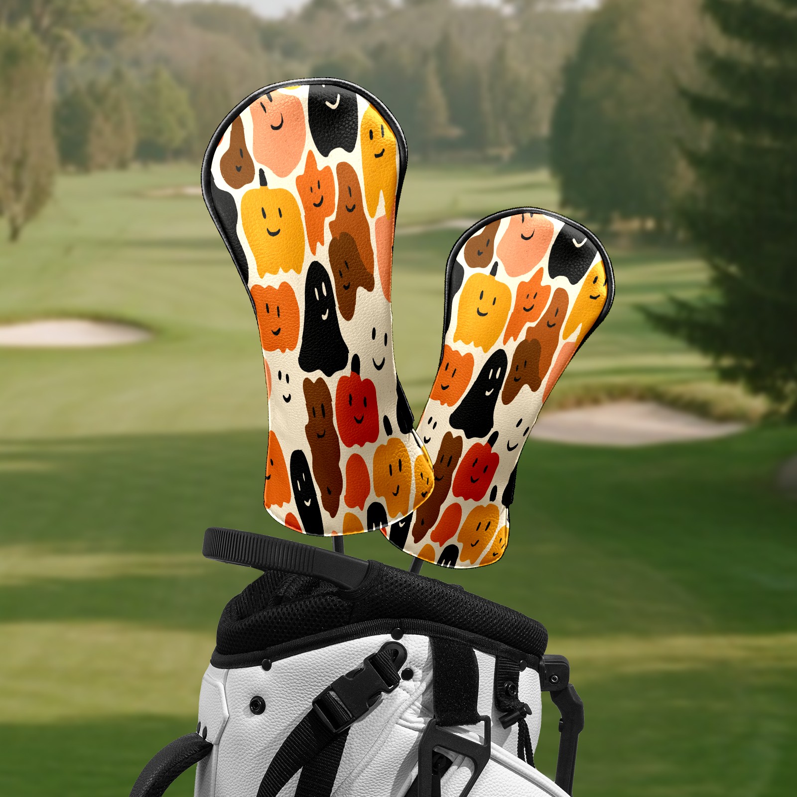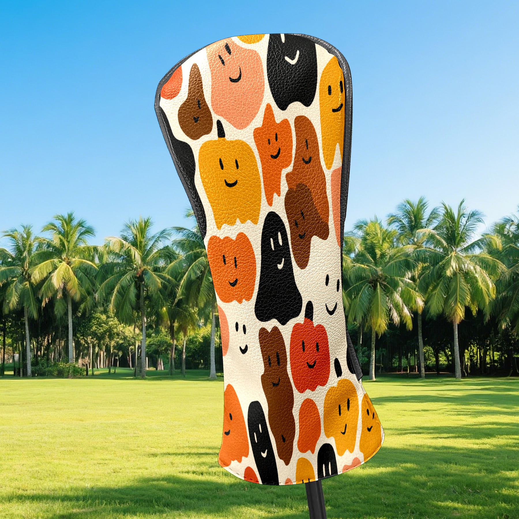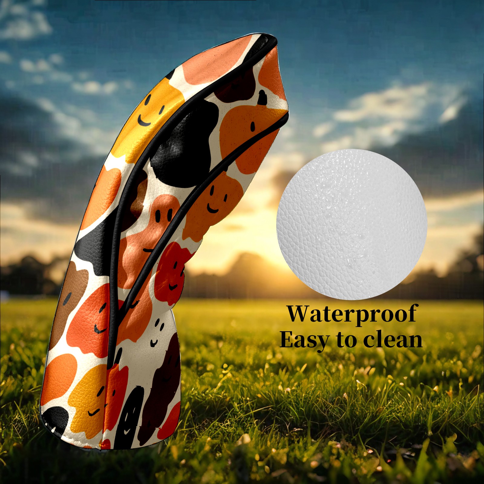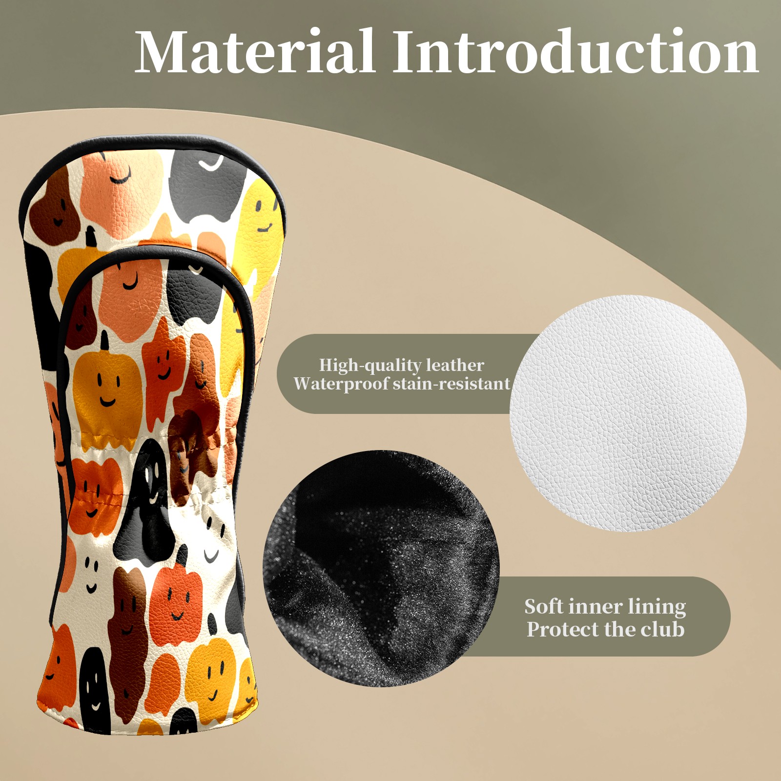 Counullo Golf Head Covers - Orange Halloween Faces Driver Fairway Headcover, Durable PU Leather & Soft Velvet Lining, Secure Elastic Band, Perfect Christmas Golf Gift for Men