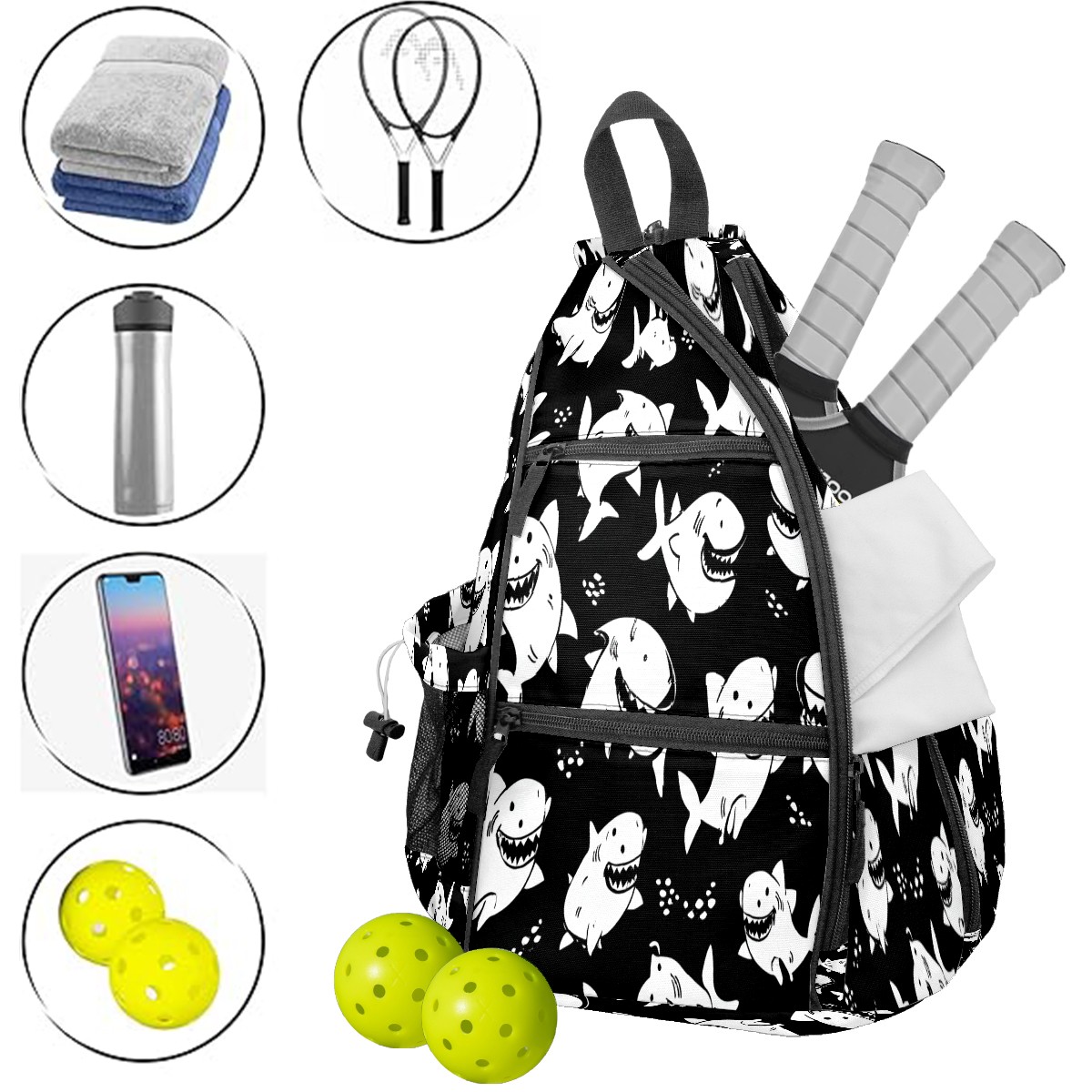 Pickleball Sling Bag for Women and Men - Backpack with Nylon Fabric/Woven Strap/Mesh Pocket/Fence Hook/Adjustable Bag Black Funny Sharks