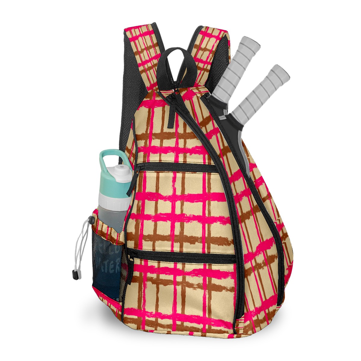 Pickleball Sling Bag for Women and Men - Backpack with Nylon Fabric/Woven Strap/Mesh Pocket/Fence Hook/Adjustable Bag Pink Brown Plaid