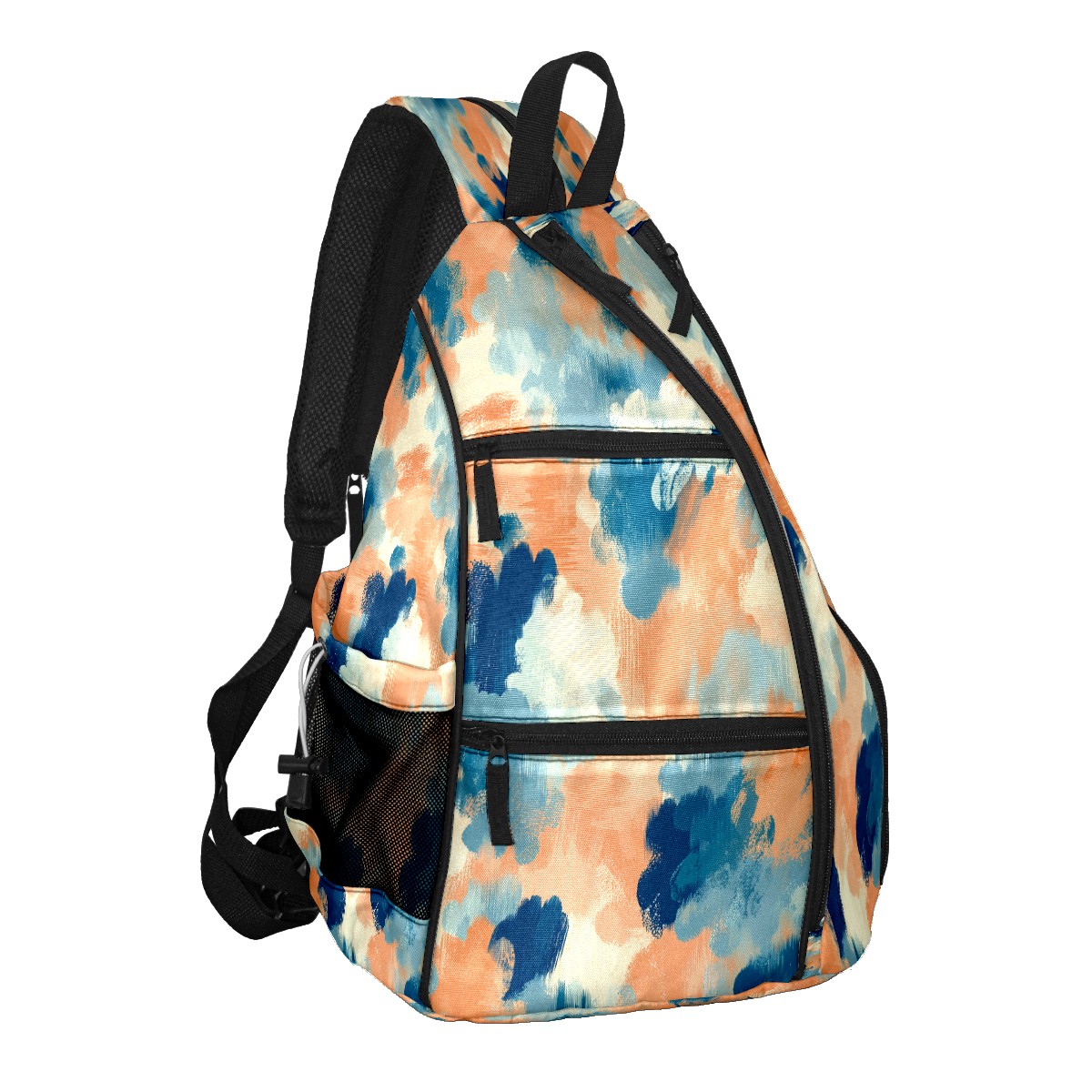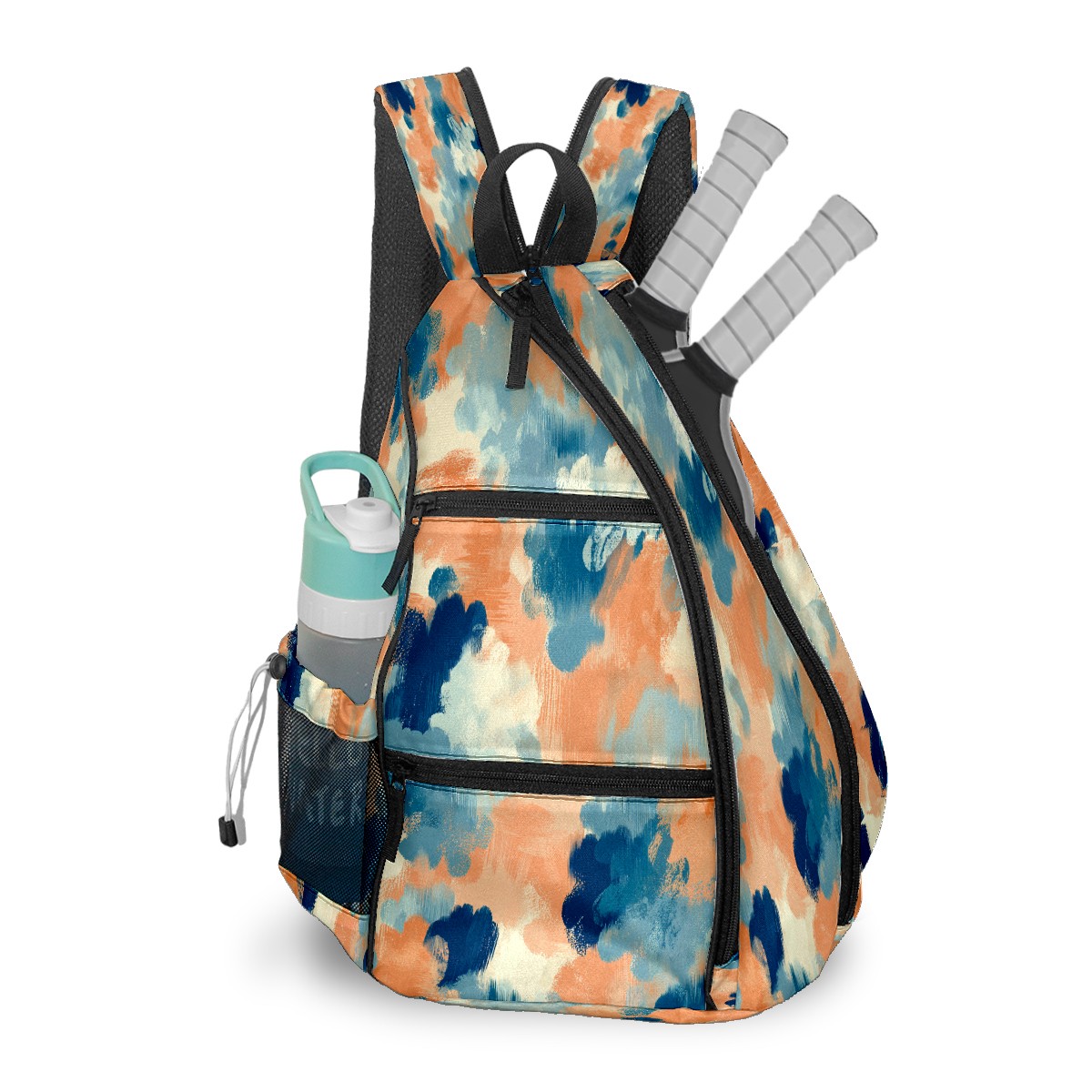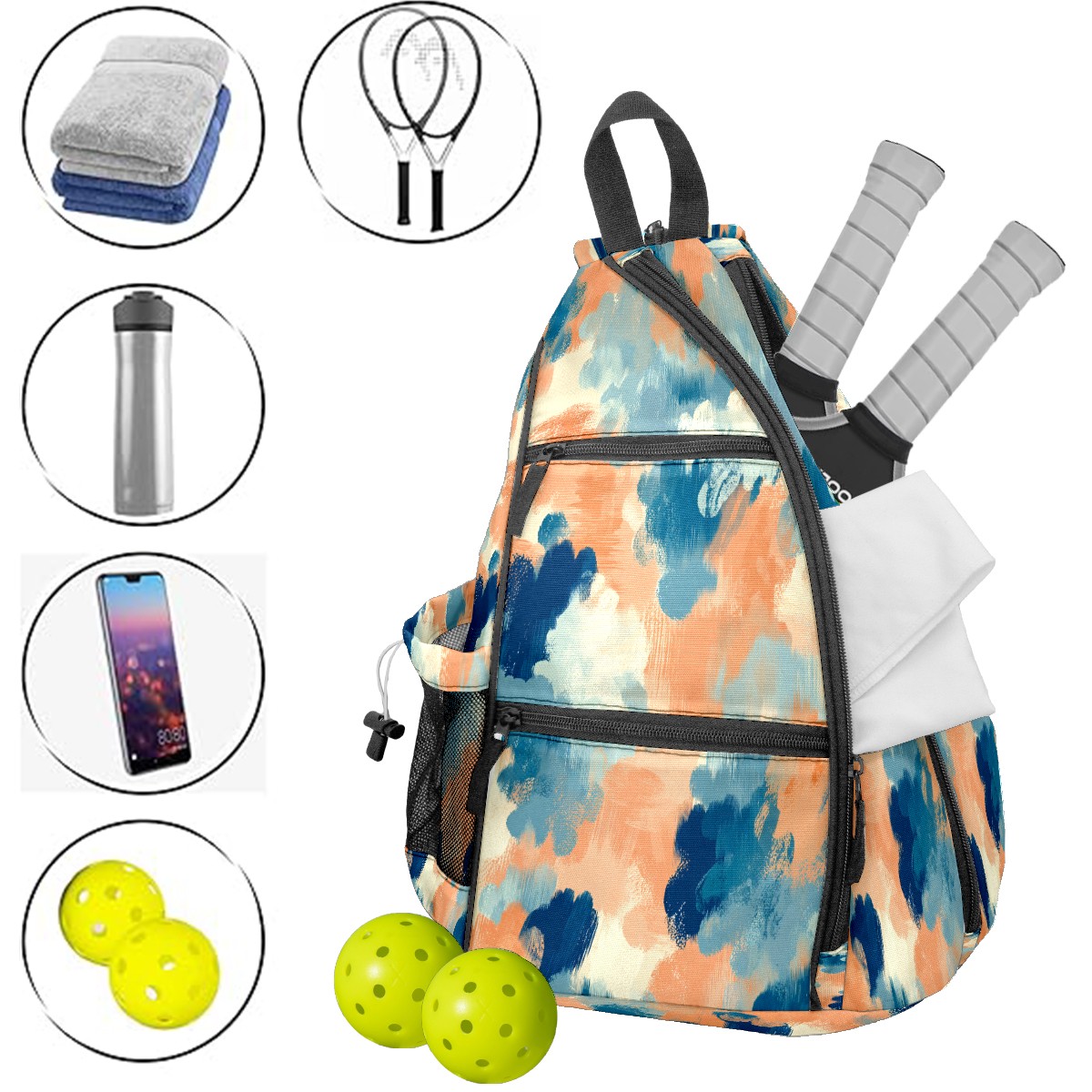Pickleball Sling Bag for Women and Men - Backpack with Nylon Fabric/Woven Strap/Mesh Pocket/Fence Hook/Adjustable Bag Orange Blue Watercolor