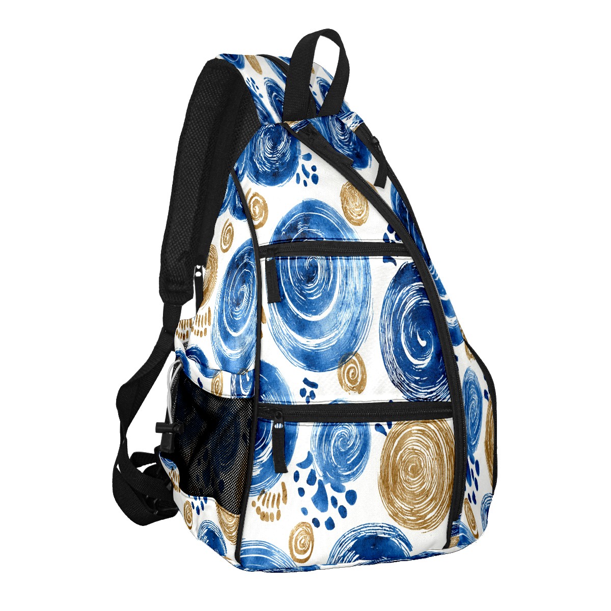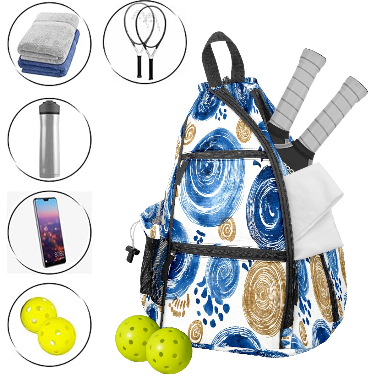 Pickleball Sling Bag for Women and Men - Backpack with Nylon Fabric/Woven Strap/Mesh Pocket/Fence Hook/Adjustable Bag Blue Swirls