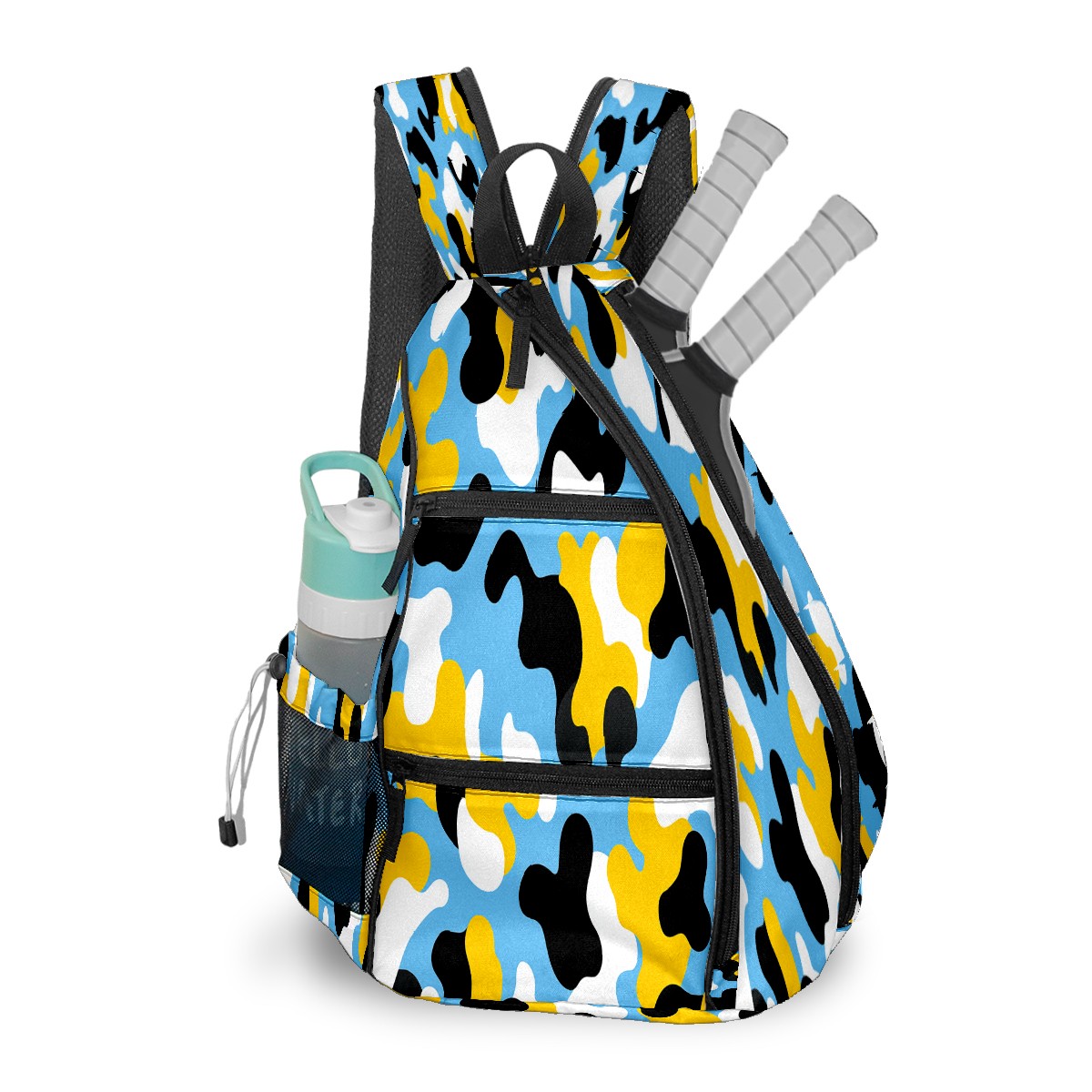 Pickleball Sling Bag for Women and Men - Backpack with Nylon Fabric/Woven Strap/Mesh Pocket/Fence Hook/Adjustable Bag Blue Yellow Camo