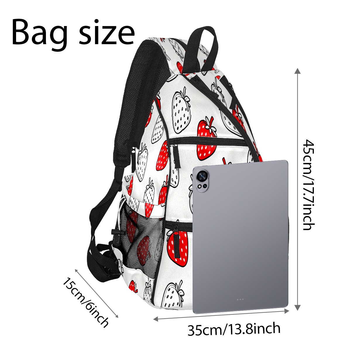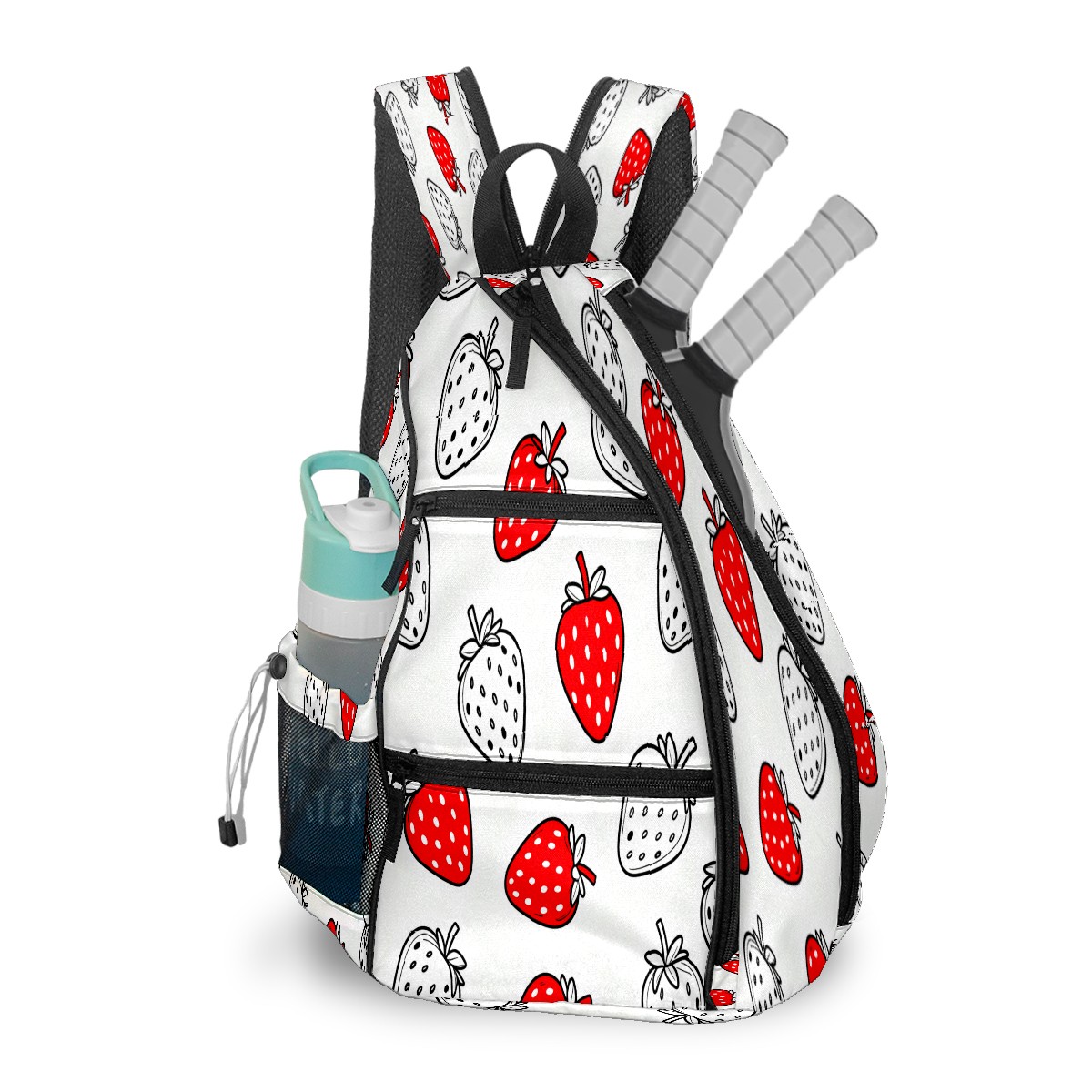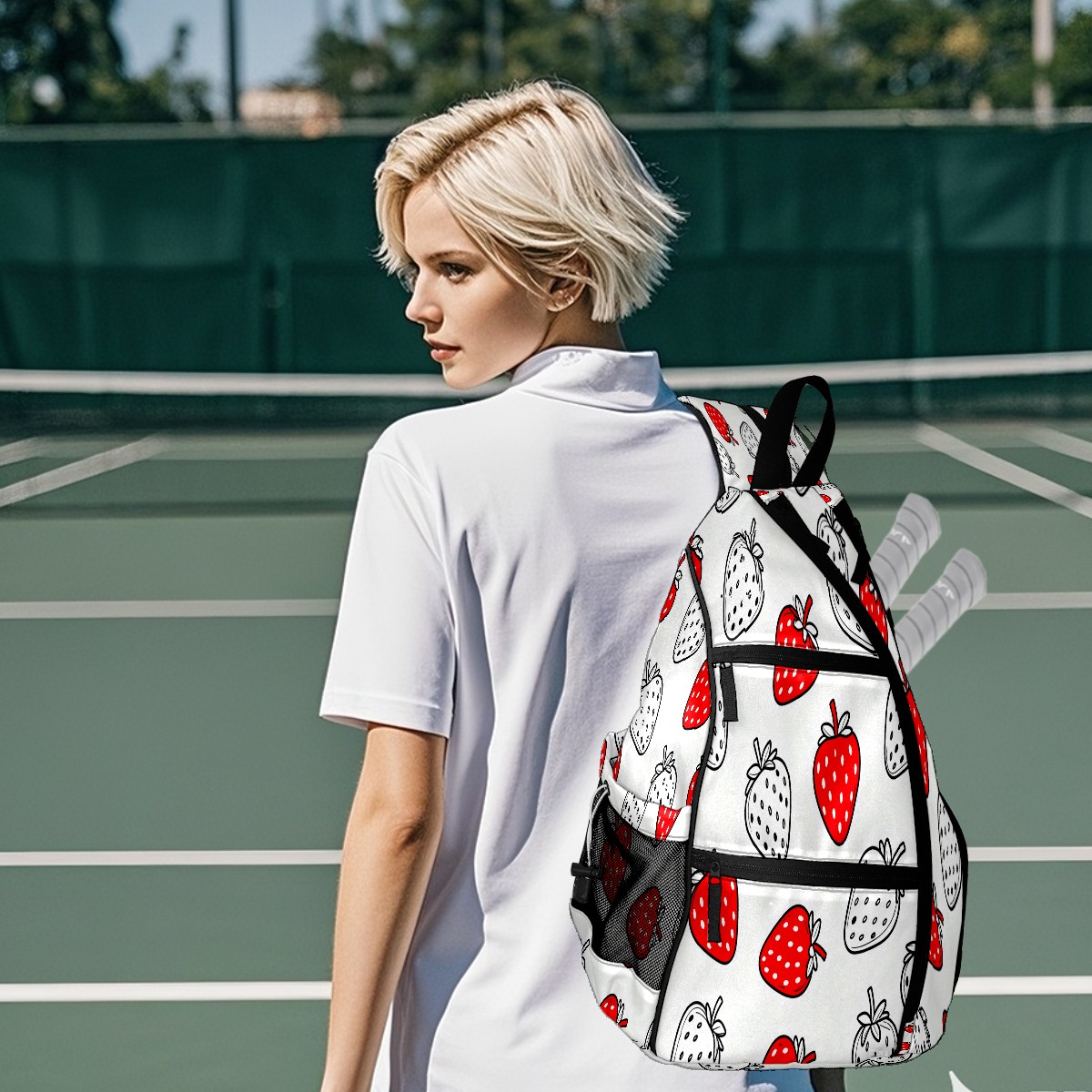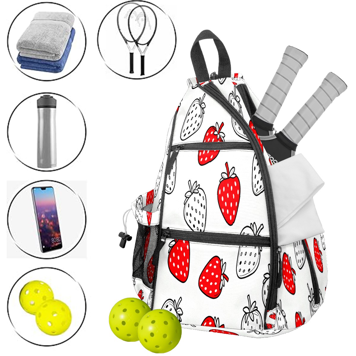 Pickleball Sling Bag for Women and Men - Backpack with Nylon Fabric/Woven Strap/Mesh Pocket/Fence Hook/Adjustable Bag Red White Strawberries