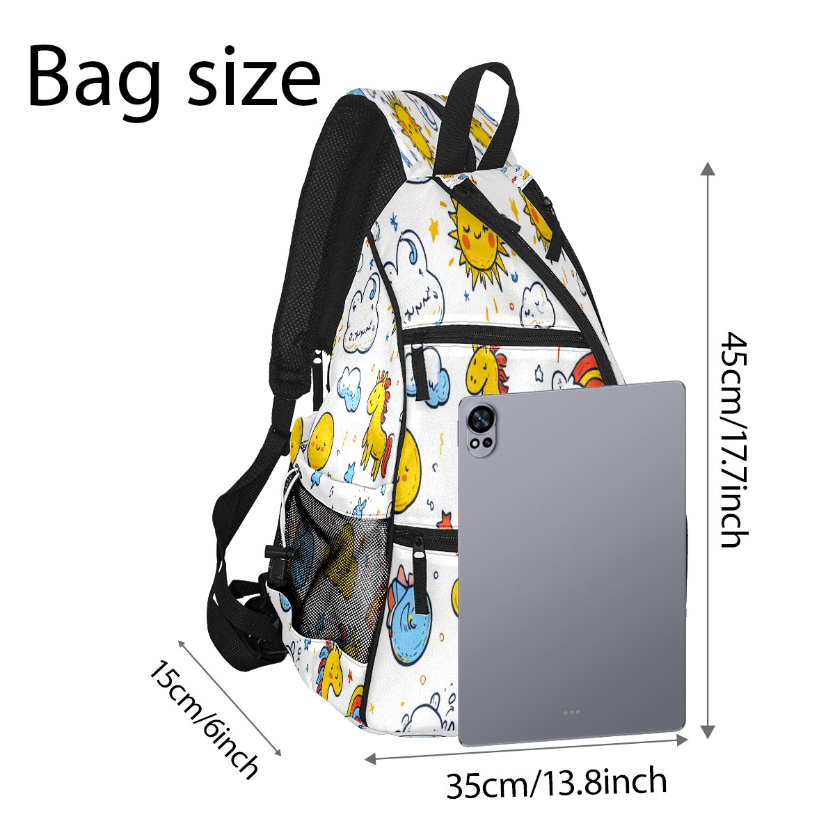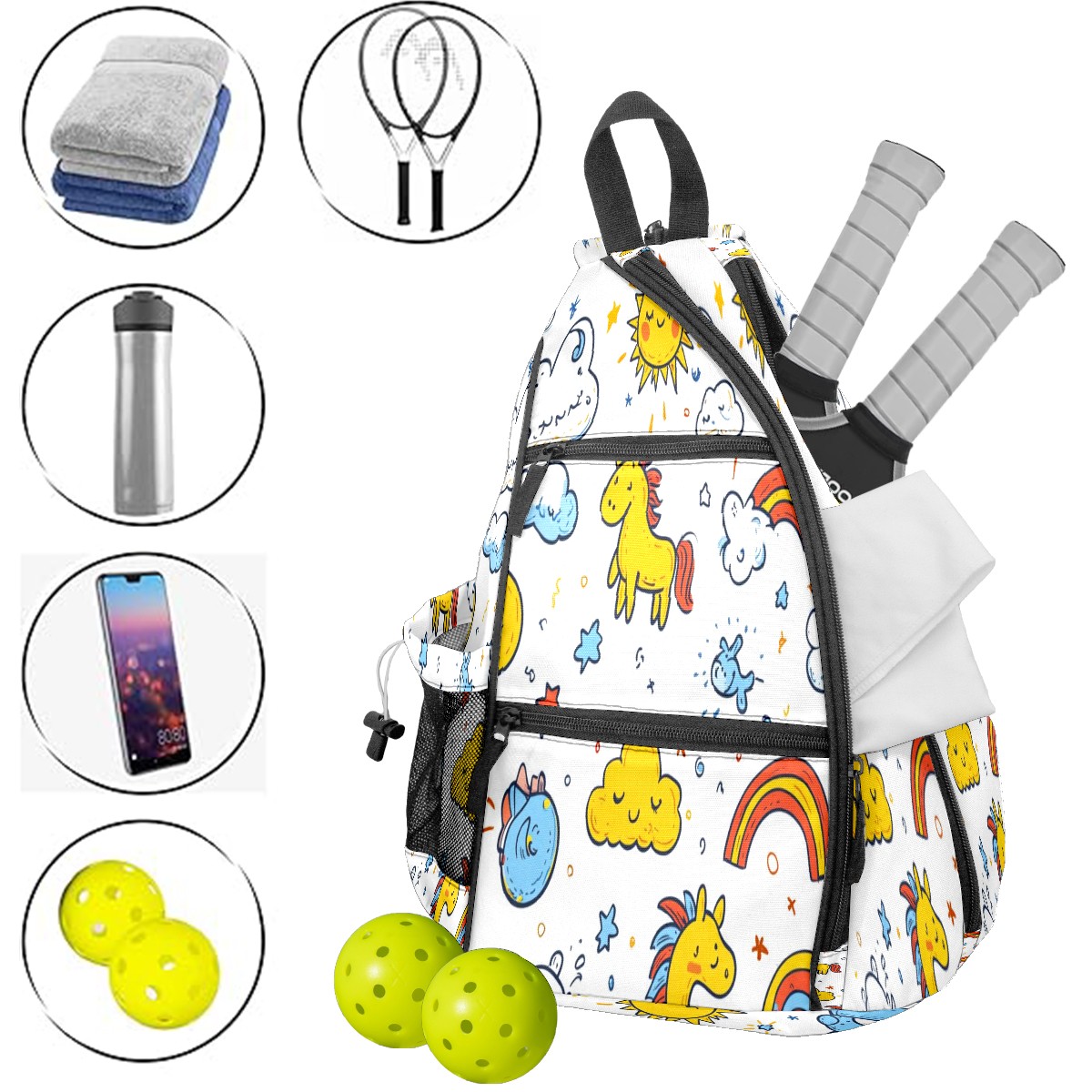 Pickleball Sling Bag for Women and Men - Backpack with Nylon Fabric/Woven Strap/Mesh Pocket/Fence Hook/Adjustable Bag Cartoon Weather, Animals And Rainbow Elements Pattern