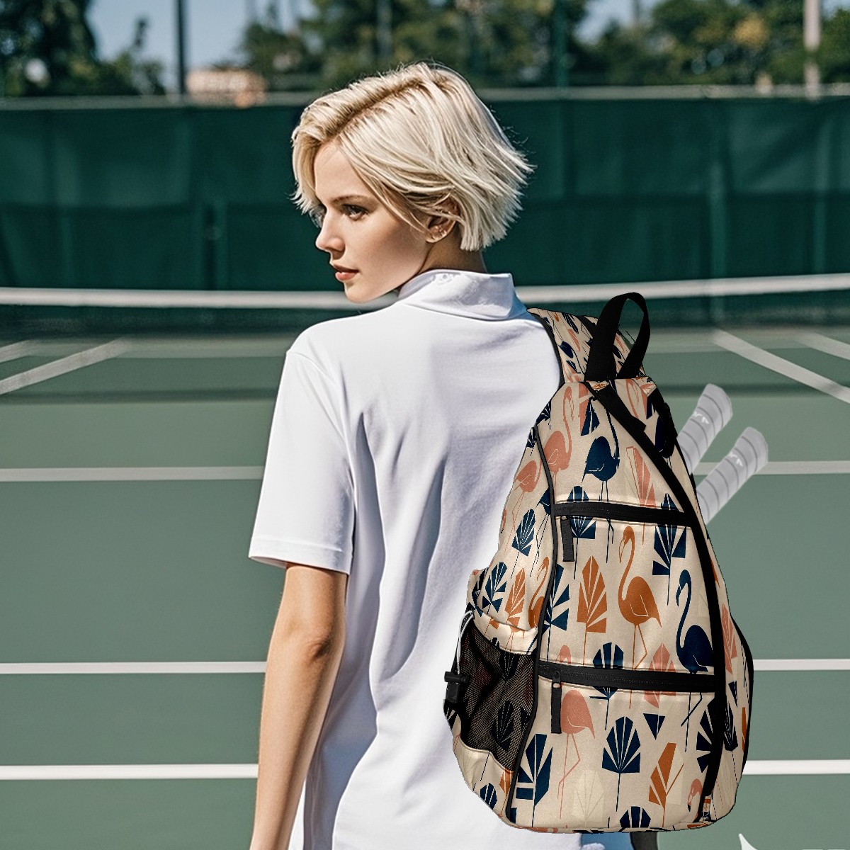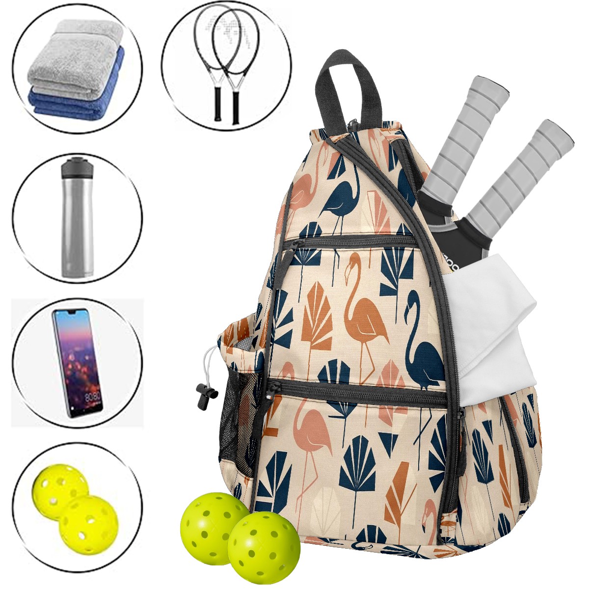 Pickleball Sling Bag for Women and Men - Backpack with Nylon Fabric/Woven Strap/Mesh Pocket/Fence Hook/Adjustable Bag Beige Flamingos Palms