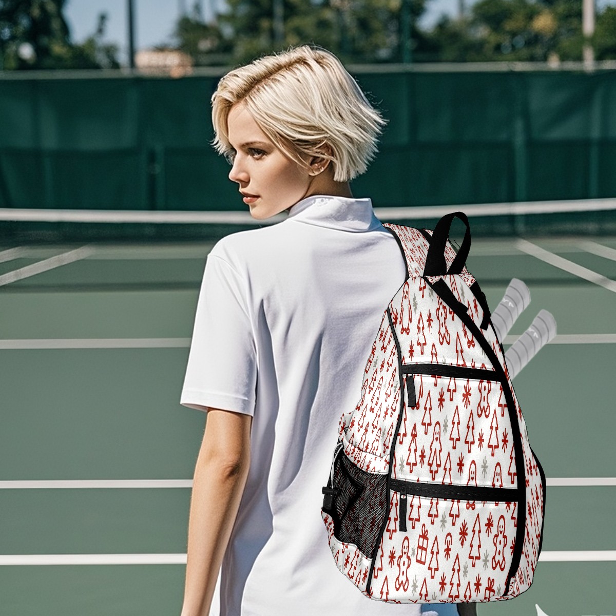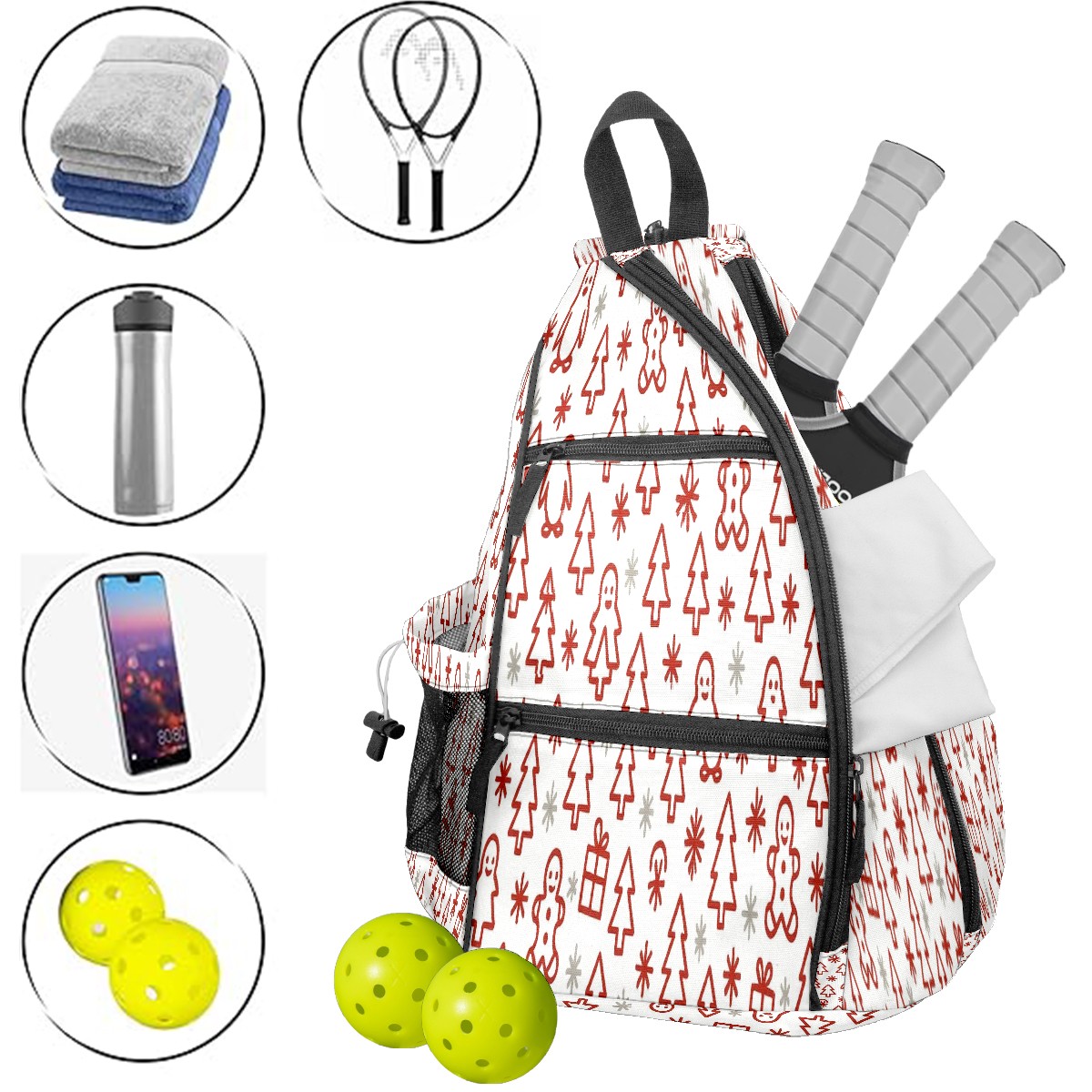 Pickleball Sling Bag for Women and Men - Backpack with Nylon Fabric/Woven Strap/Mesh Pocket/Fence Hook/Adjustable Bag Gingerbread SantaHat BrownRed Floral