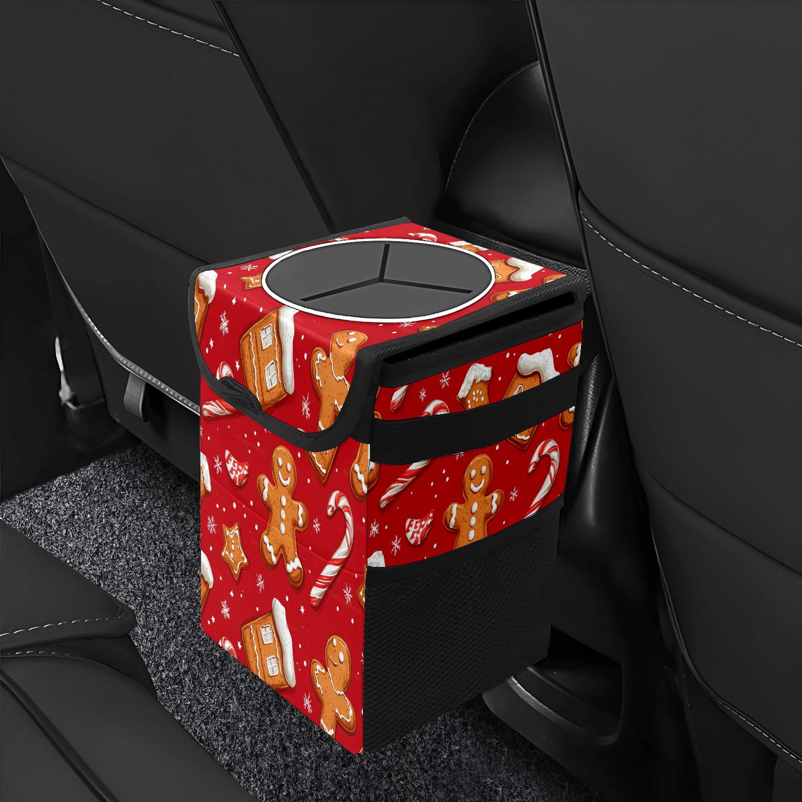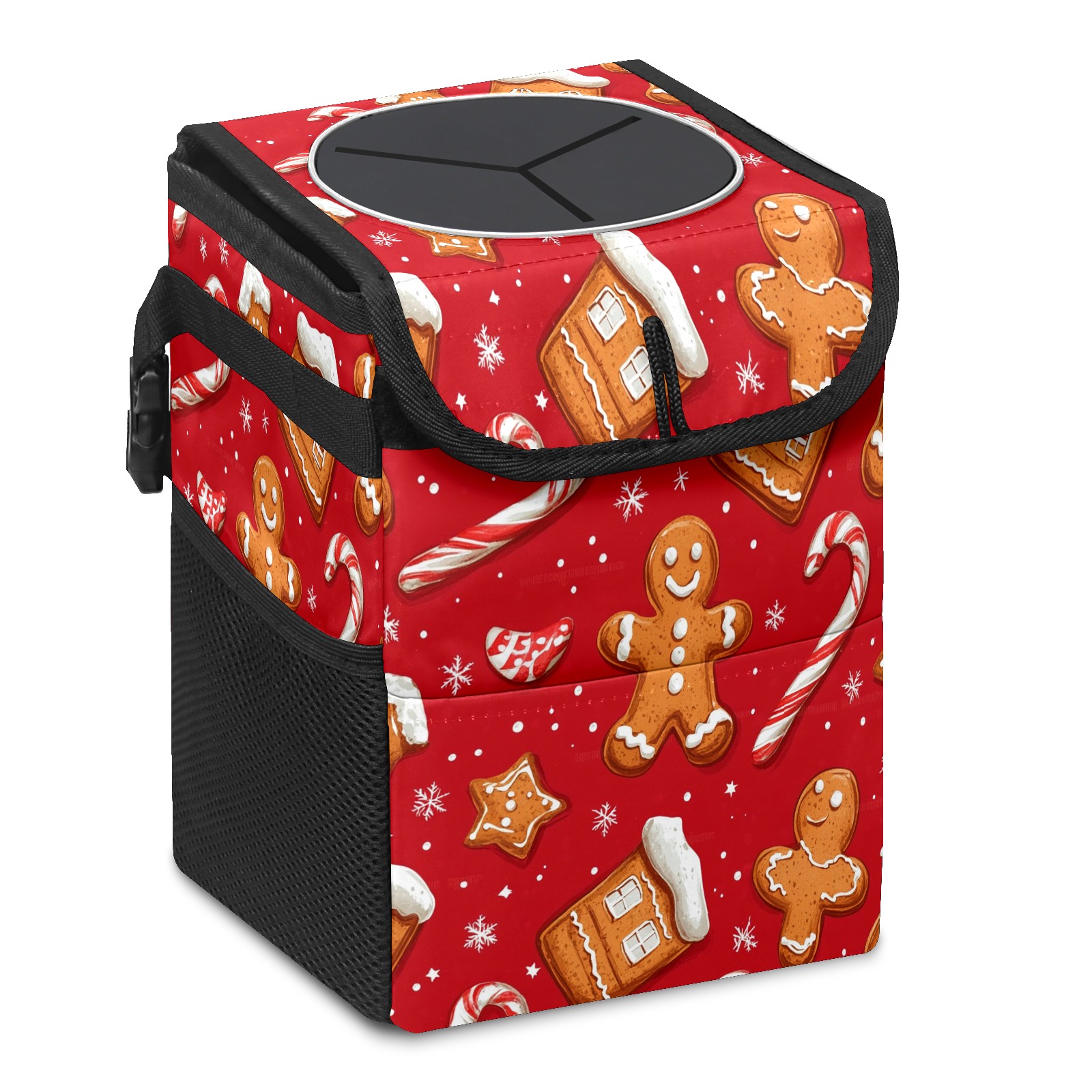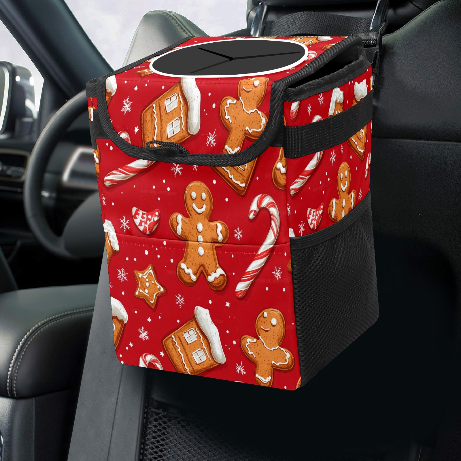 Car Trash Can with Lid, Small Portable Hanging Automotive Garbage Bin for Vehicles, Leakproof Waste Bag Container for SUV Truck Van Interior Auto Travel Road Trips(Cookies And Candy Cane)