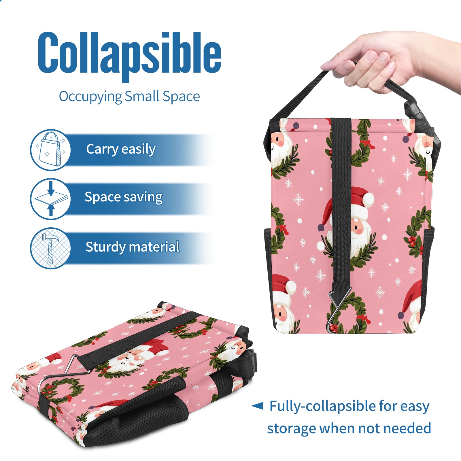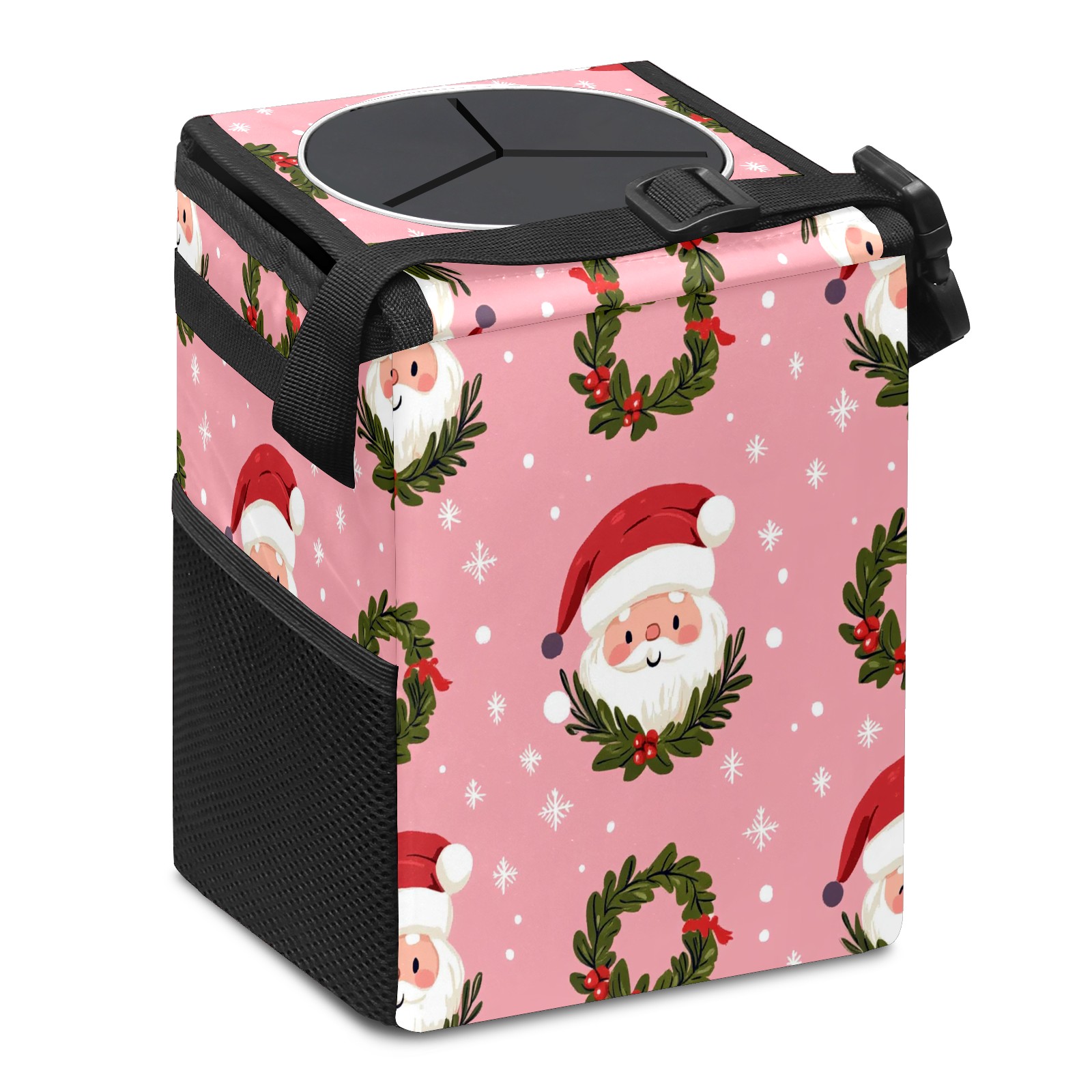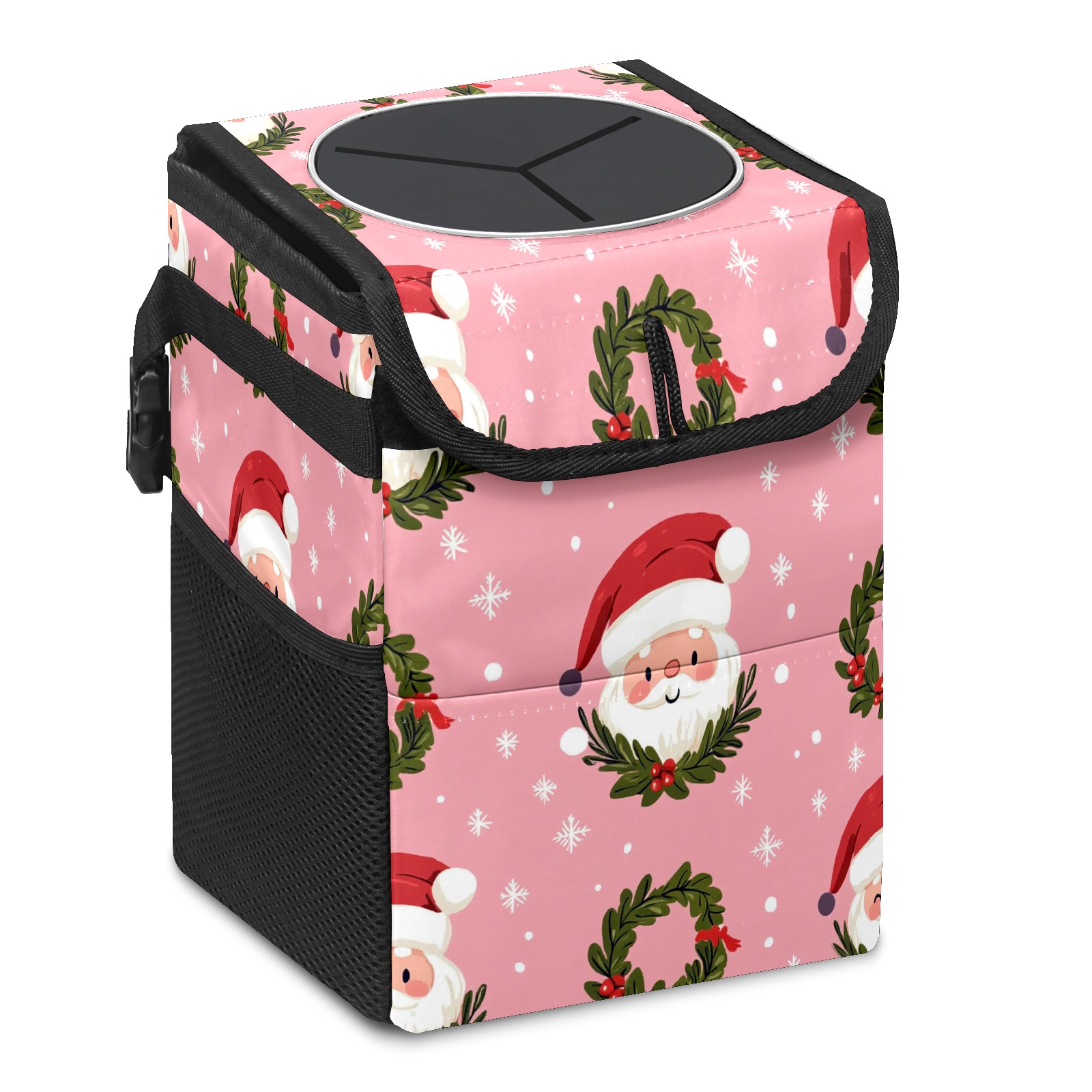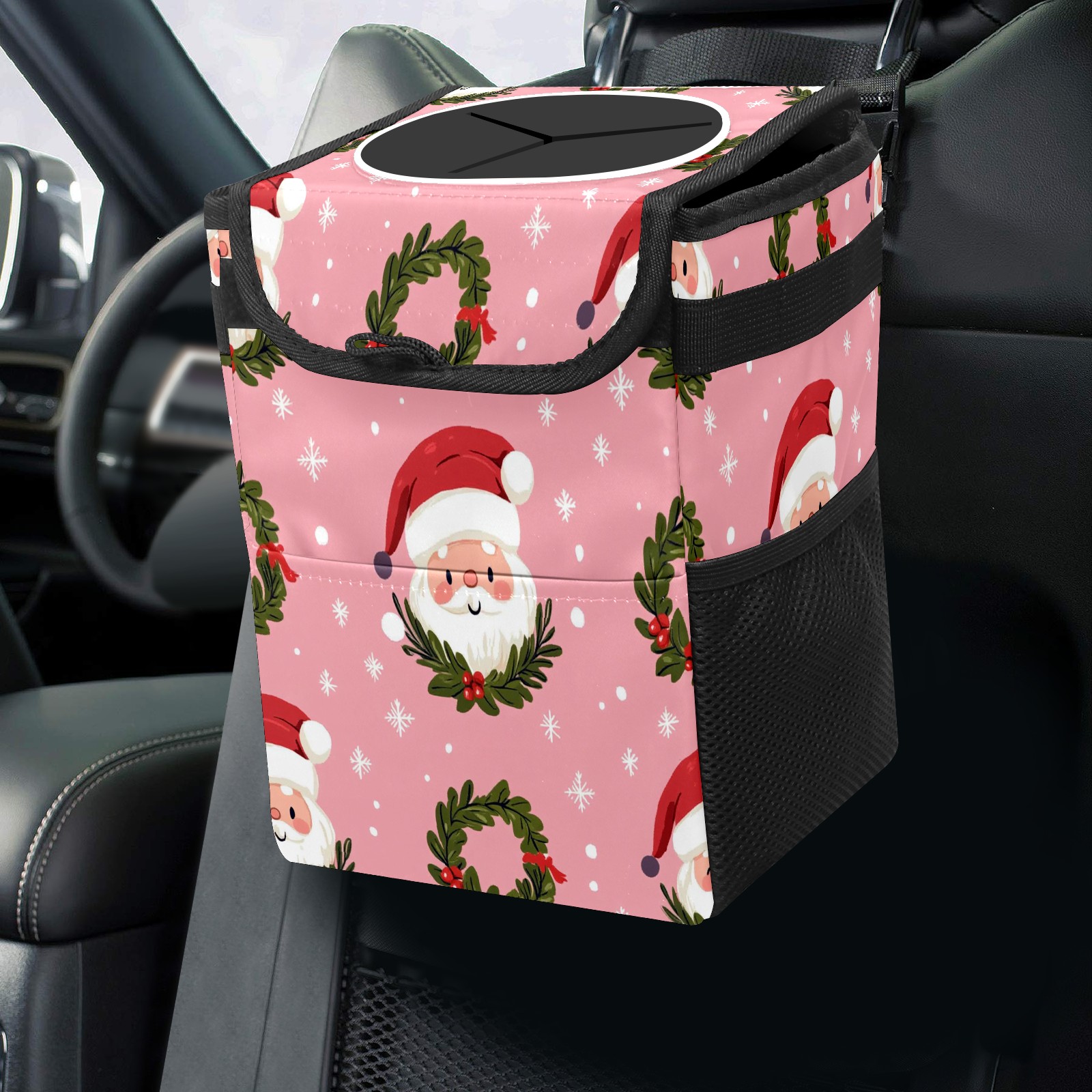 Car Trash Can with Lid, Small Portable Hanging Automotive Garbage Bin for Vehicles, Leakproof Waste Bag Container for SUV Truck Van Interior Auto Travel Road Trips(Cute Santa And Wreath)