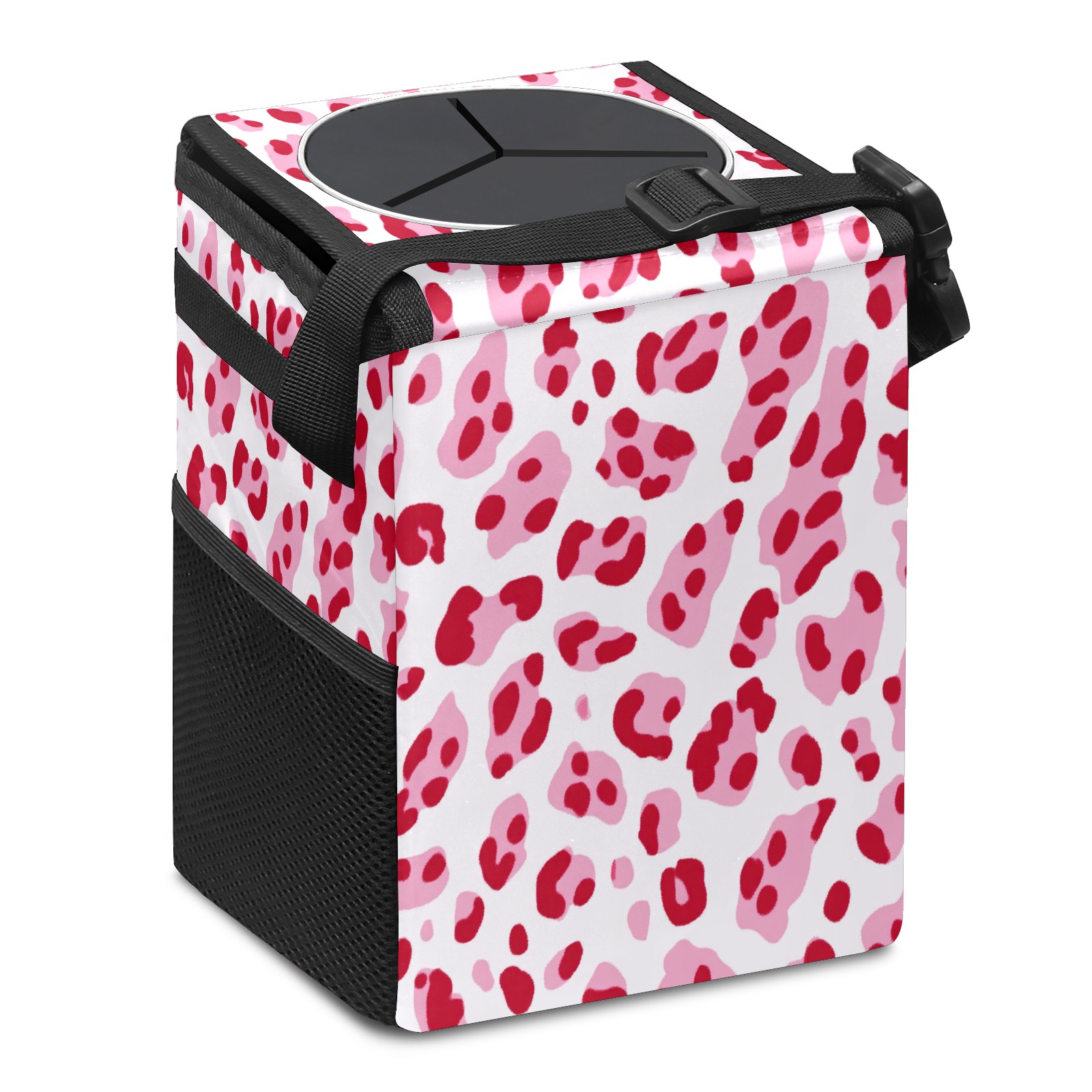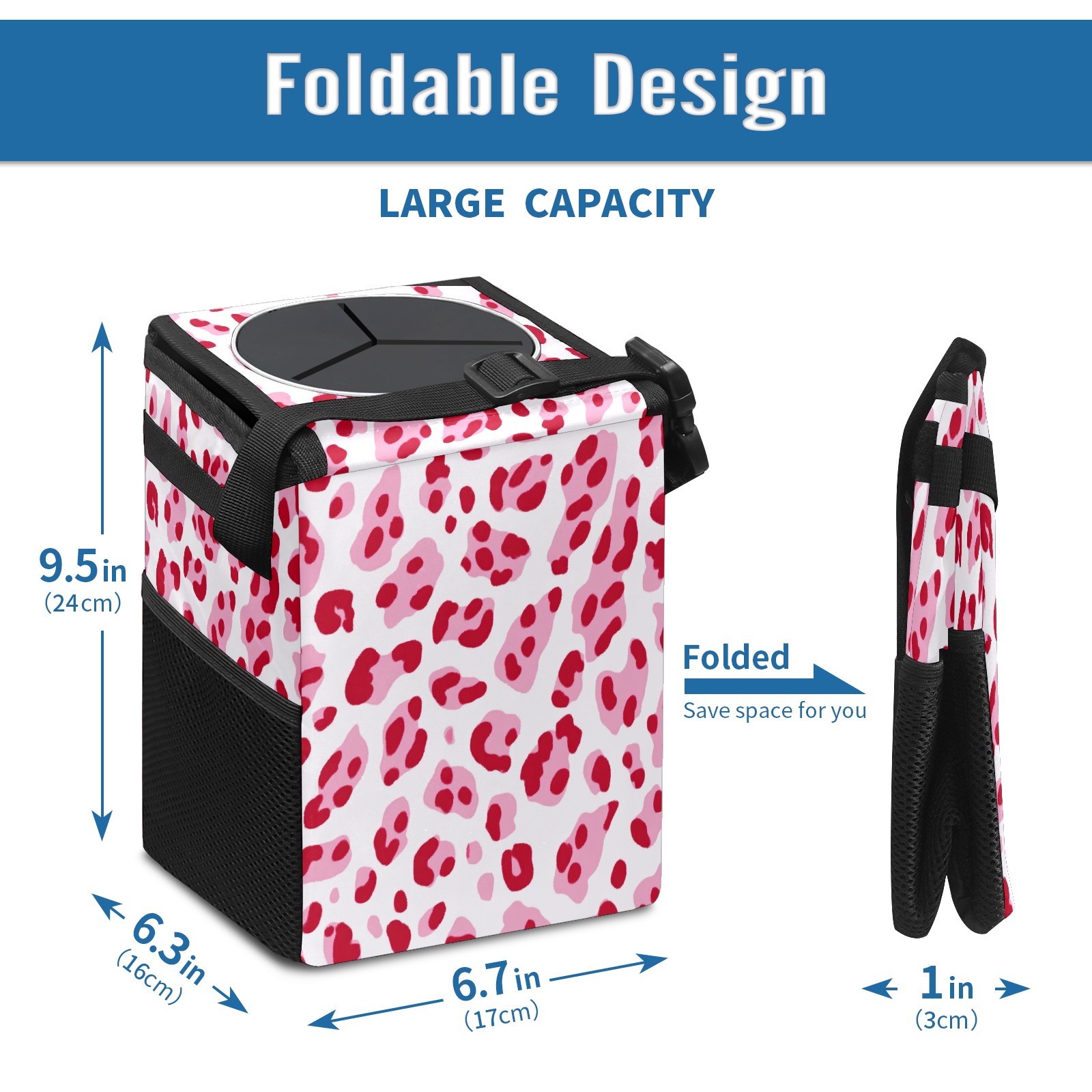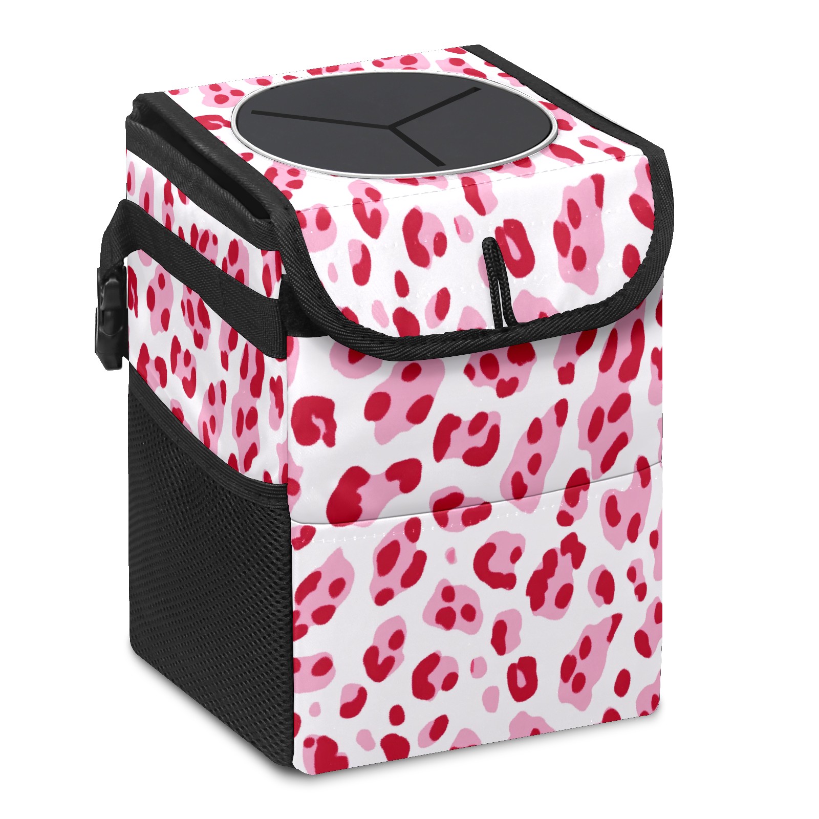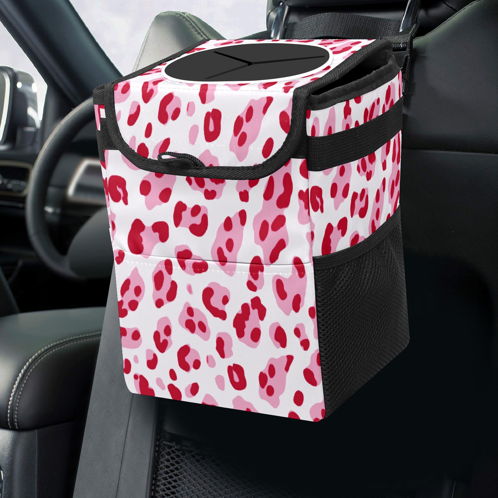 Car Trash Can with Lid, Small Portable Hanging Automotive Garbage Bin for Vehicles, Leakproof Waste Bag Container for SUV Truck Van Interior Auto Travel Road Trips(Pink Leopard)
