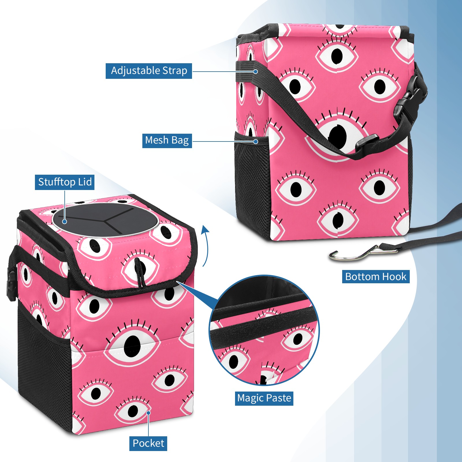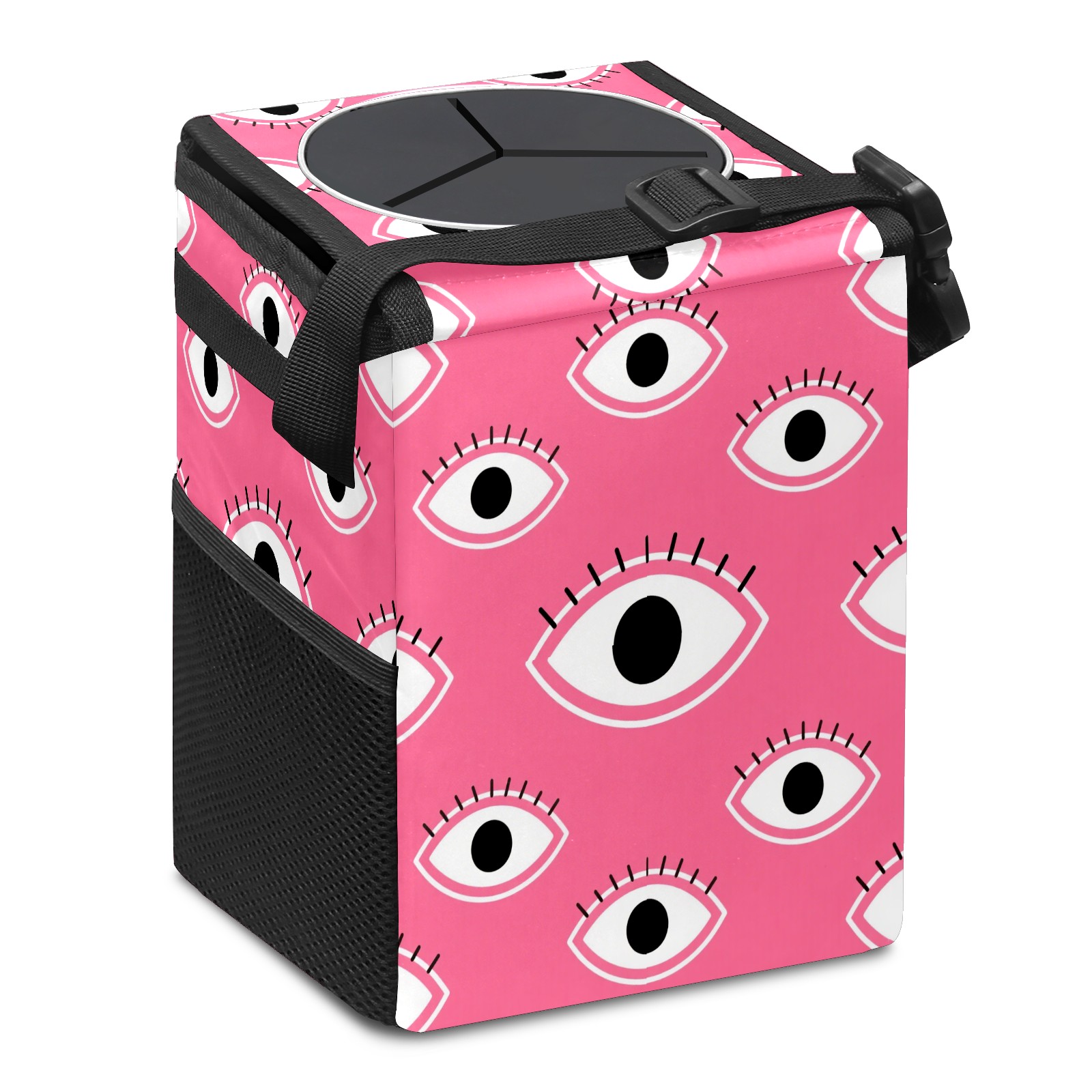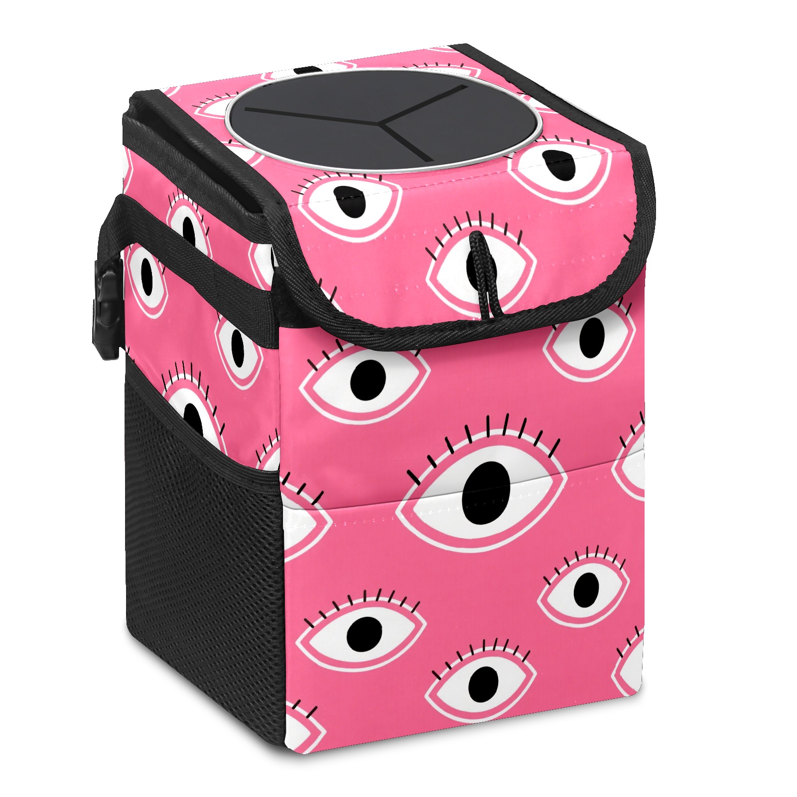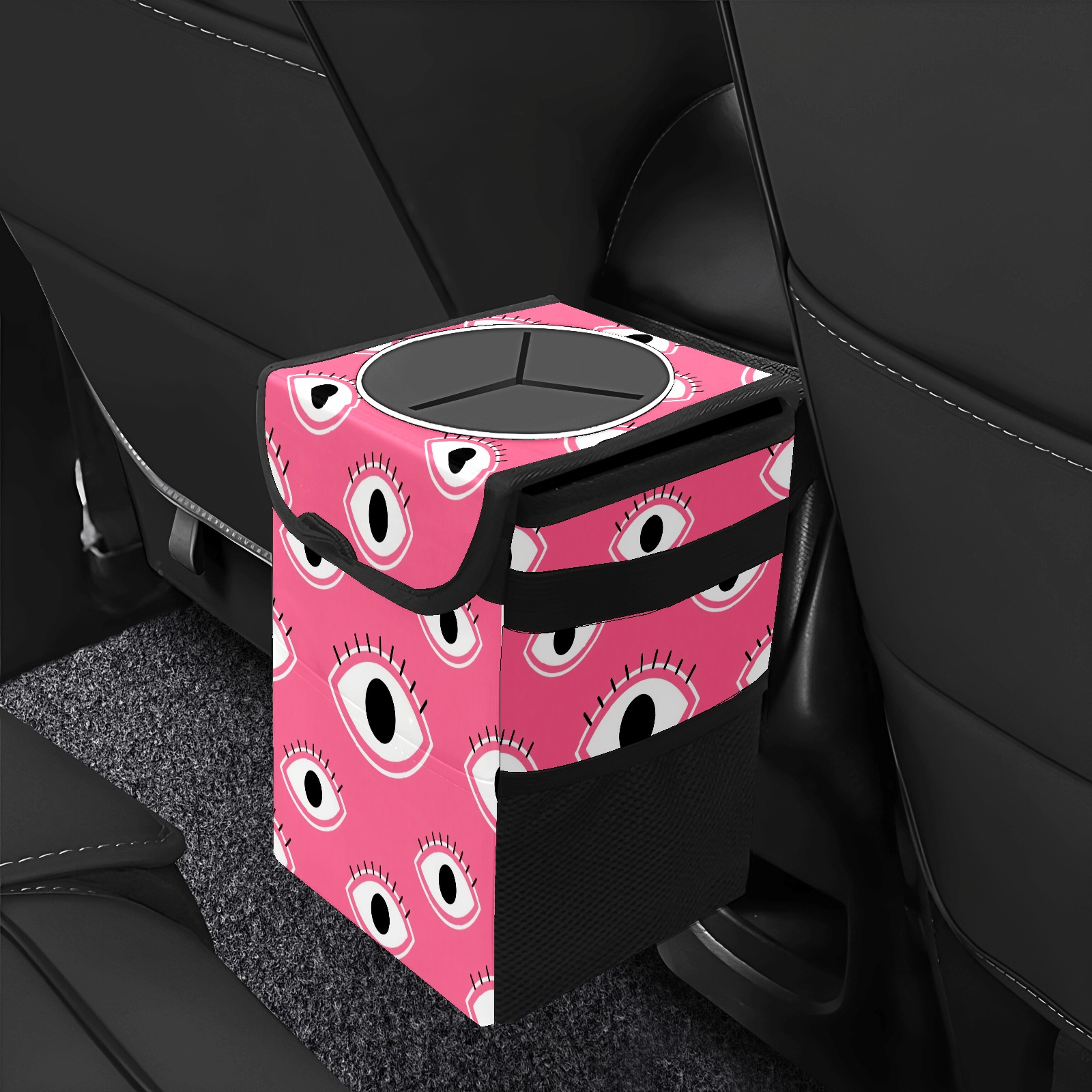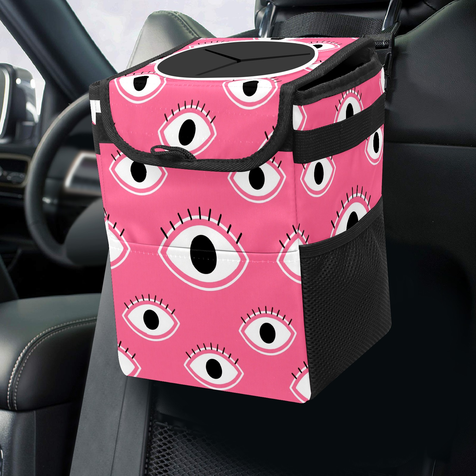 Car Trash Can with Lid, Small Portable Hanging Automotive Garbage Bin for Vehicles, Leakproof Waste Bag Container for SUV Truck Van Interior Auto Travel Road Trips(Pink Eyes)