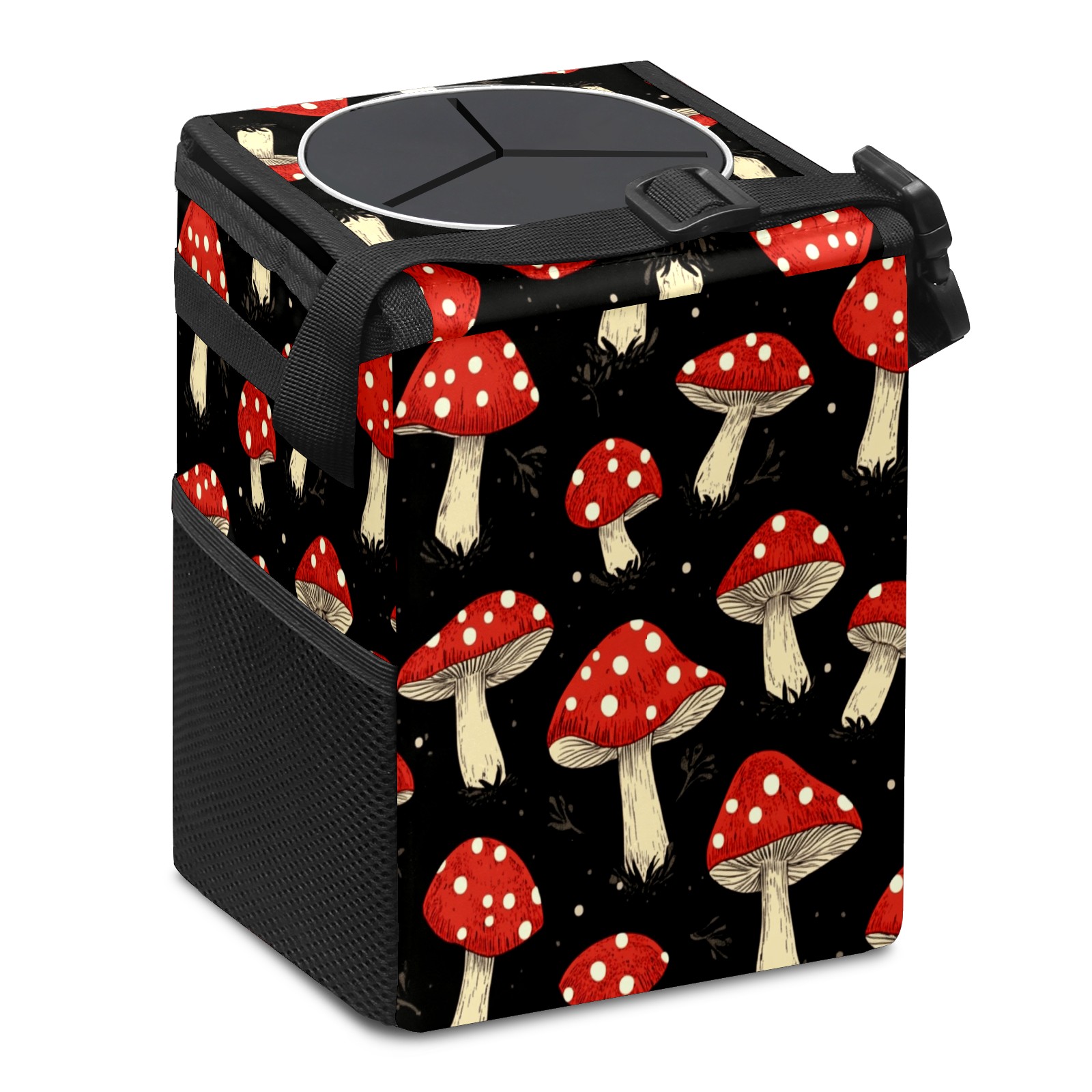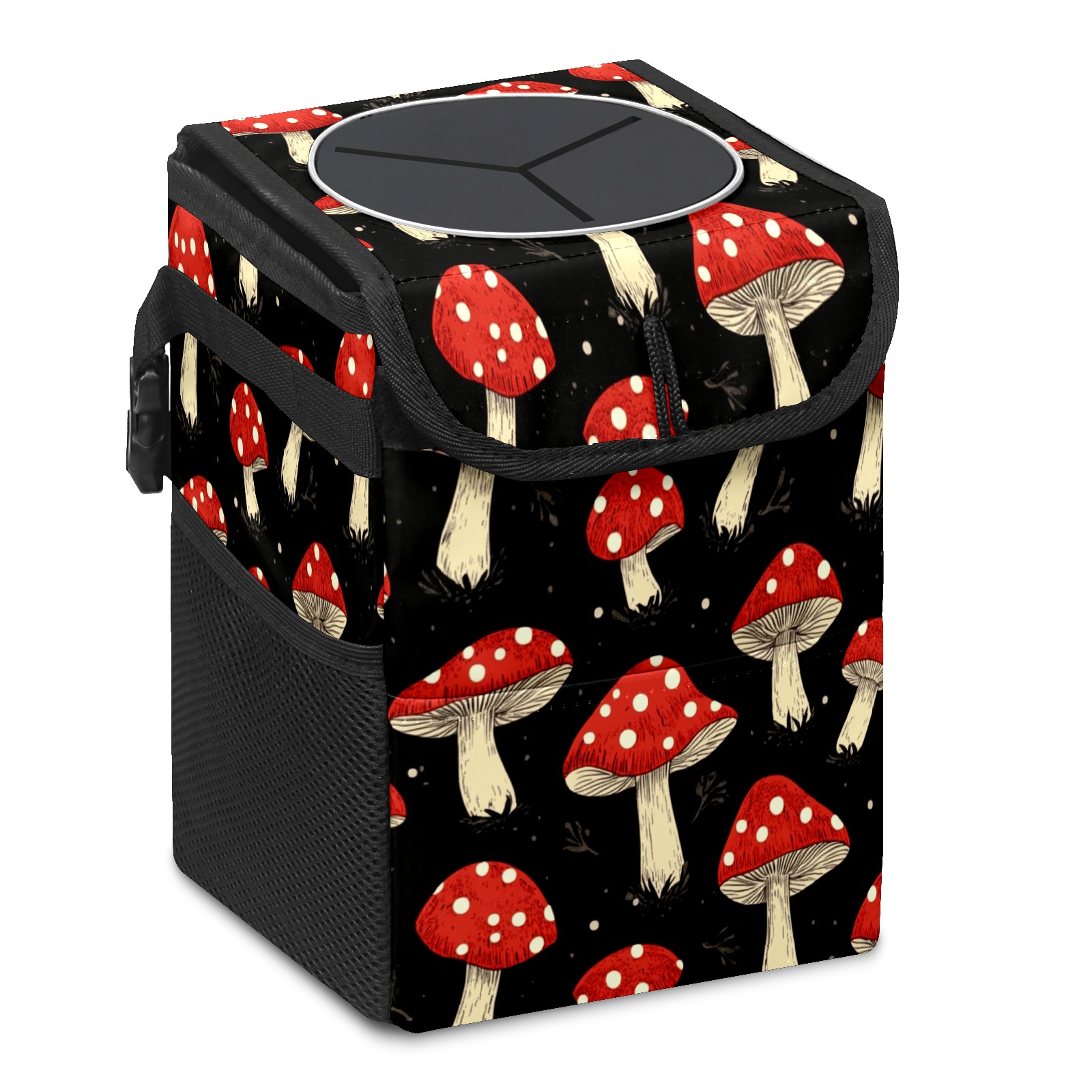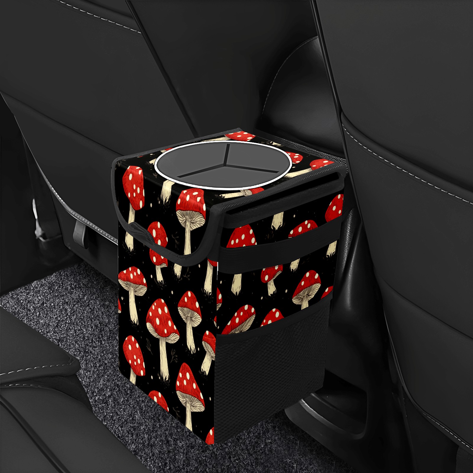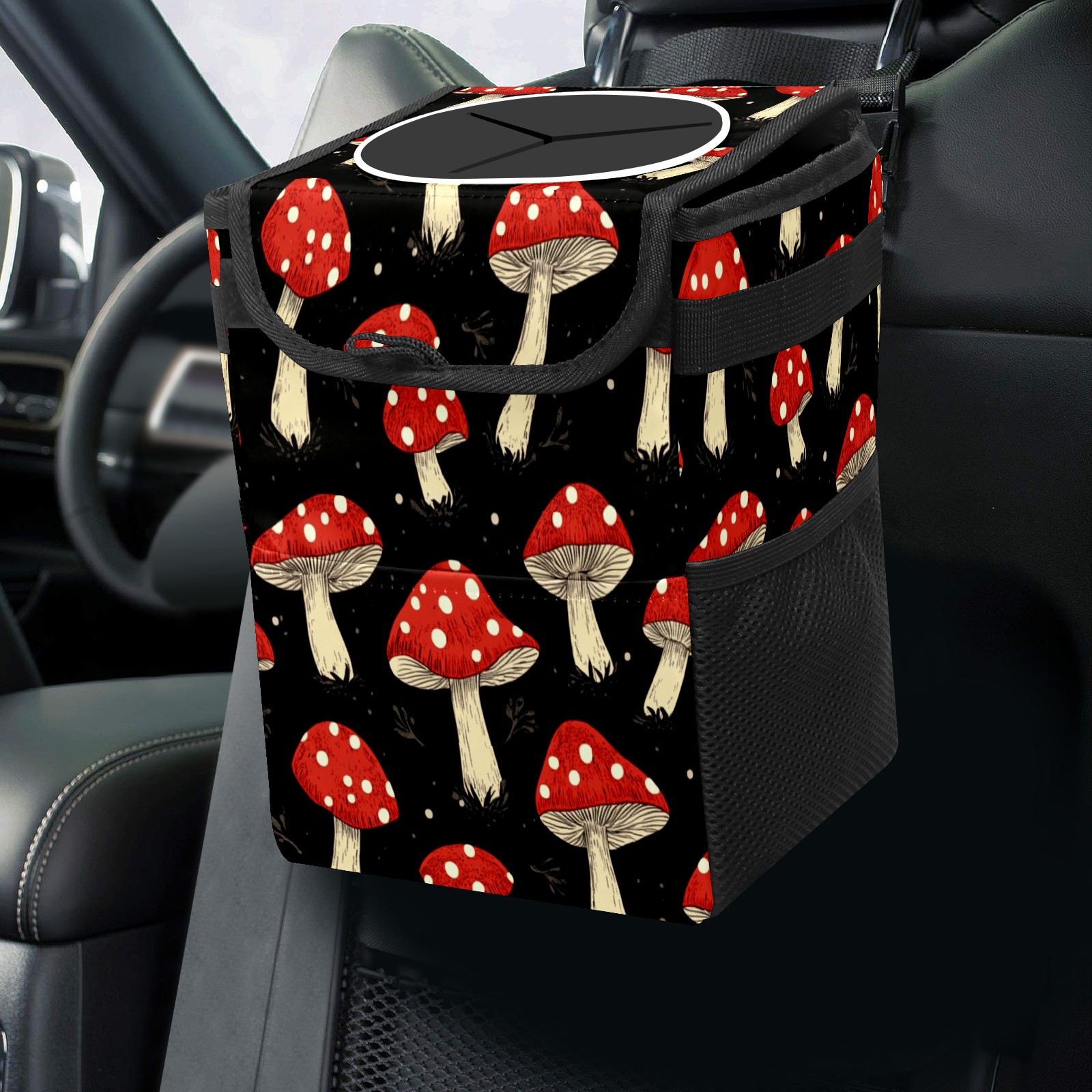 Car Trash Can with Lid, Small Portable Hanging Automotive Garbage Bin for Vehicles, Leakproof Waste Bag Container for SUV Truck Van Interior Auto Travel Road Trips(Red Mushrooms)