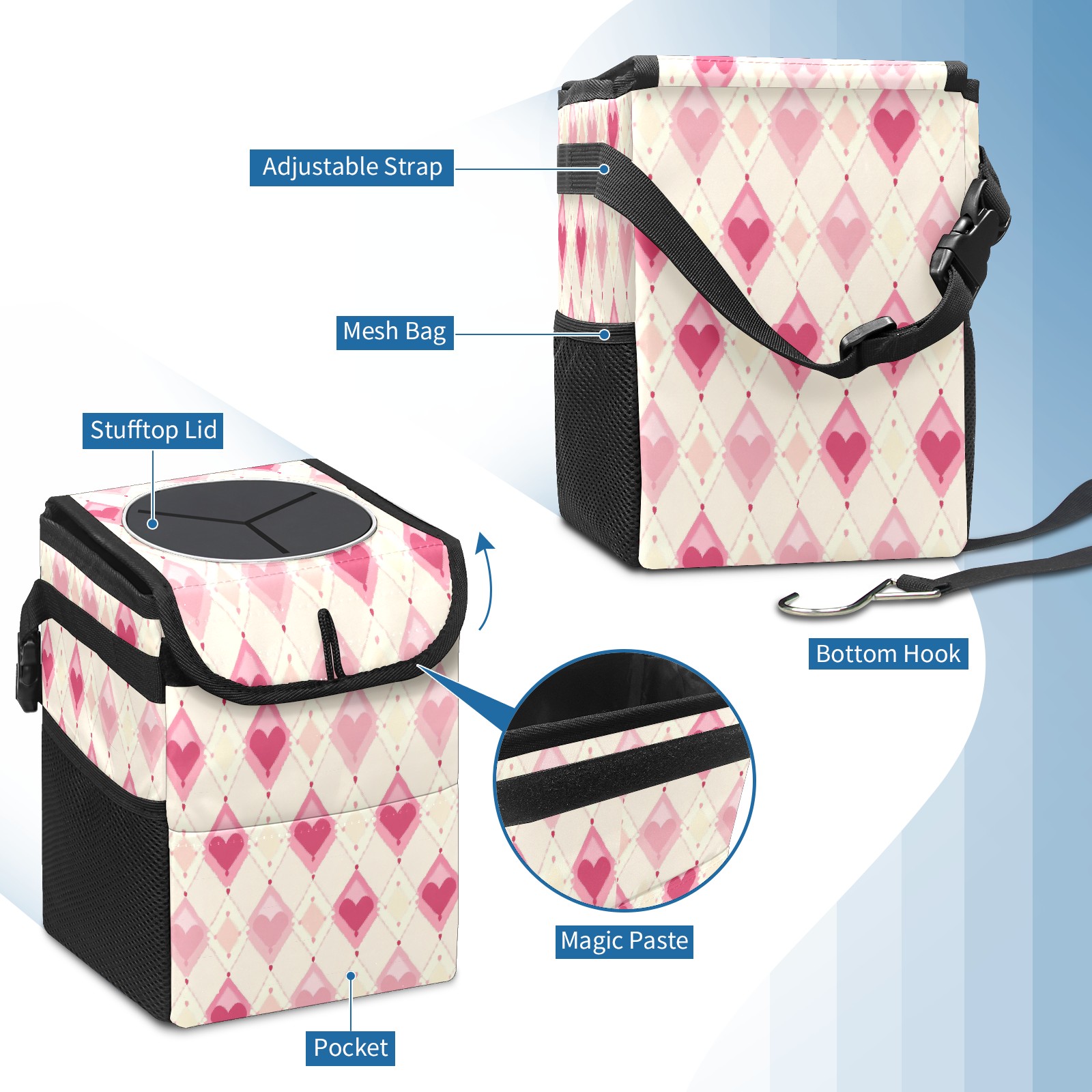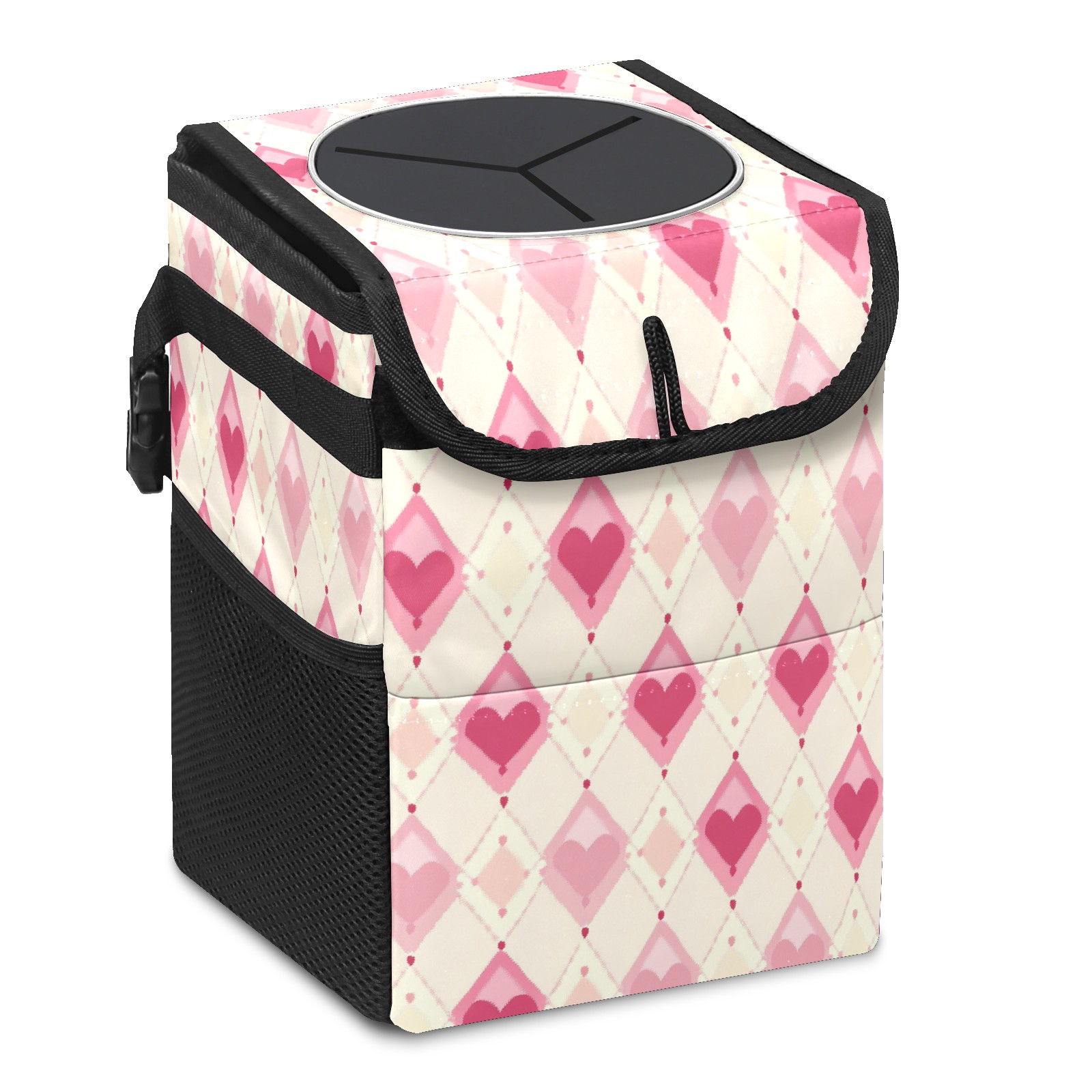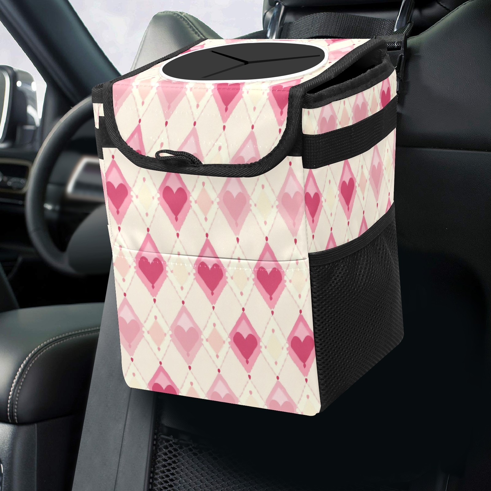 Car Trash Can with Lid, Small Portable Hanging Automotive Garbage Bin for Vehicles, Leakproof Waste Bag Container for SUV Truck Van Interior Auto Travel Road Trips(Pink And White Diamond)